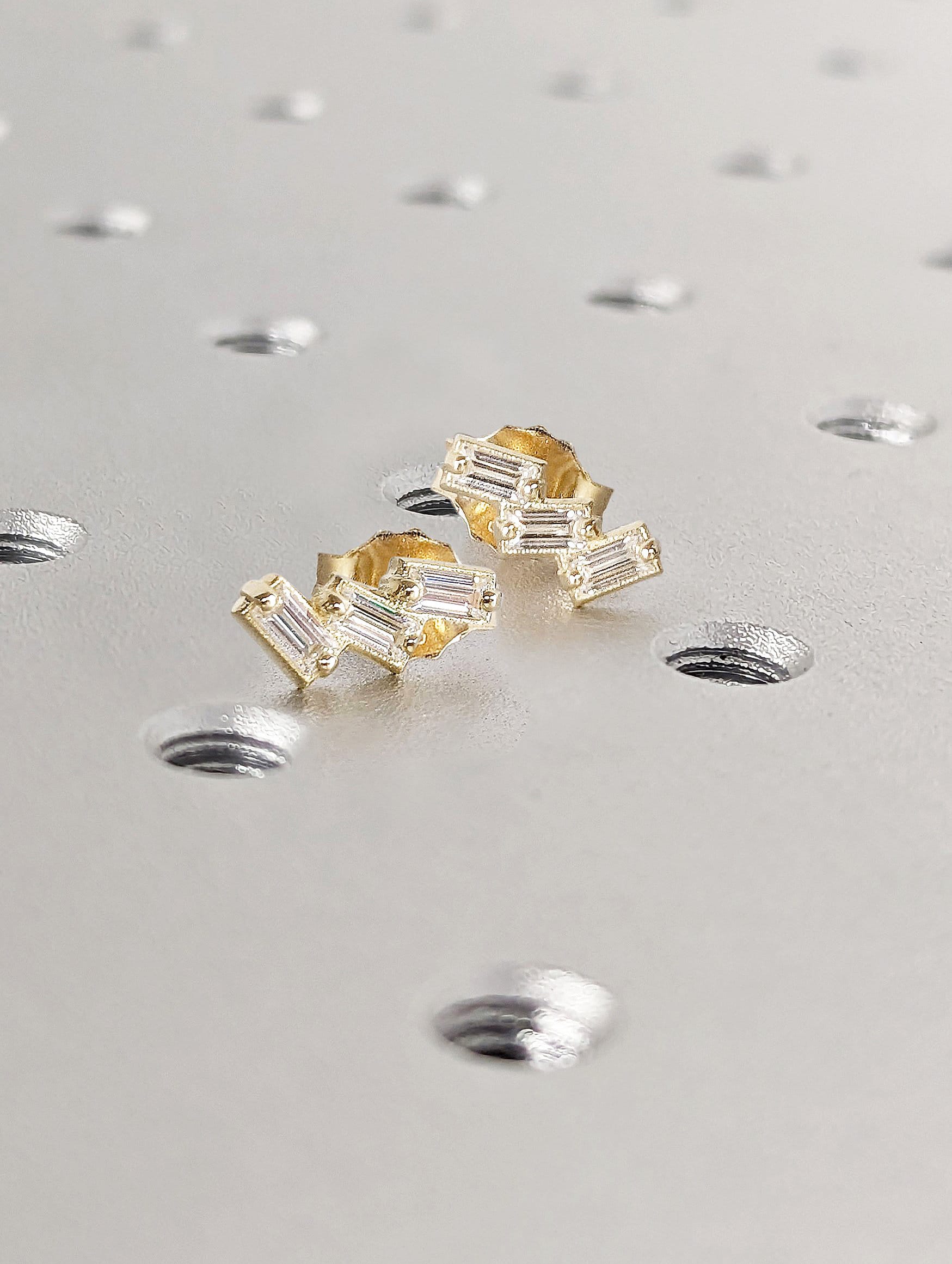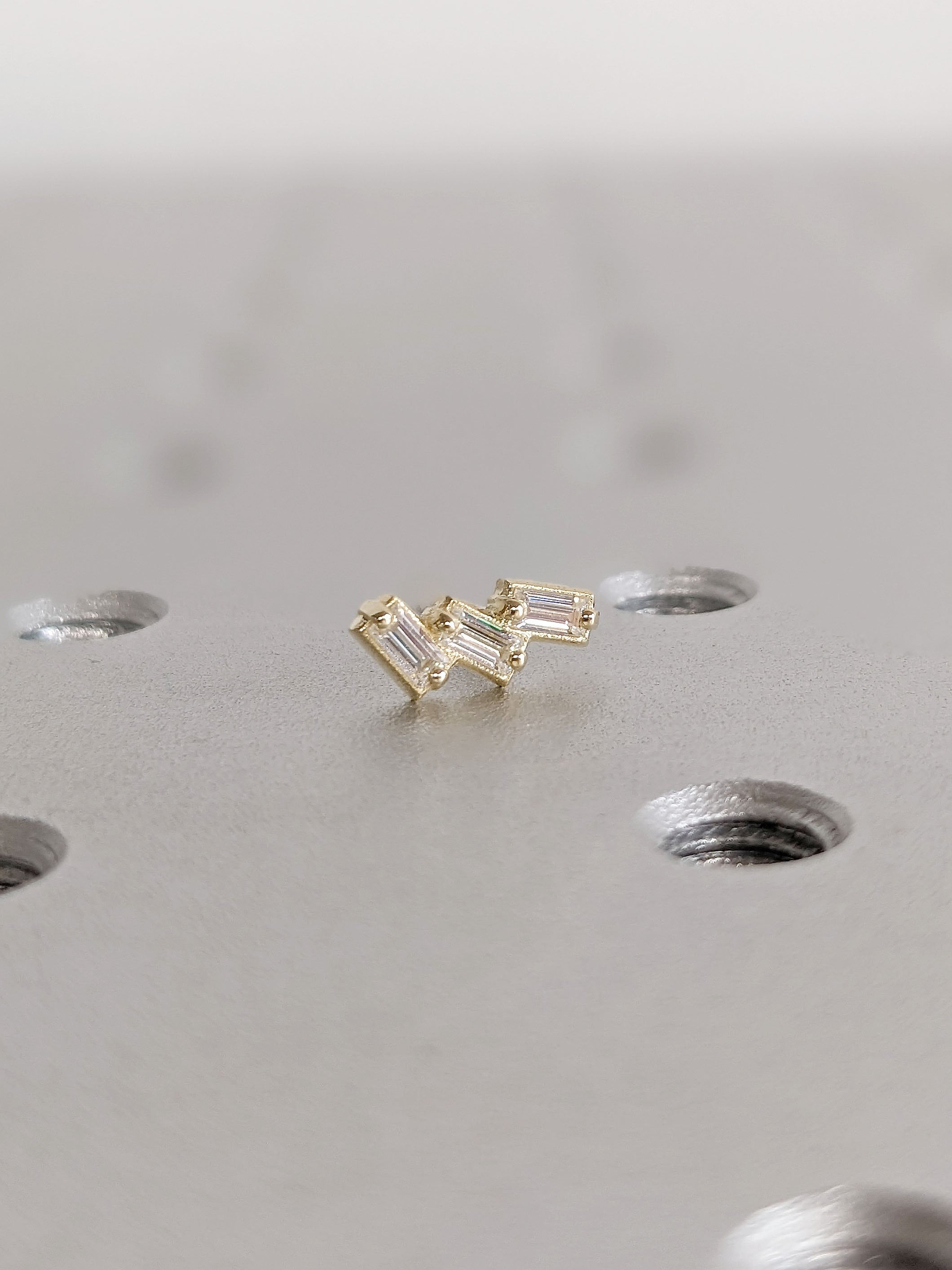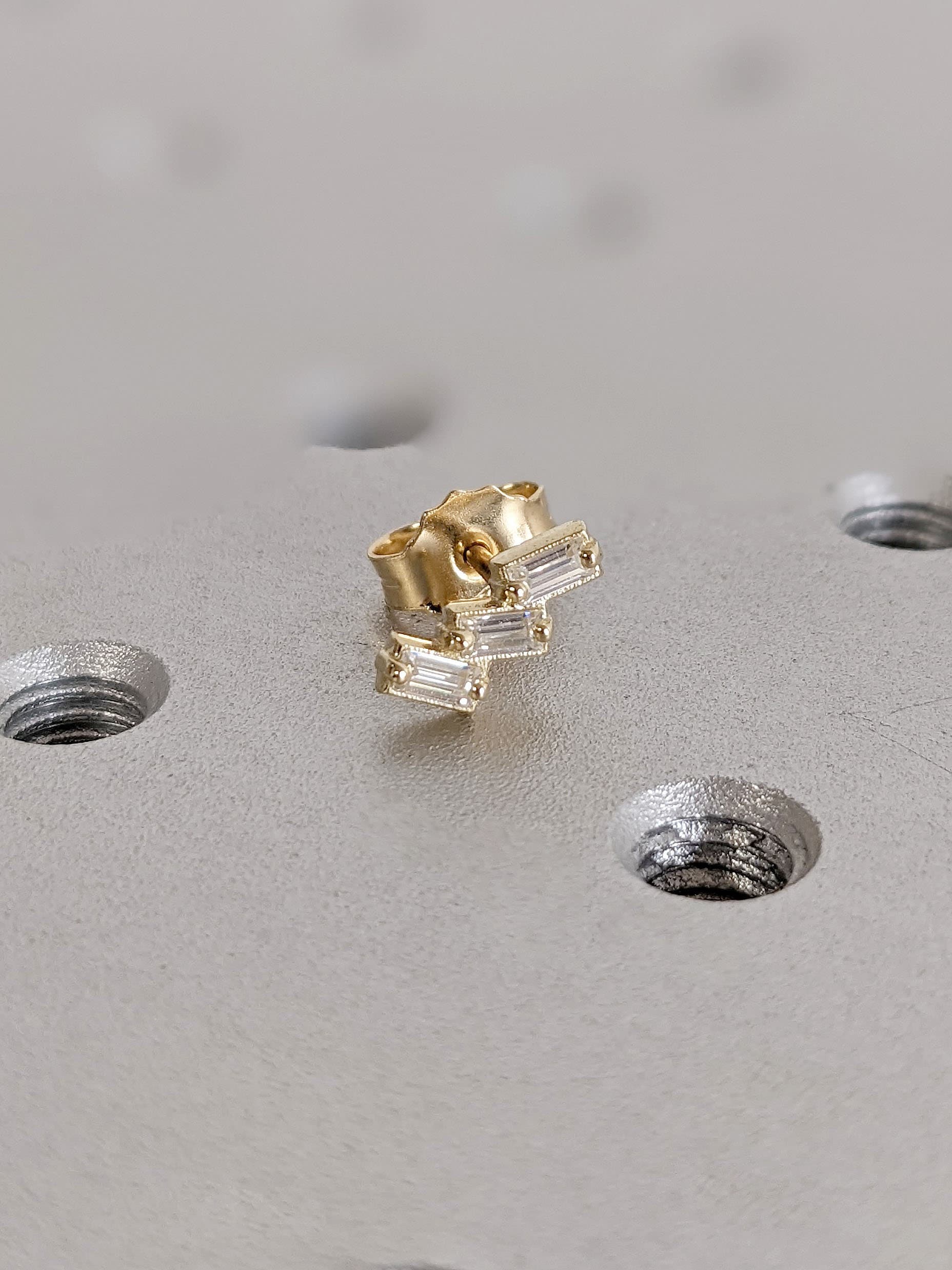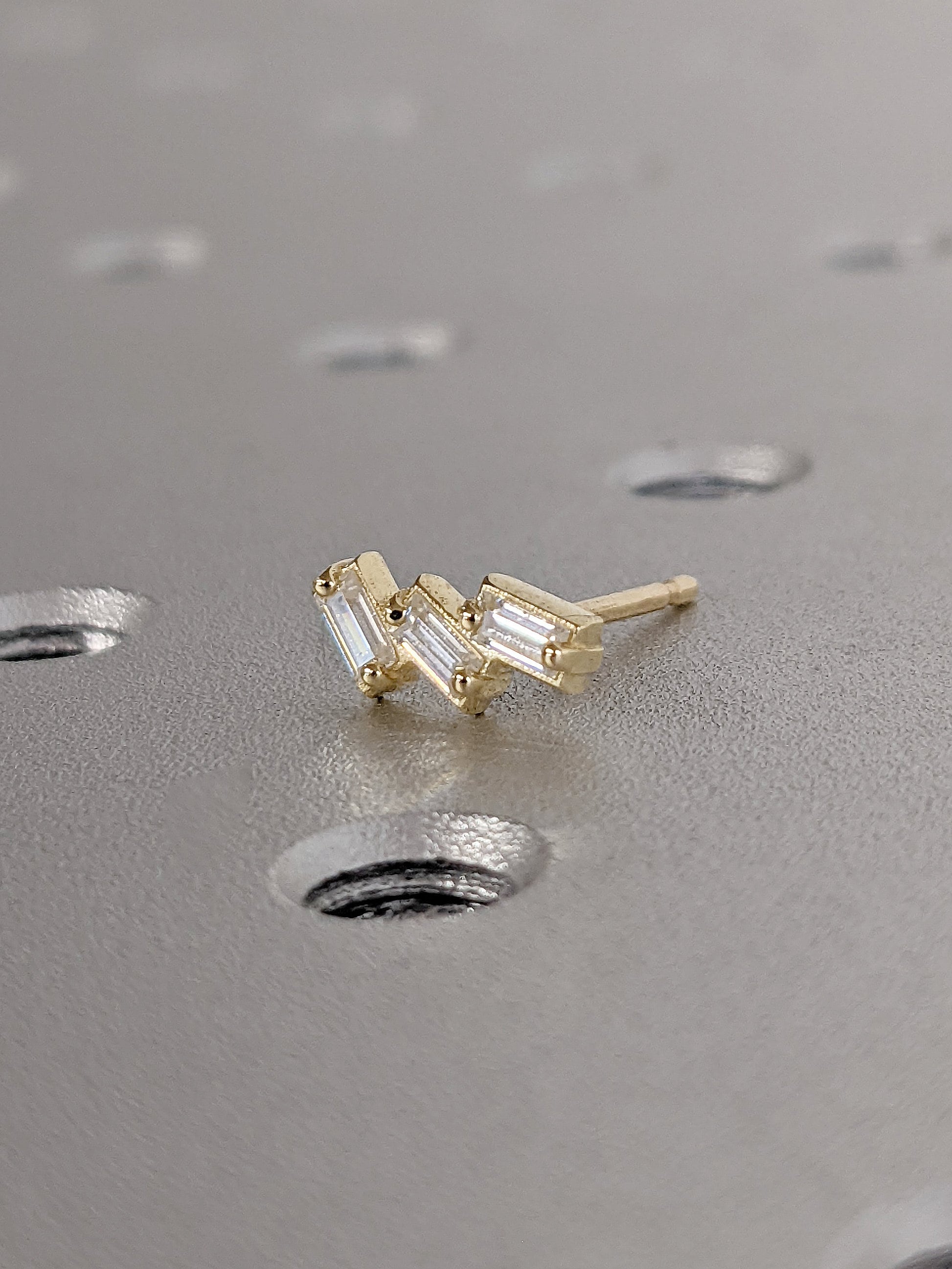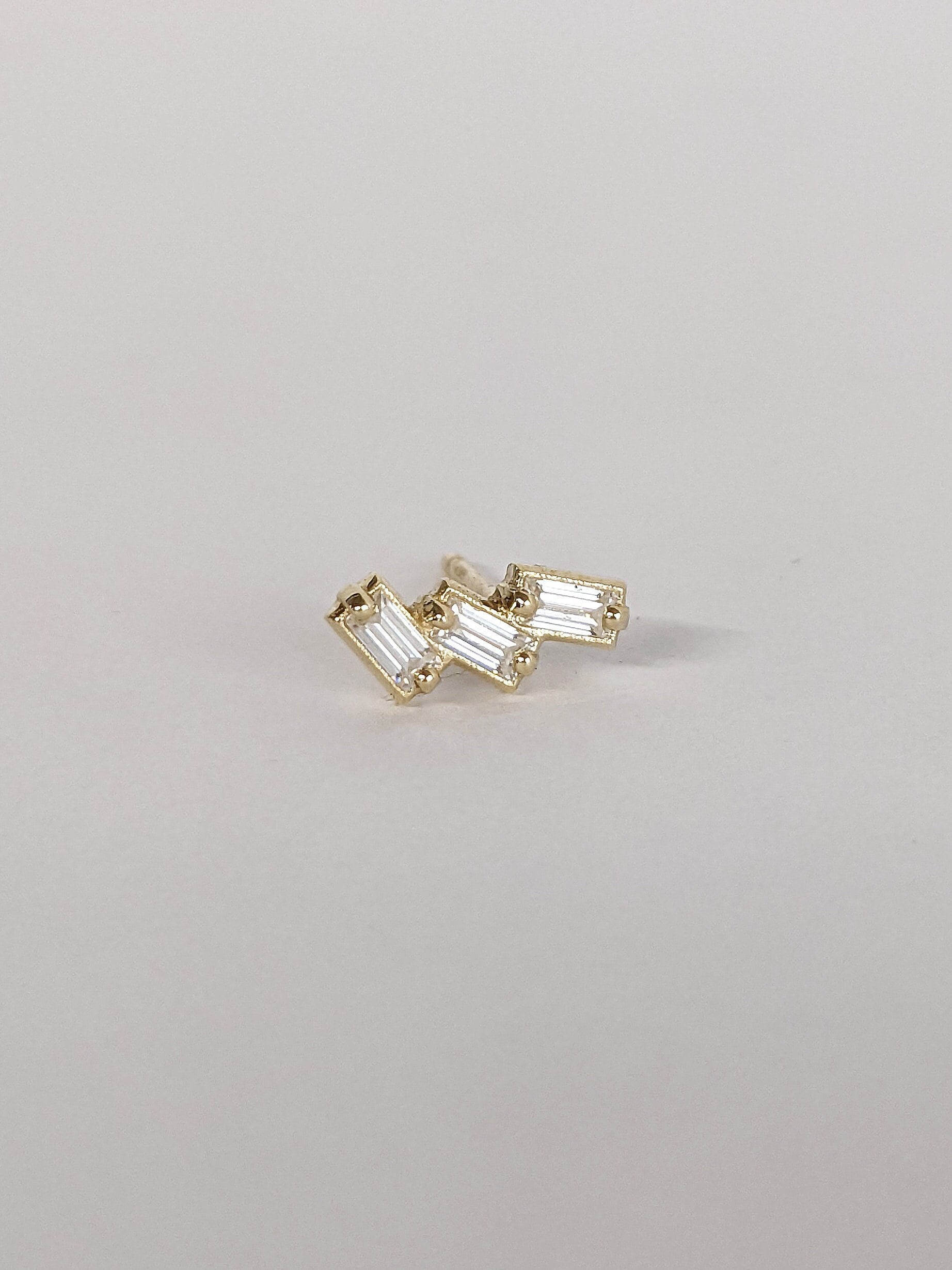 Elevate your style with our modern everyday wear, three-stone solid gold stud earrings. Featuring a dainty cluster of baguette cut diamonds, these earrings effortlessly combine classic charm with modern sophistication. Whether you opt for a single earring or a pair, this minimalist statement piece is a great addition to your jewelry collection.