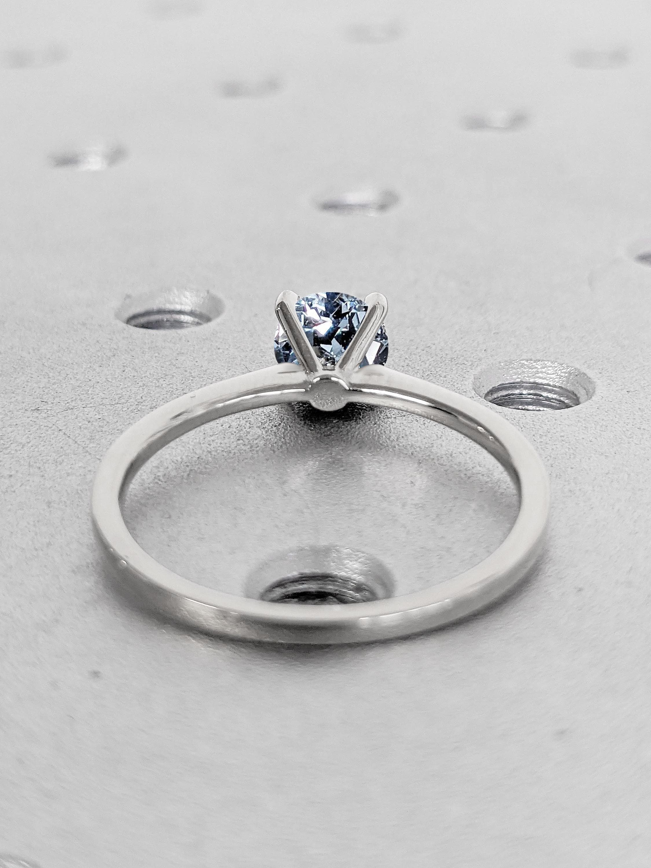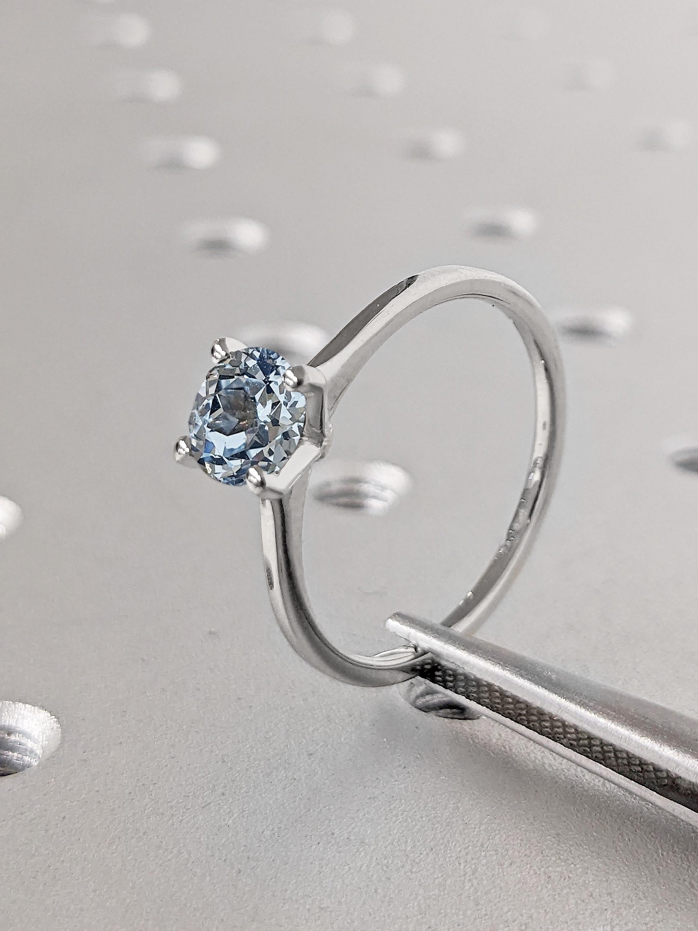 This round cut Lab Aquamarine solitaire ring features a sleek four-prong setting with a minimalist band. Its serene blue hue and clean design make it a timeless piece that embodies calm elegance and modern sophistication.