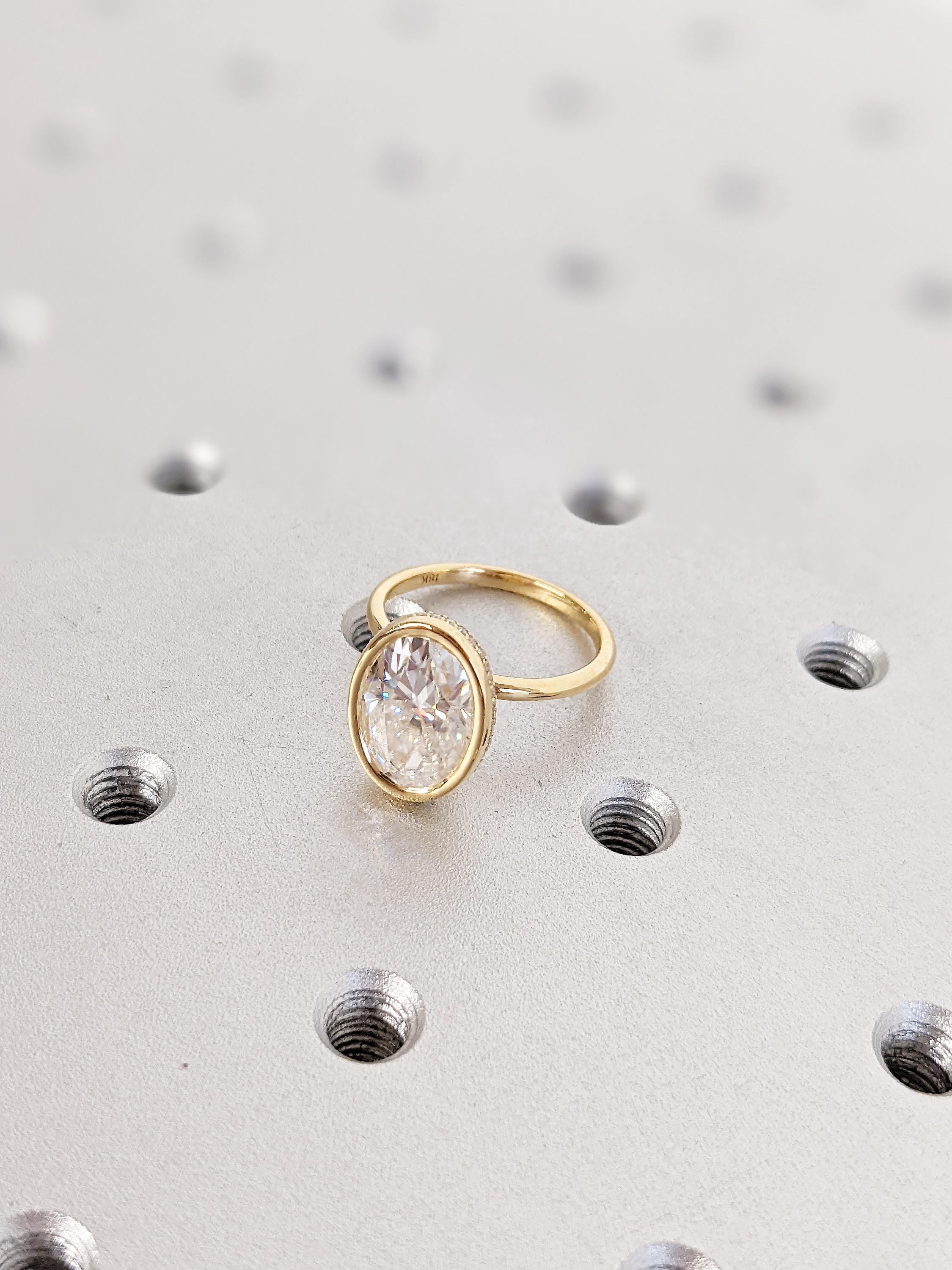 This Lab Grown Diamond engagement ring featuring an oval cut center stone in a bezel setting, enhanced by a hidden halo of round side stones in pave design with options in Natural Diamond, Lab Grown Diamond, or Moissanite. The refined details and subtle sparkle make this elegant ring perfect for engagement, wedding, bridal wear, anniversary, or everyday elegance.