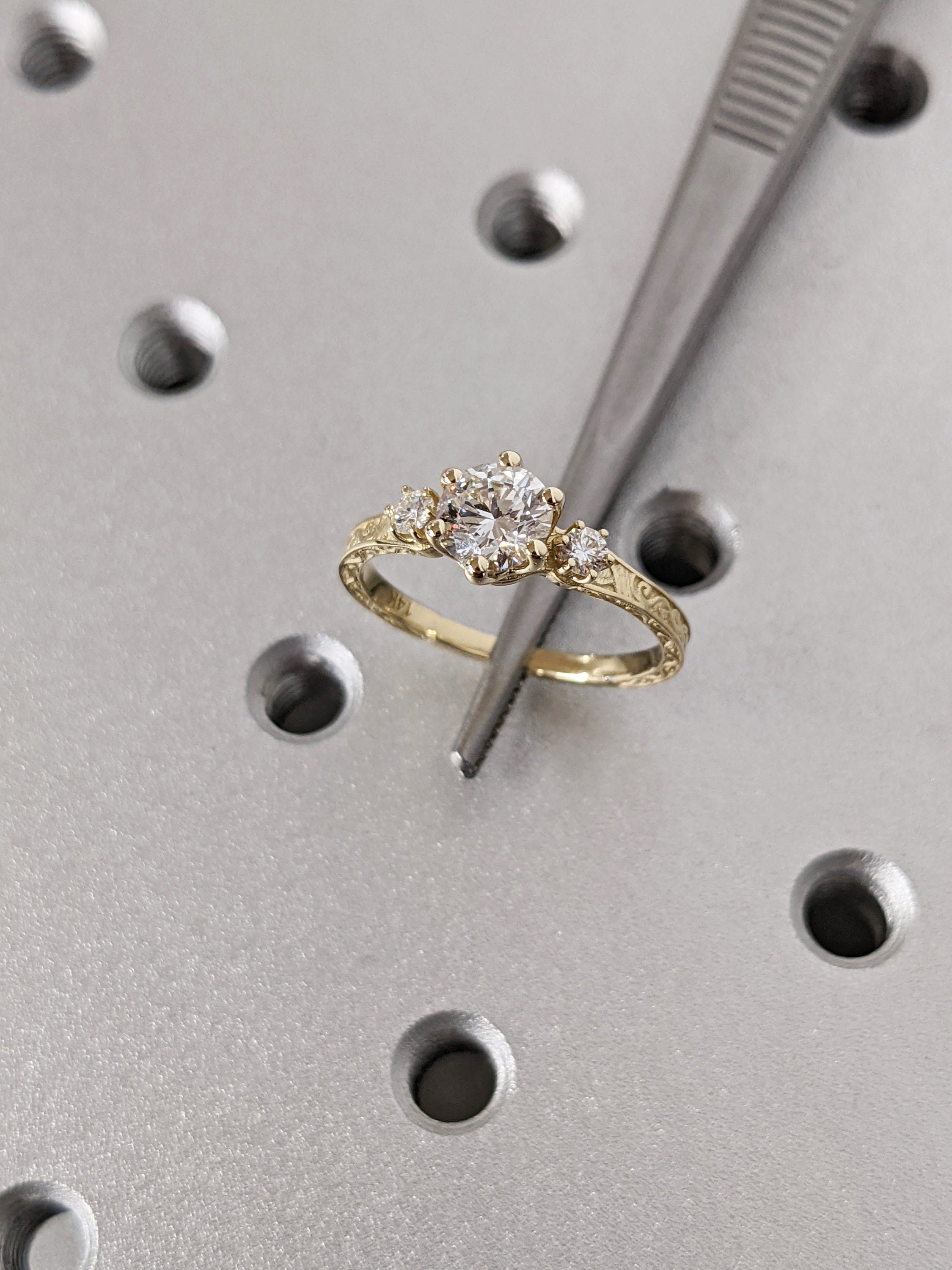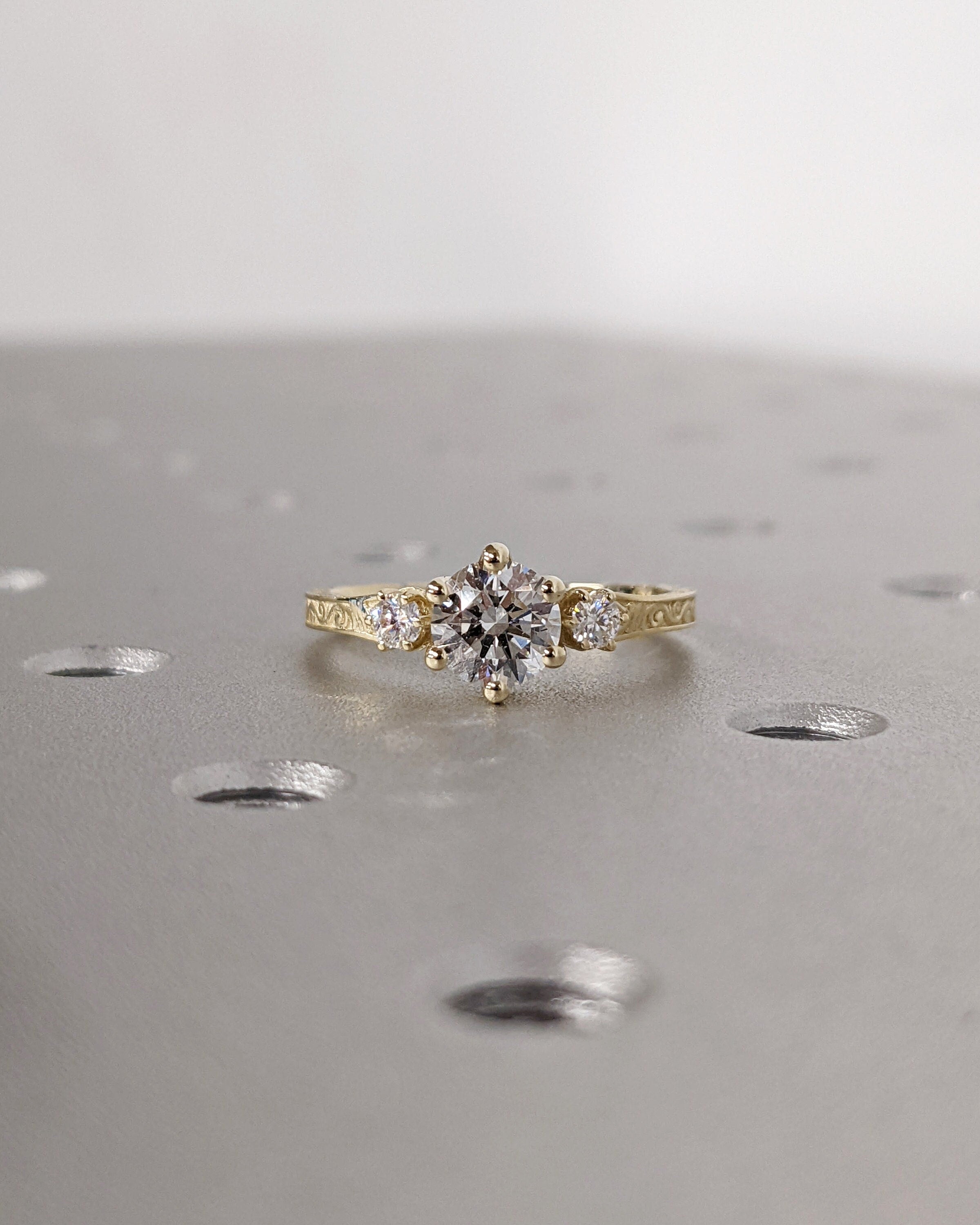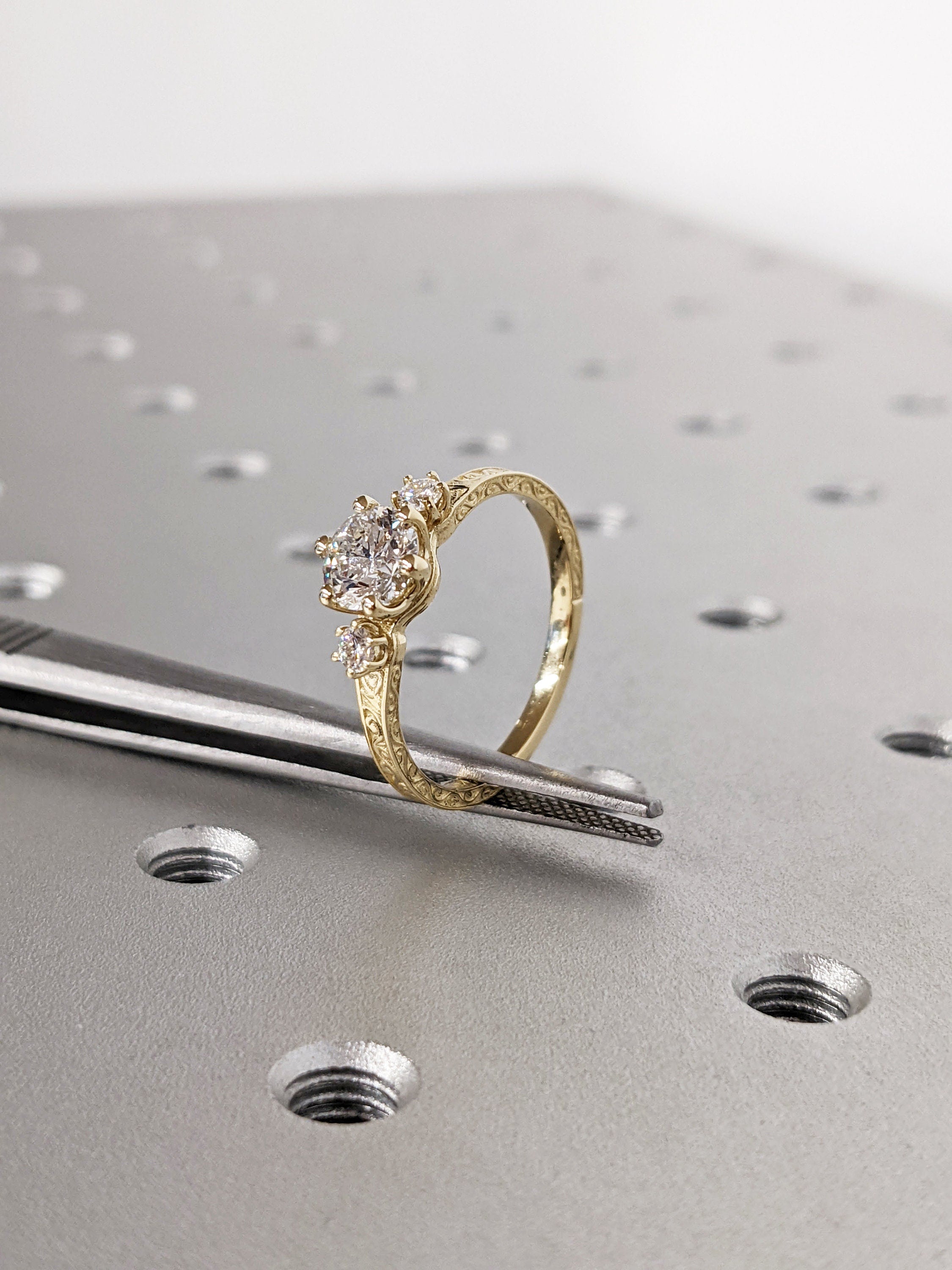 Moissanite 14k Real Gold Moissanite Diamonds Dainty Round 3 Stone Engagement Ring, Cluster Ring, Filigree Band, Hand Carved Design, Trellis