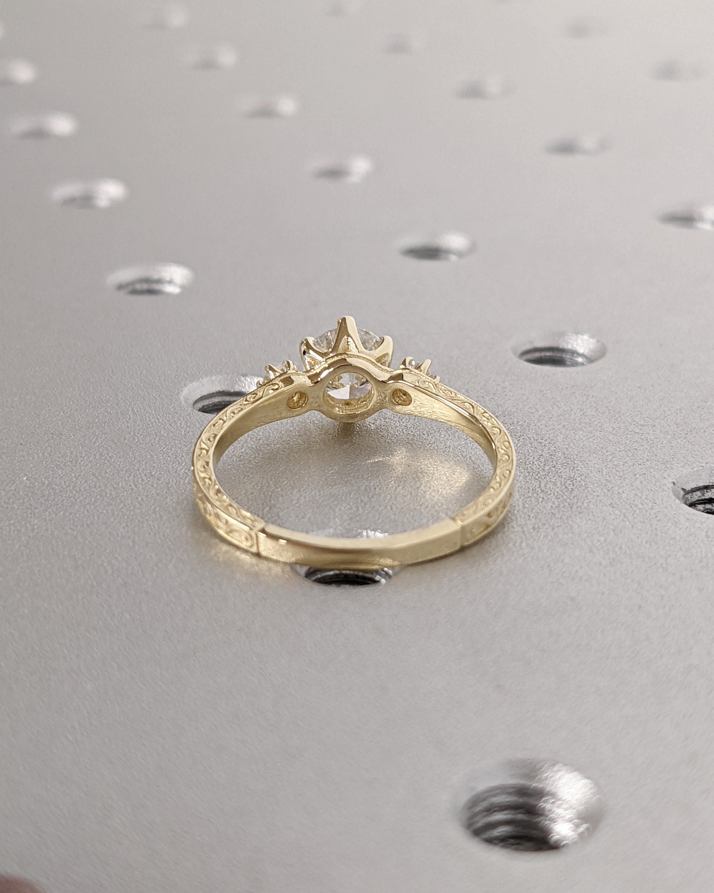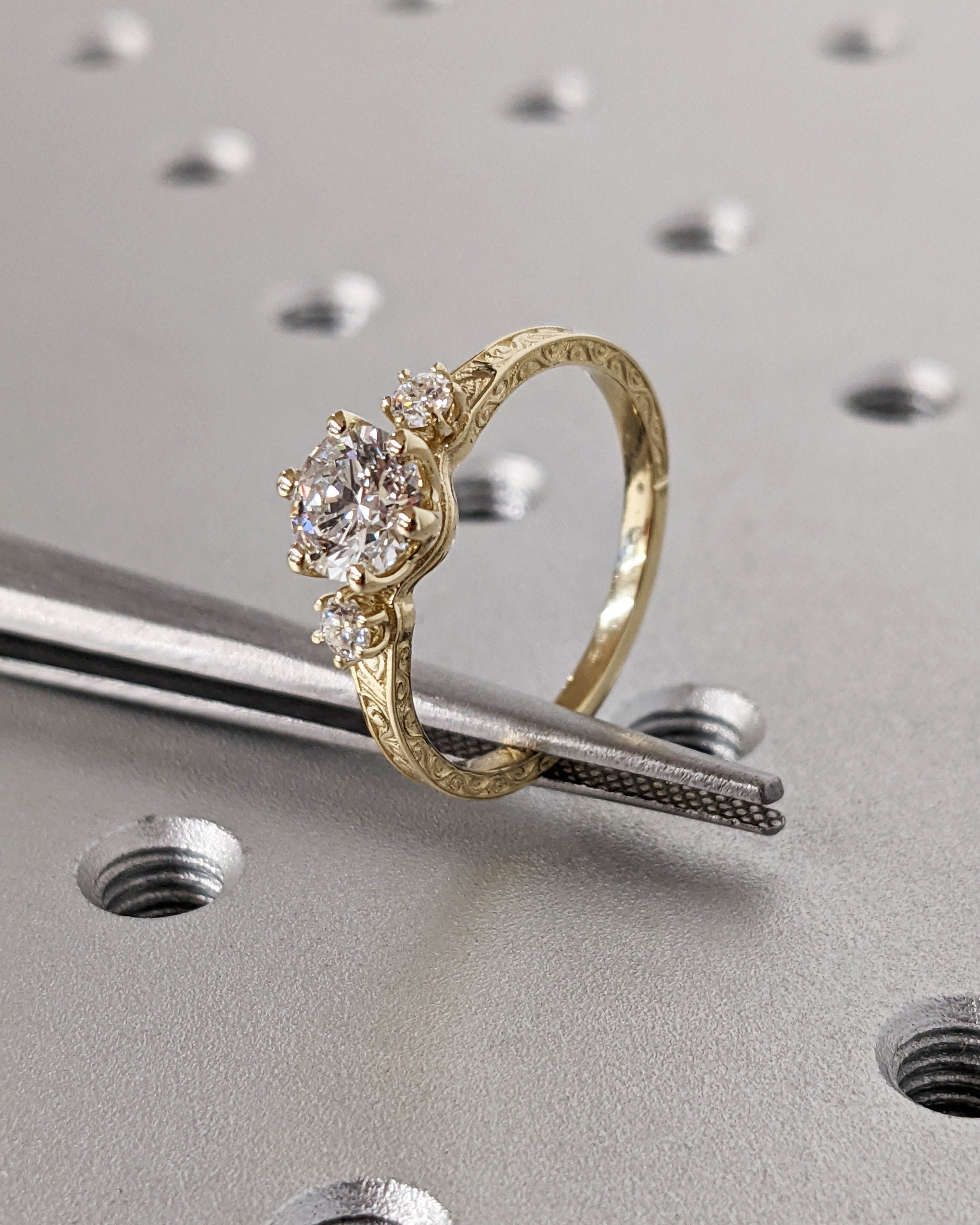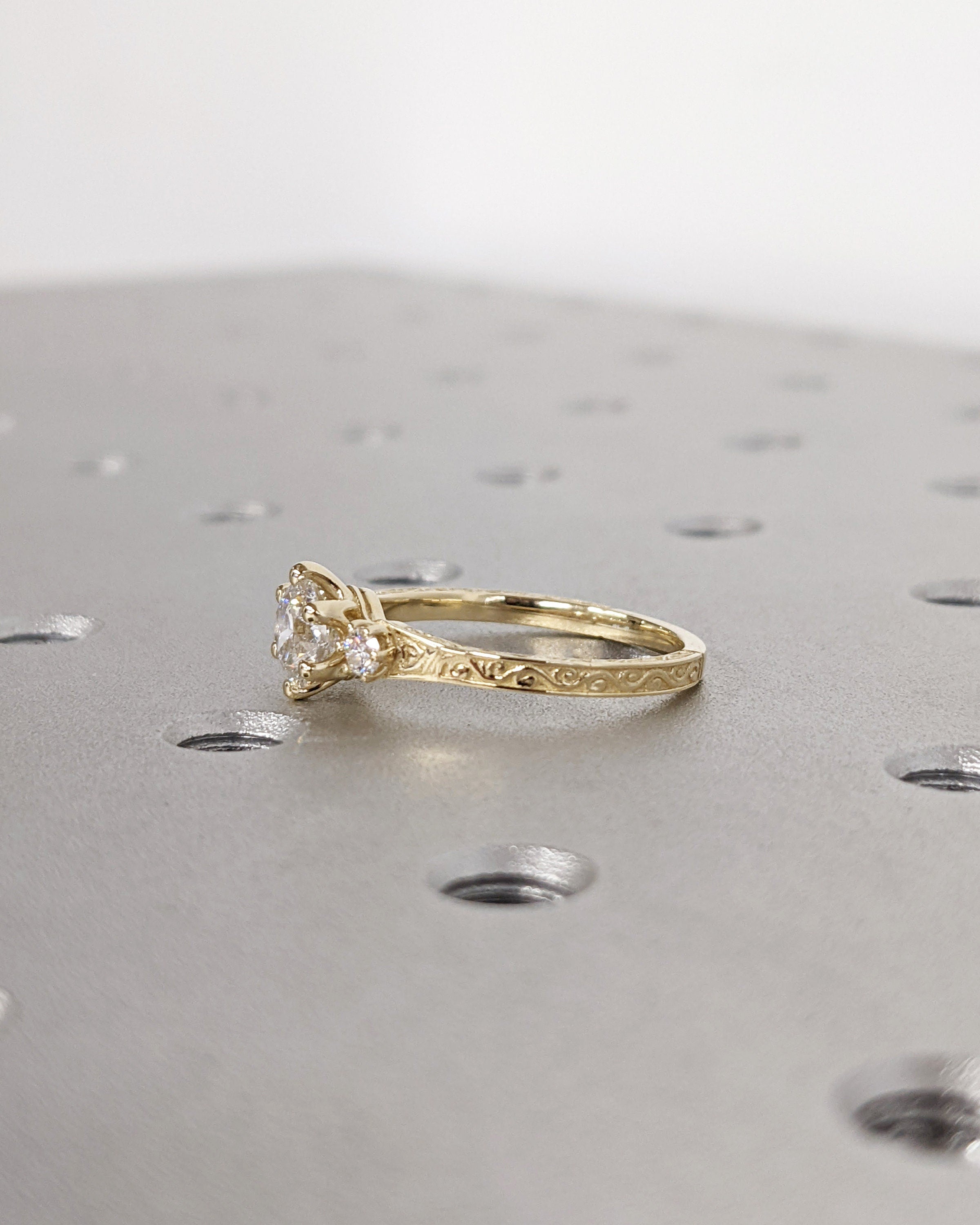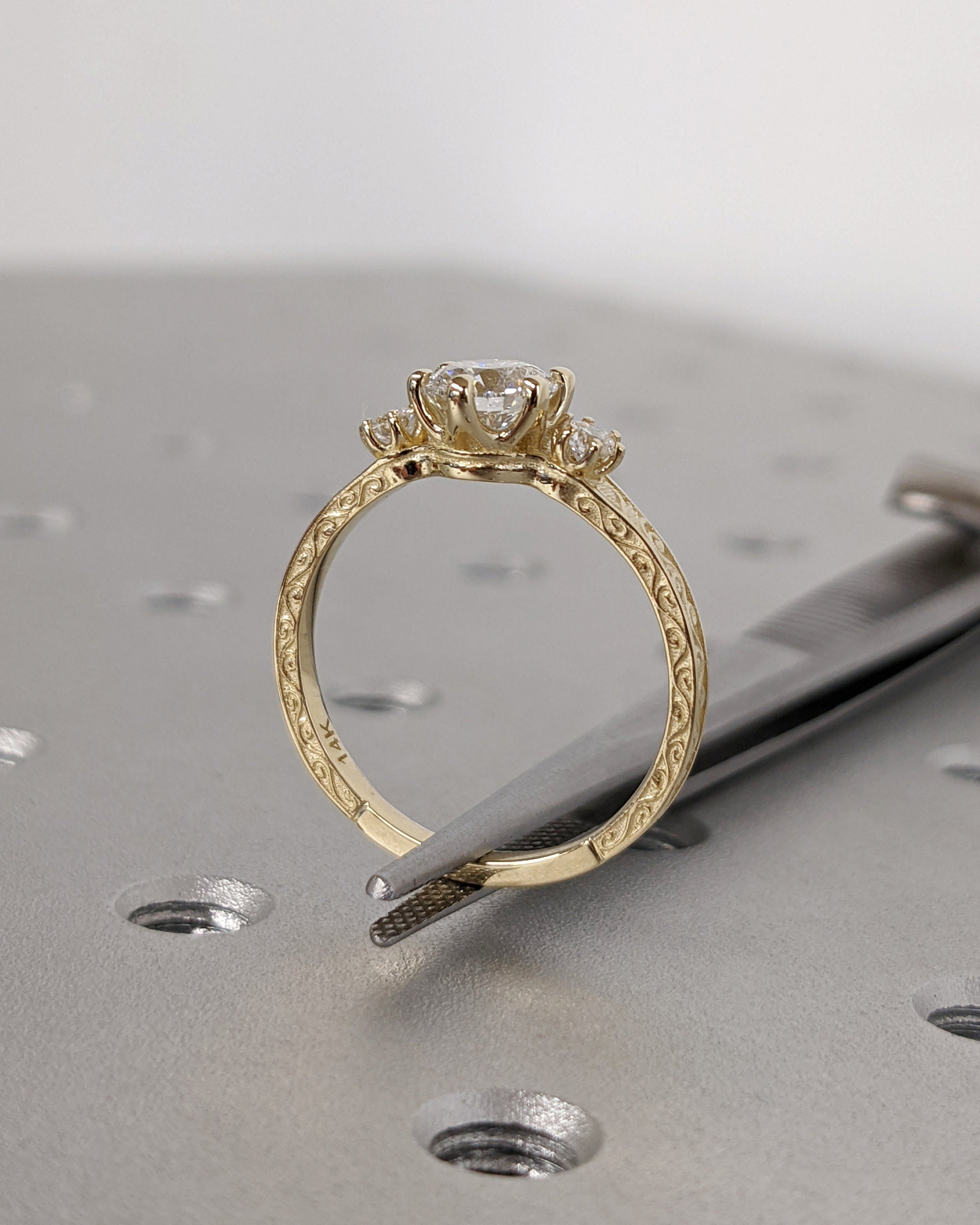 Moissanite 14k Real Gold Moissanite Diamonds Dainty Round 3 Stone Engagement Ring, Cluster Ring, Filigree Band, Hand Carved Design, Trellis