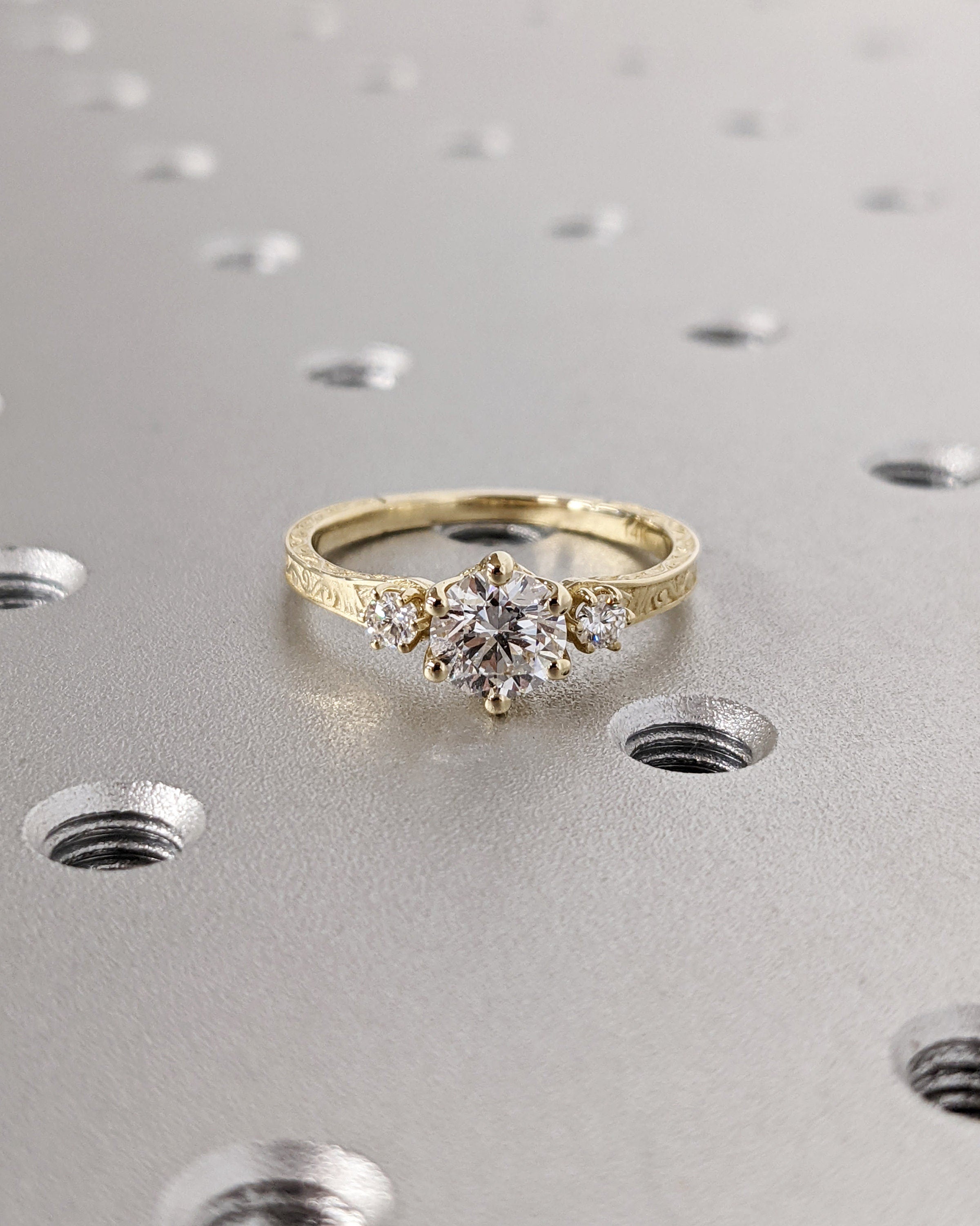 Introducing a captivating masterpiece: our vintage-style three-stone engagement ring, customizable with your preferred choice of diamonds or moissanites. Delight in the intricate undulating wave filigree that graces this exceptional piece, promising a touch of individuality that stands the test of time.