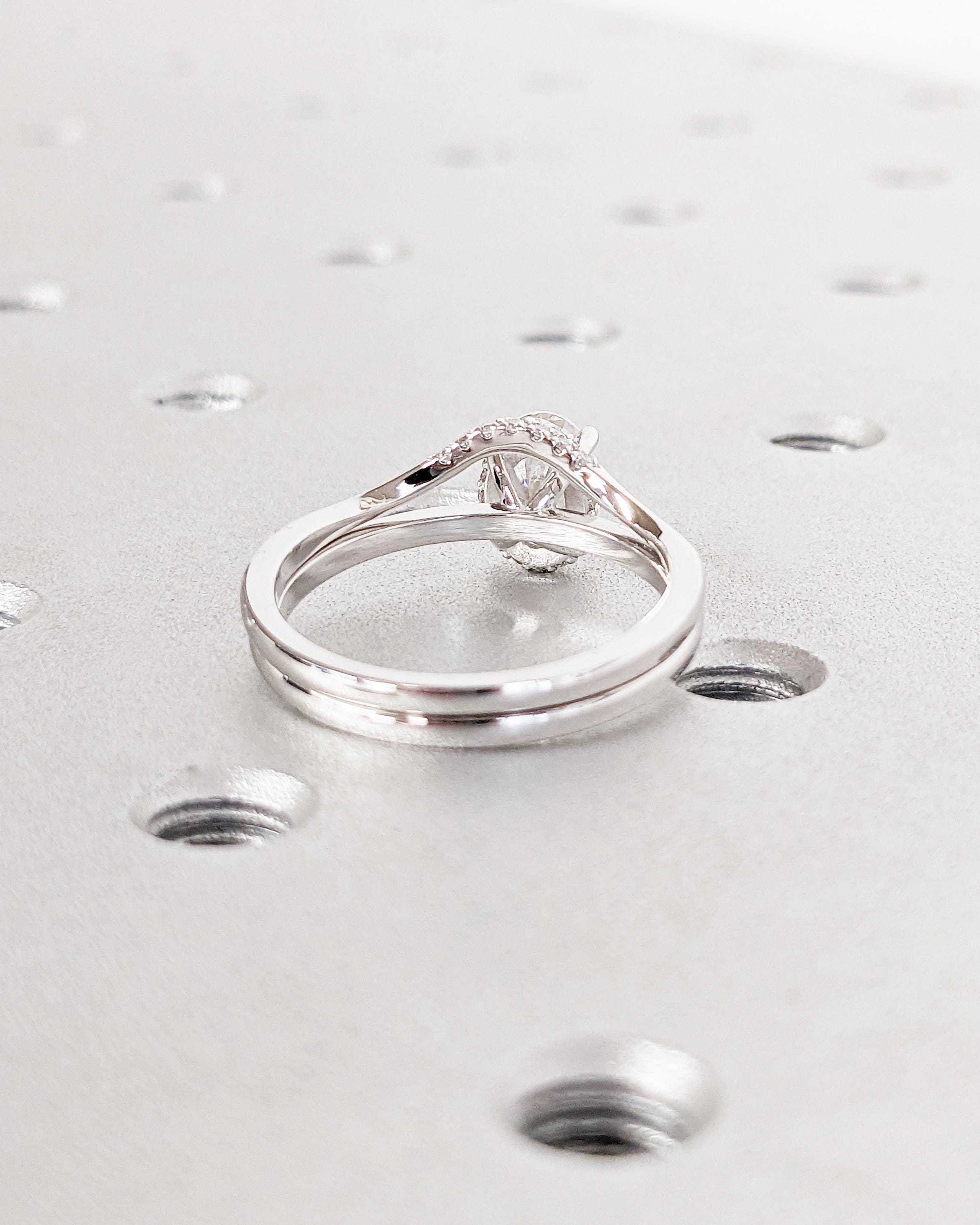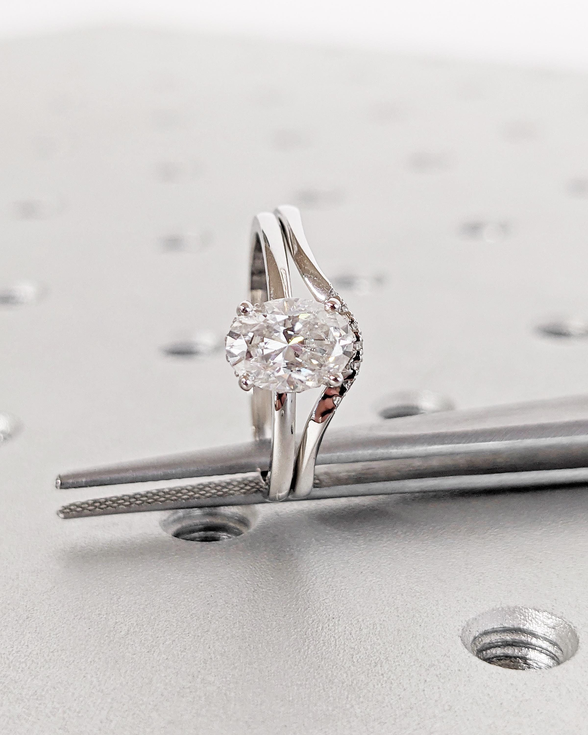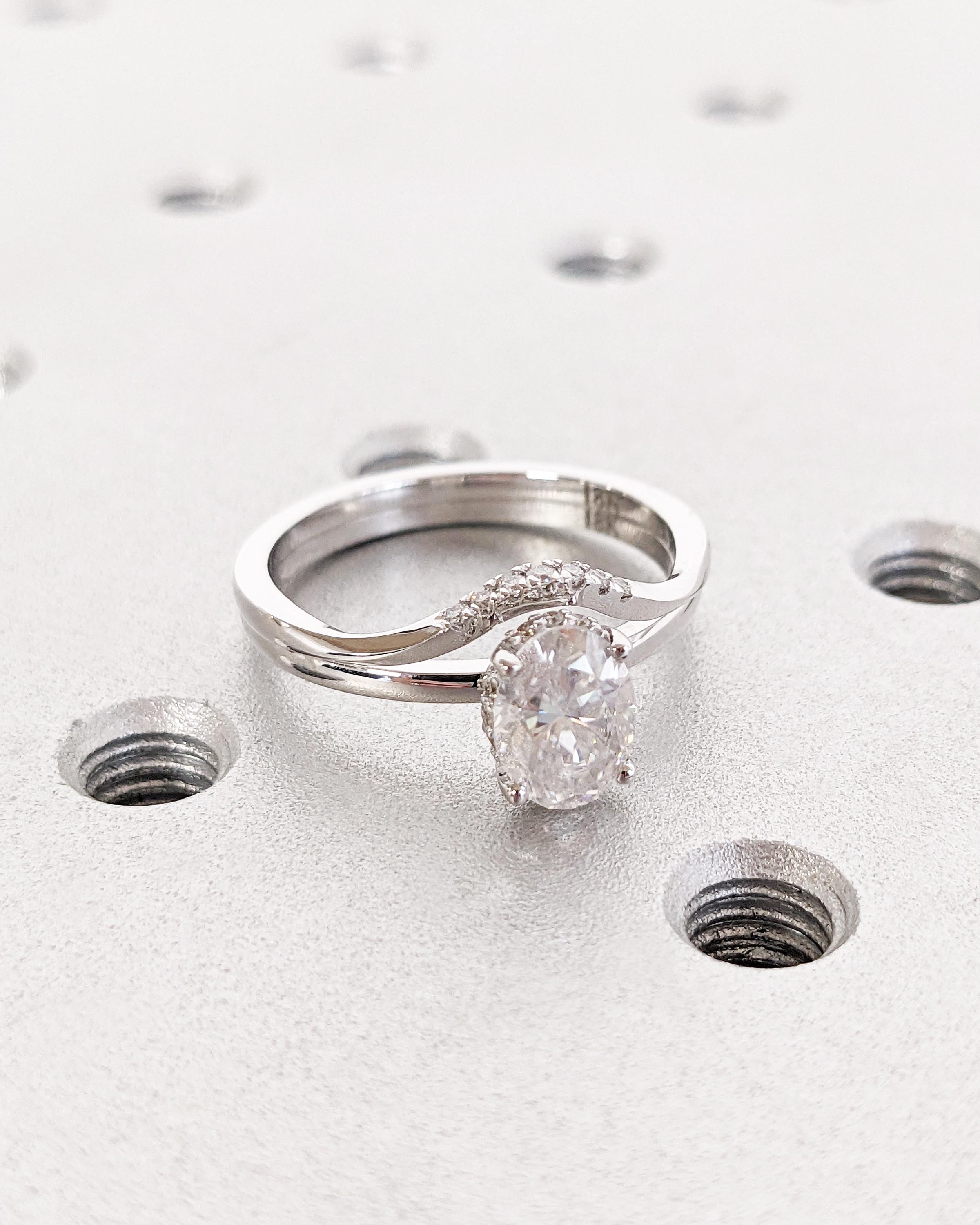 A classic oval moissanite takes center stage in this engagement ring. A hidden halo of pavé diamonds adds depth and sparkle, set on a dainty 1.6mm band. The matching curved wedding band with seven pavé stones completes the bridal set with timeless beauty.