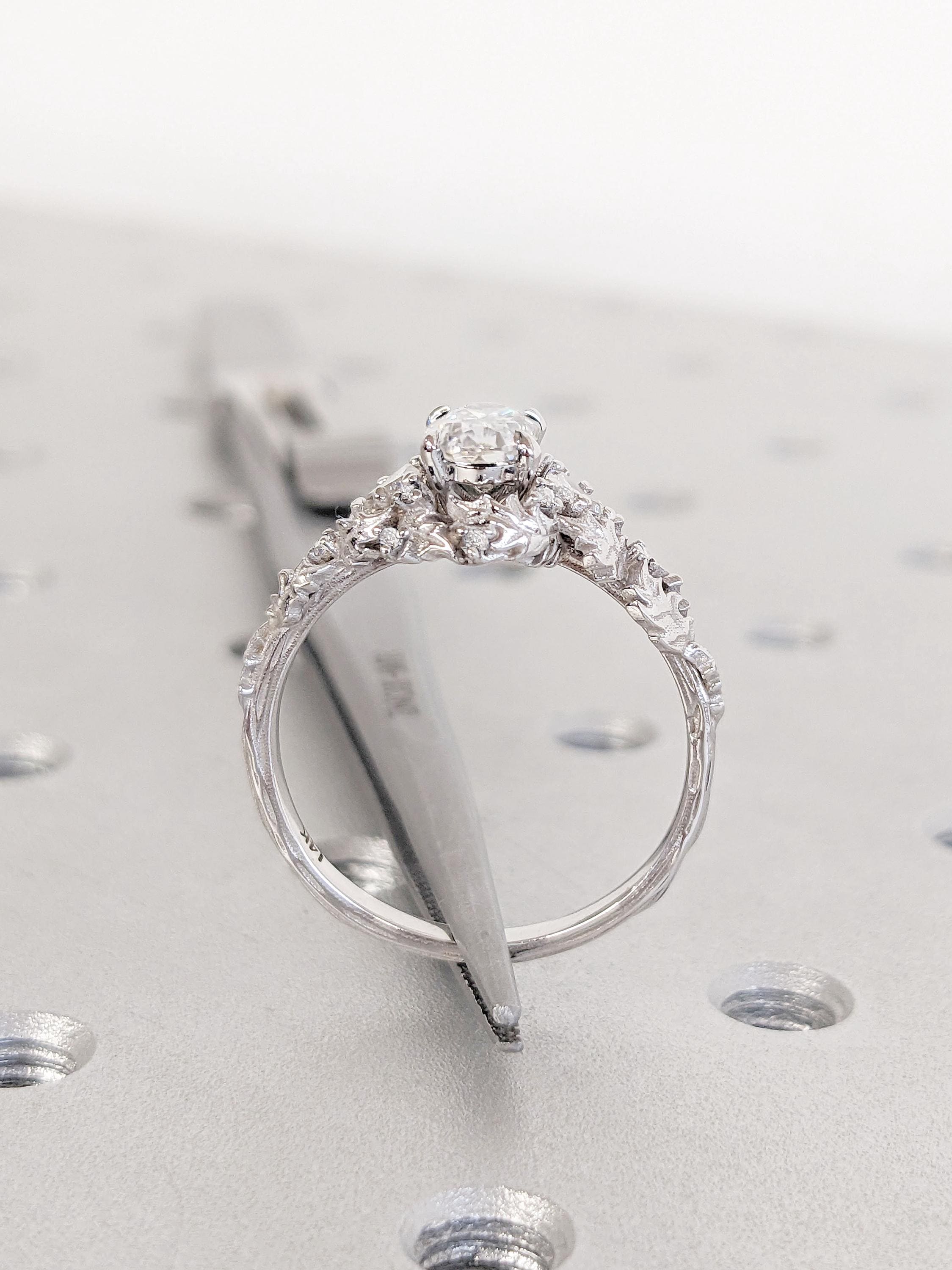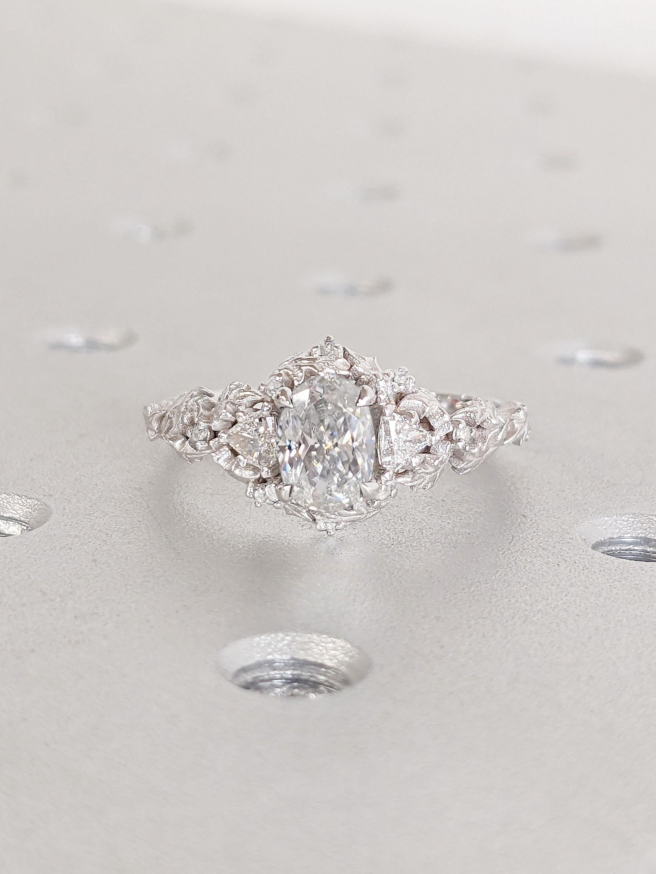 A charming and intricate nature inspired ring, featuring an oval cut Moissanite center, accented by a pair of sparkling trillion cut side stones in your choice of diamonds or moissanites. Elegantly embraced by carefully crafted handmade leaves motifs. Rustic and regal, this heirloom worthy statement jewelry is the perfect gift for engagement, wedding anniversary or simply to pamper that special woman in your life.