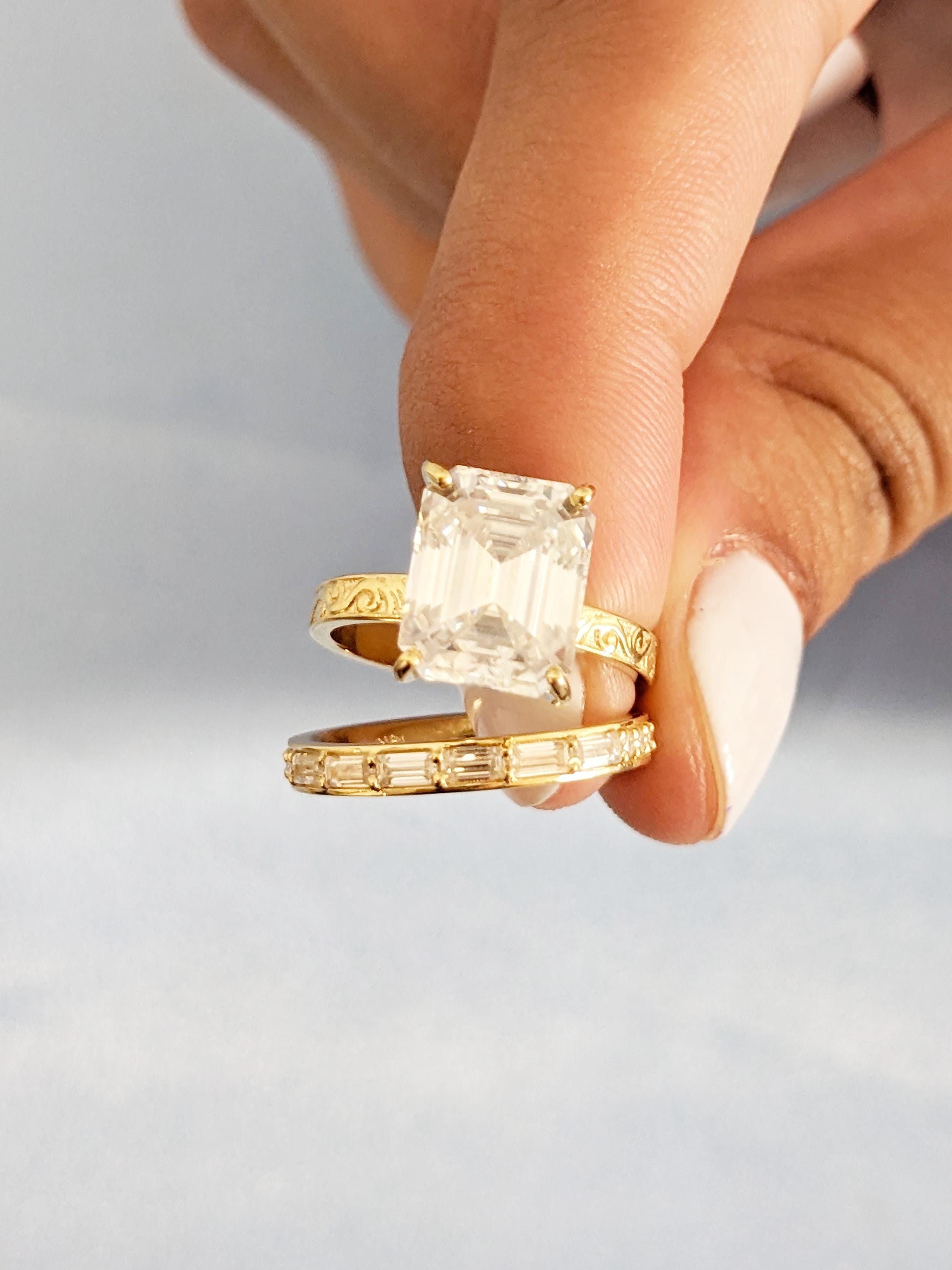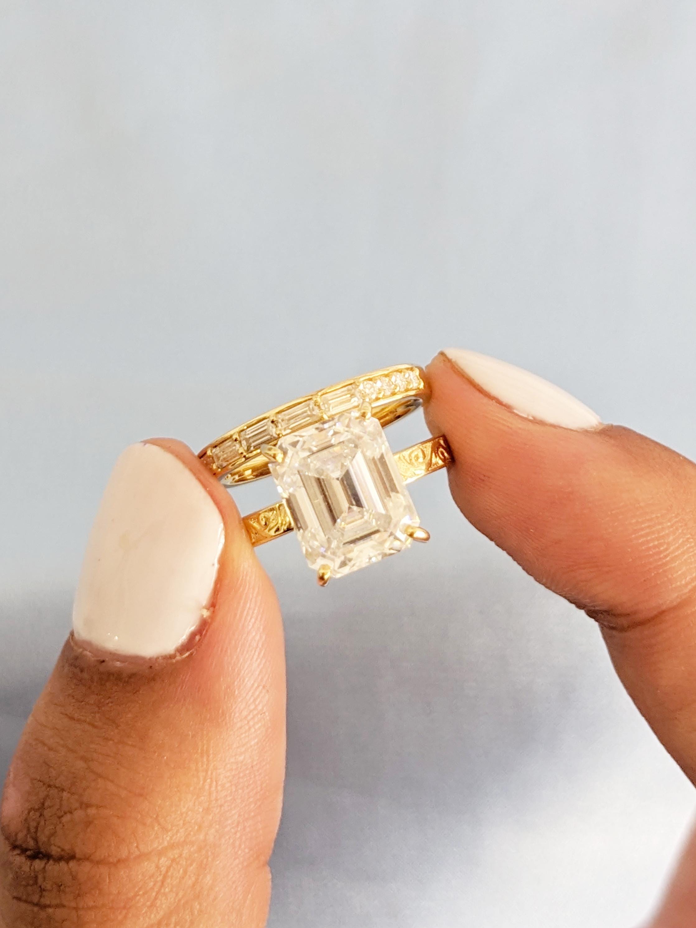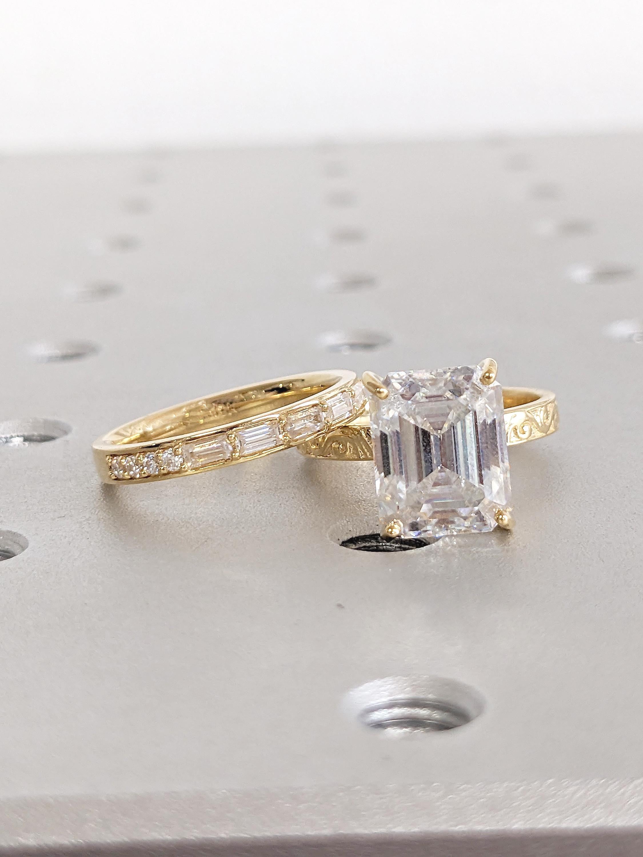 This vintage-inspired bridal set features an emerald-cut Moissanite in an open gallery setting on a 2.5mm band with delicate filigree detailing. Paired with a matching band set with six baguette and eight round moissanites. Together, this set captures the essence of enduring love and antique-inspired allure.