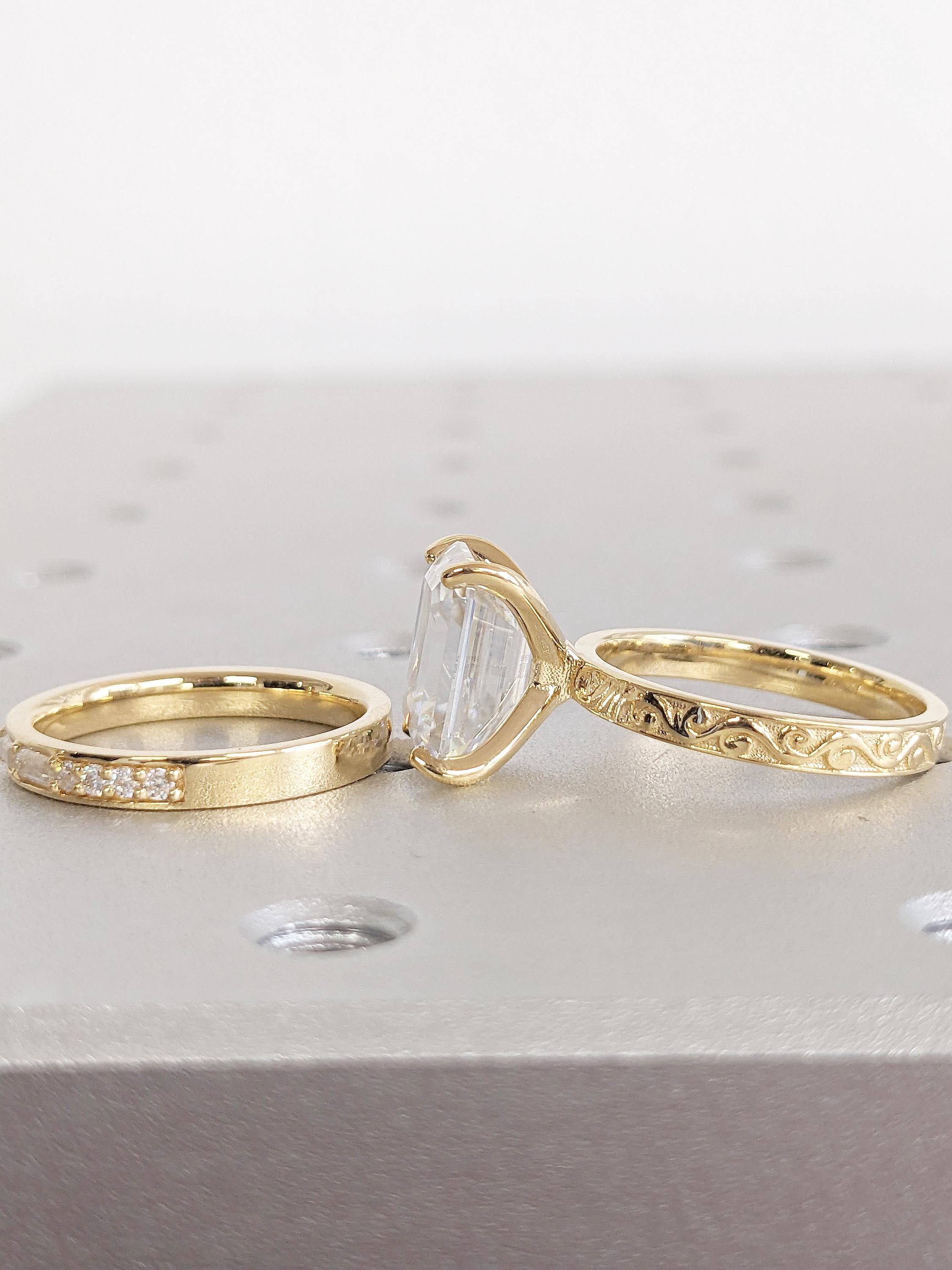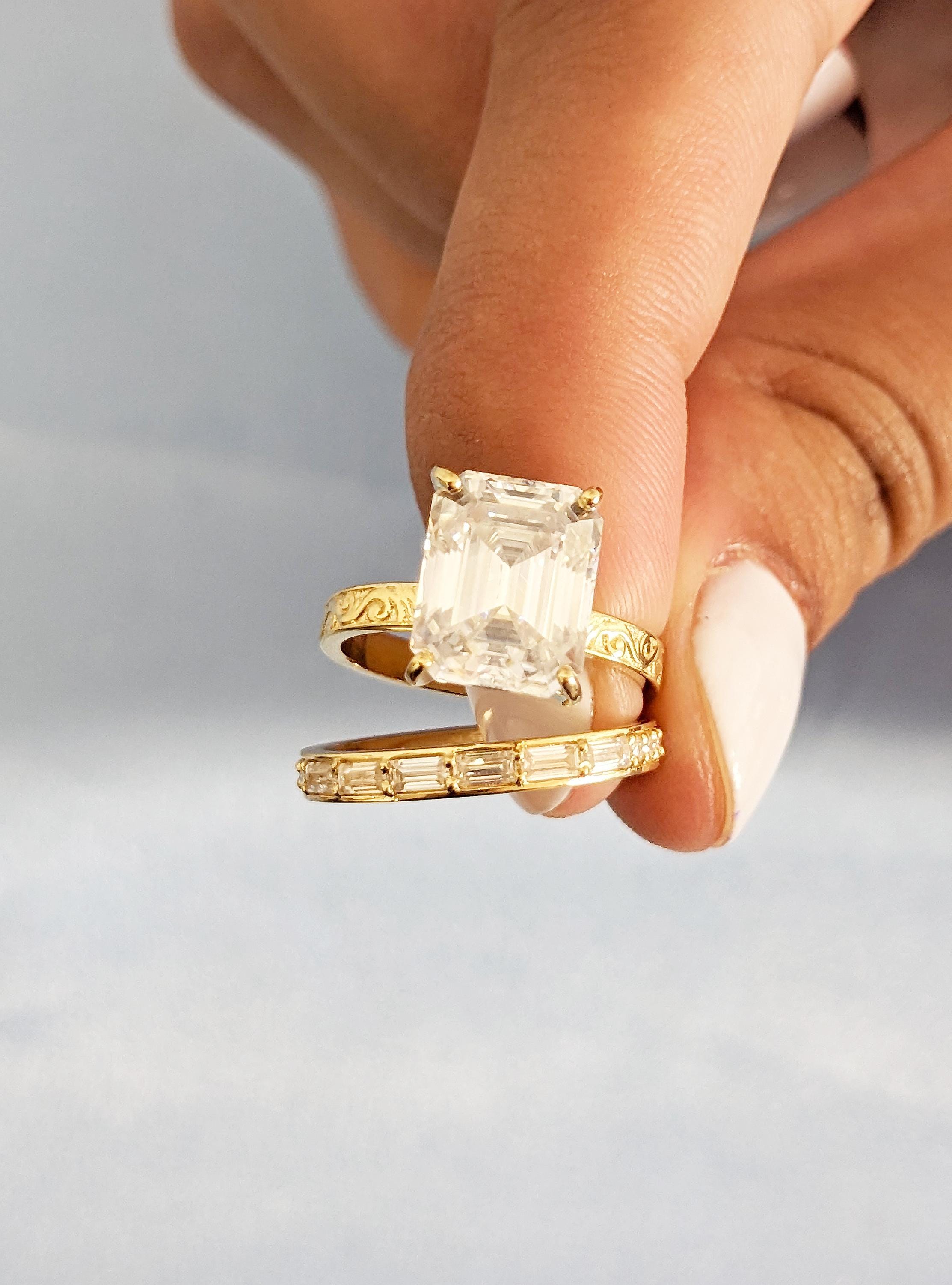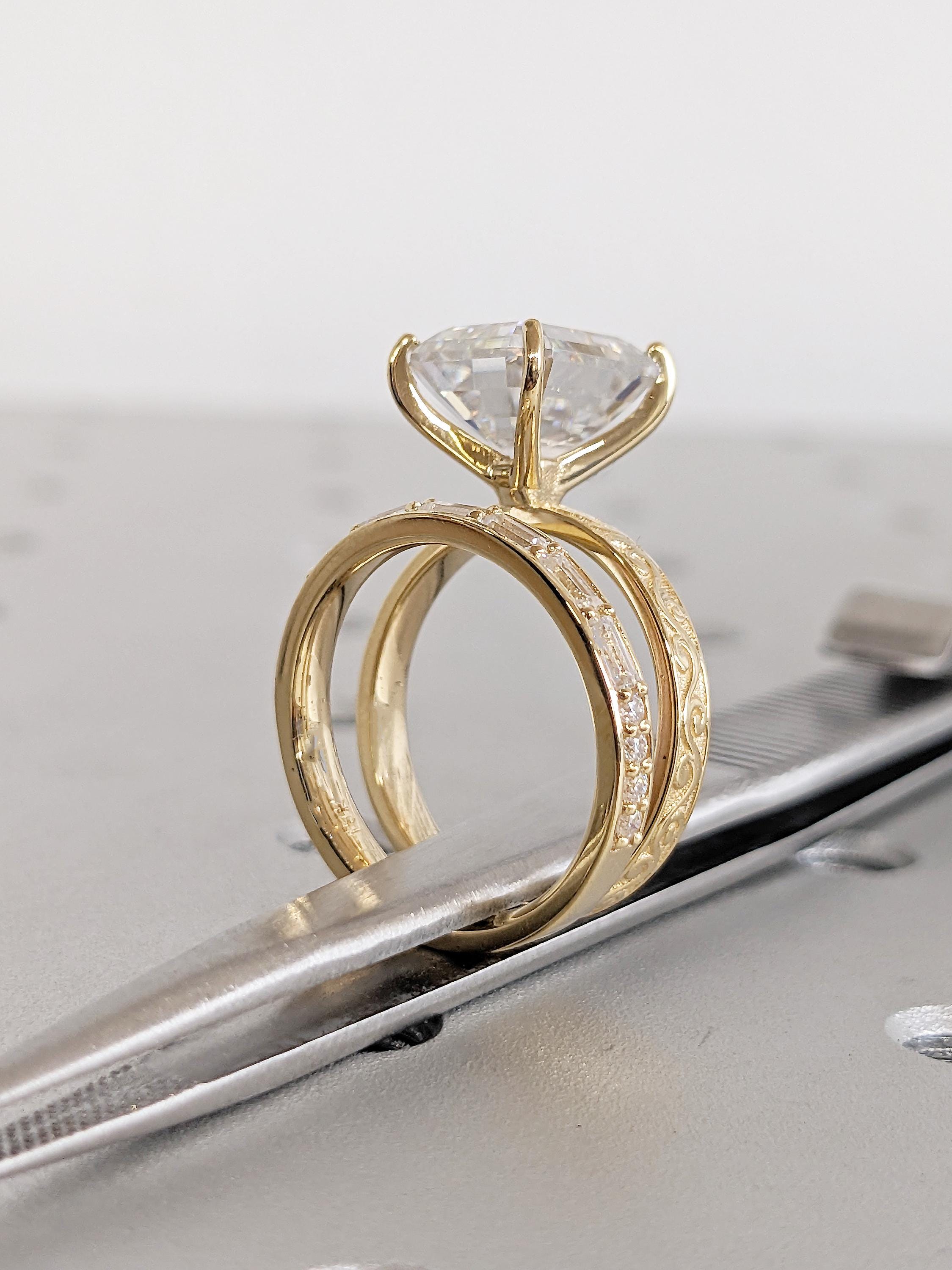 This vintage-inspired bridal set features an emerald-cut Moissanite in an open gallery setting on a 2.5mm band with delicate filigree detailing. Paired with a matching band set with six baguette and eight round moissanites. Together, this set captures the essence of enduring love and antique-inspired allure.