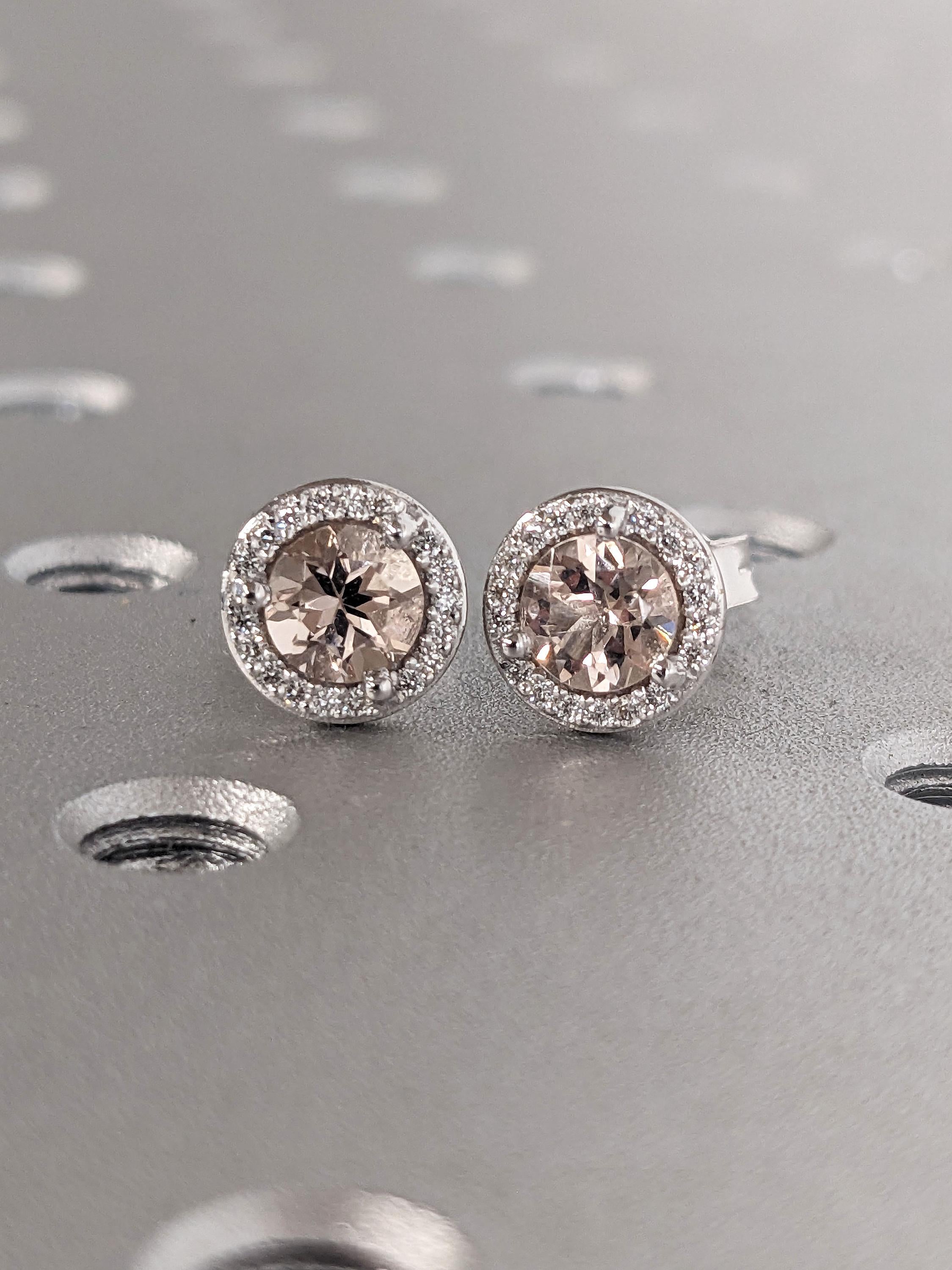 Softly radiant, these stud earrings feature round cut Lab Morganite centers framed by a sparkling halo of moissanites. The blush tones of morganite paired with the brilliance of moissanites create a timeless design that is feminine, elegant, and effortlessly wearable.