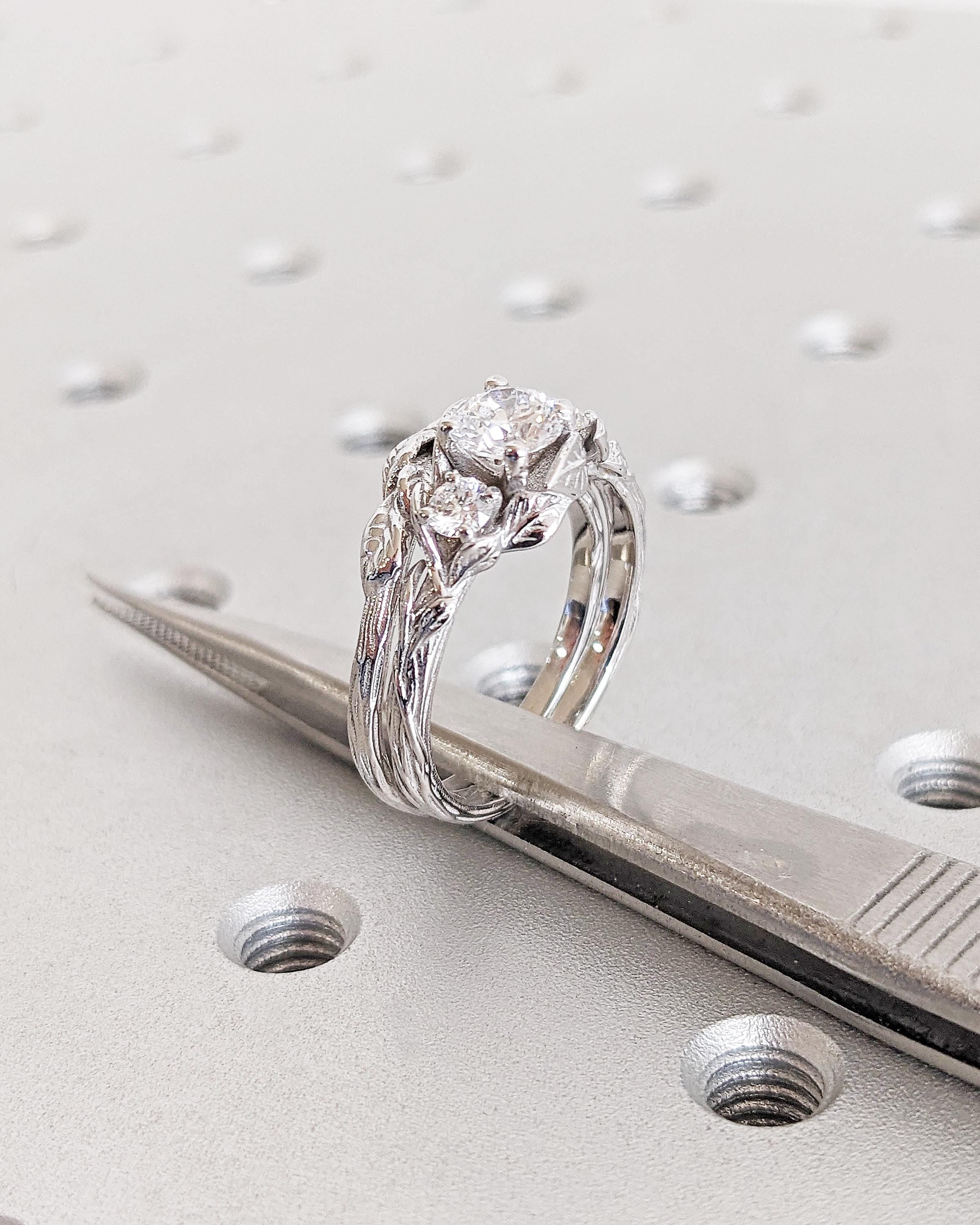 This ring set features an elegant design of lotus flower leaves intertwined to form a twisted vine across the crown towards the central Moissanite setting with two moissanite side stones, all crafted in gold with a stunning curved-shaped leaf engraved matching band. This design was inspired by nature, and this exquisite piece captures the beauty of organic elements. Ideal as an engagement, wedding, or anniversary gift for your wife.