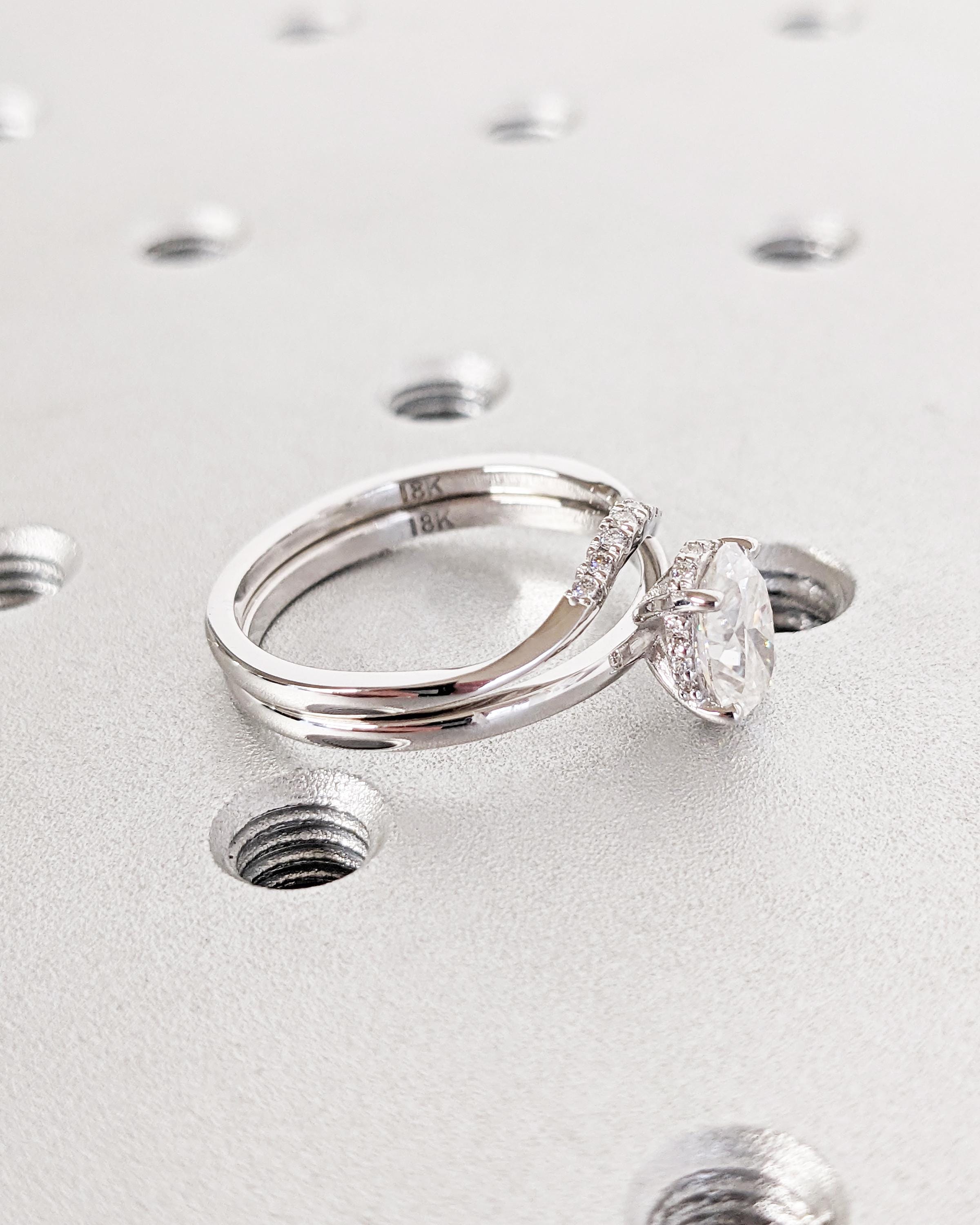 A classic oval moissanite takes center stage in this engagement ring. A hidden halo of pavé diamonds adds depth and sparkle, set on a dainty 1.6mm band. The matching curved wedding band with seven pavé stones completes the bridal set with timeless beauty.