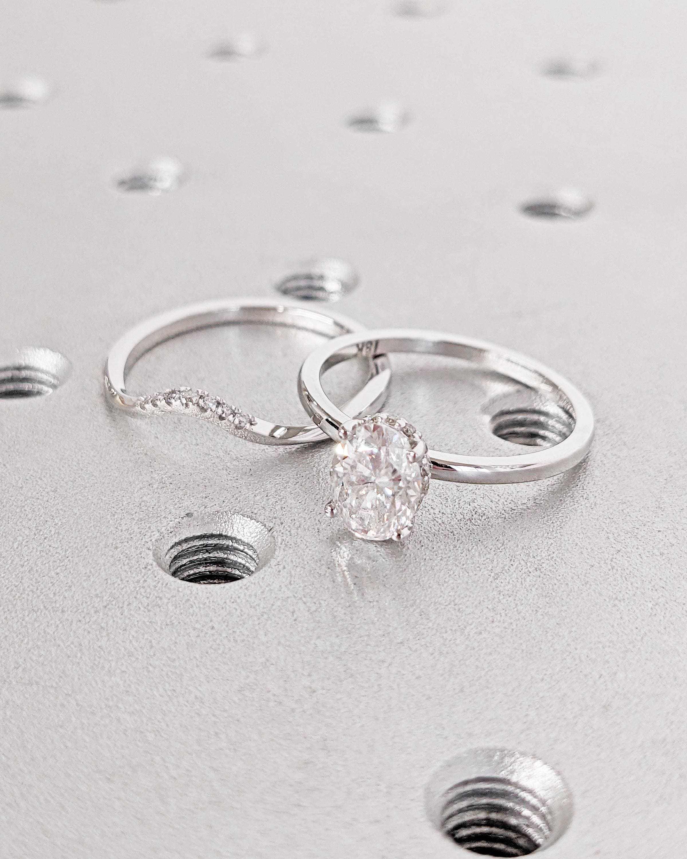 Moissanite Oval Engagement Ring Set, Moissanite Bridal Set, Diamond Hidden Halo Wedding Ring Set, Matching Rings, White Gold Promise Rings