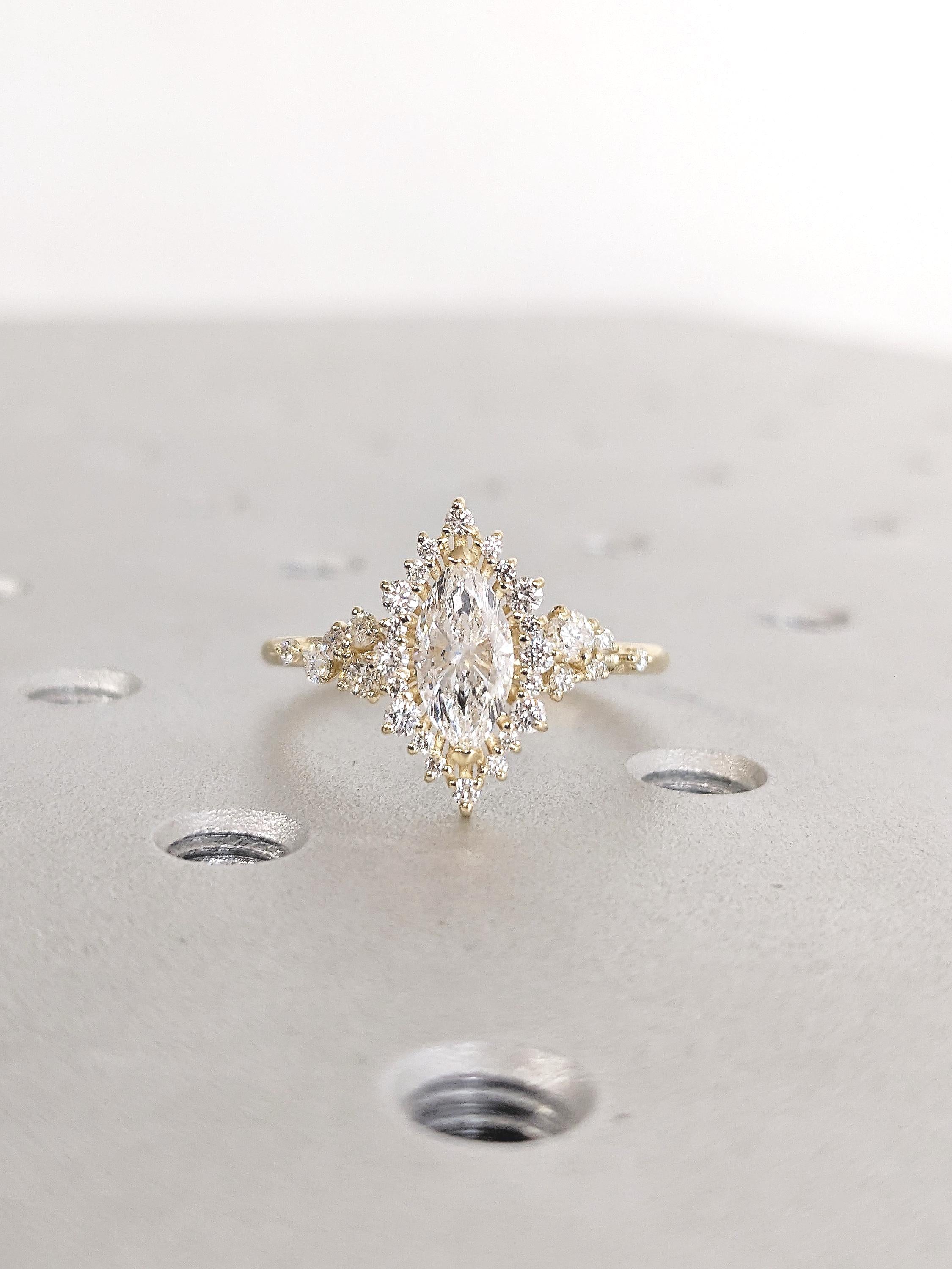 Luxurious and regal, this statement ring features a marquise cut Moissanite center, with an intricate halo of sparkling side stones in various sizes held elegantly in prong setting that resembles a lotus leaf's veins. Accented by clusters of Natural Diamonds, Lab Grown Diamonds or Moissanites, drifting along the dainty band of 1.8mm width, like freshly fallen snow. A handmade masterpiece fit for the princess in you. Perfect for proposal, engagement, wedding anniversary or that special woman in your life.