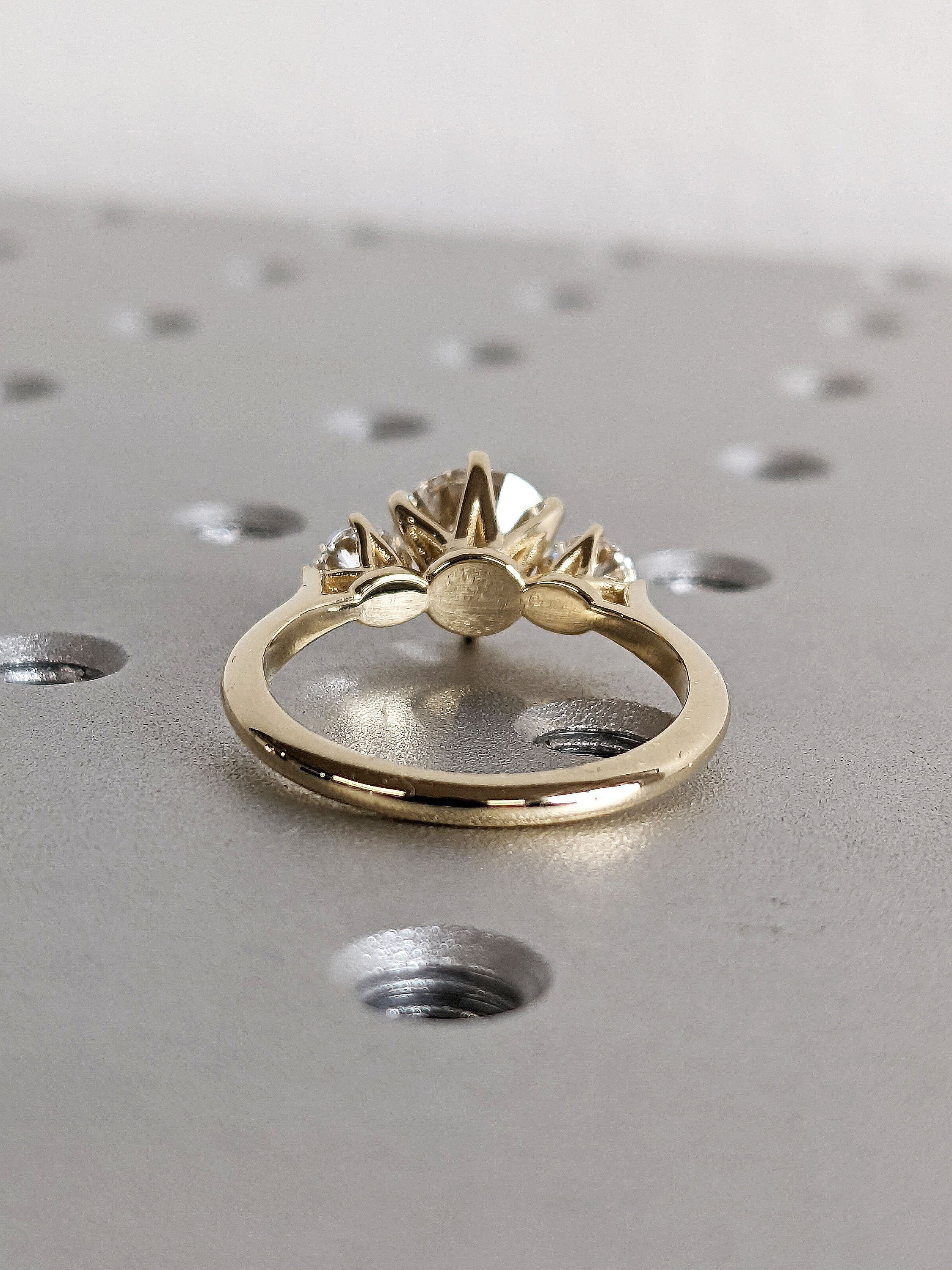 This minimalist and timeless handcrafted piece makes a great wedding jewelry, symbolizing the journey of a couple's relationship. With its two side stone representing the past and the future, and the centre gemstone symbolizes the present moment.
