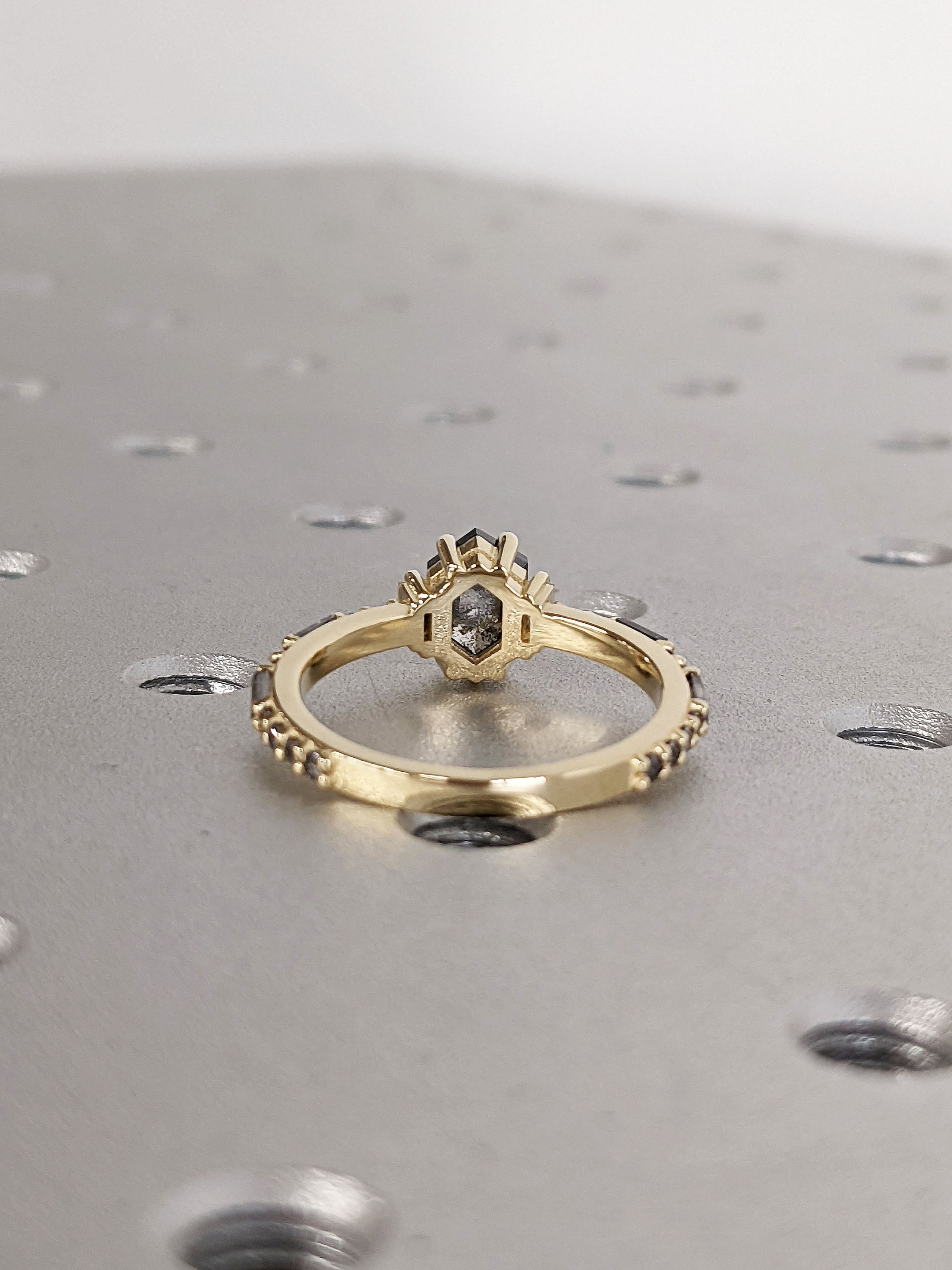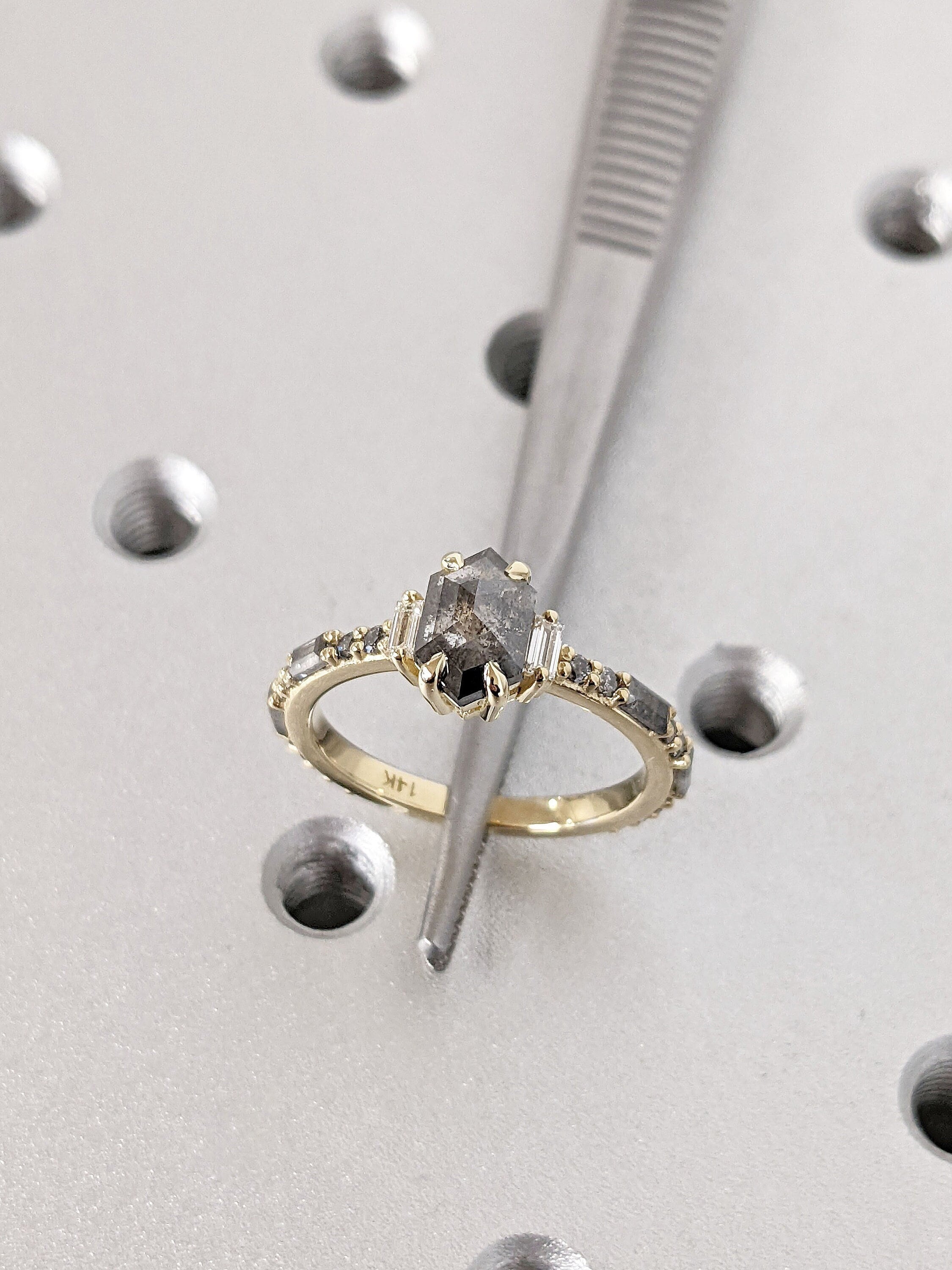 Handcrafted geometrical beauty, this statement jewelry features a hexagon cut natural Salt and Pepper Diamond center, complemented by mix shape of round and baguette cut diamond band.
