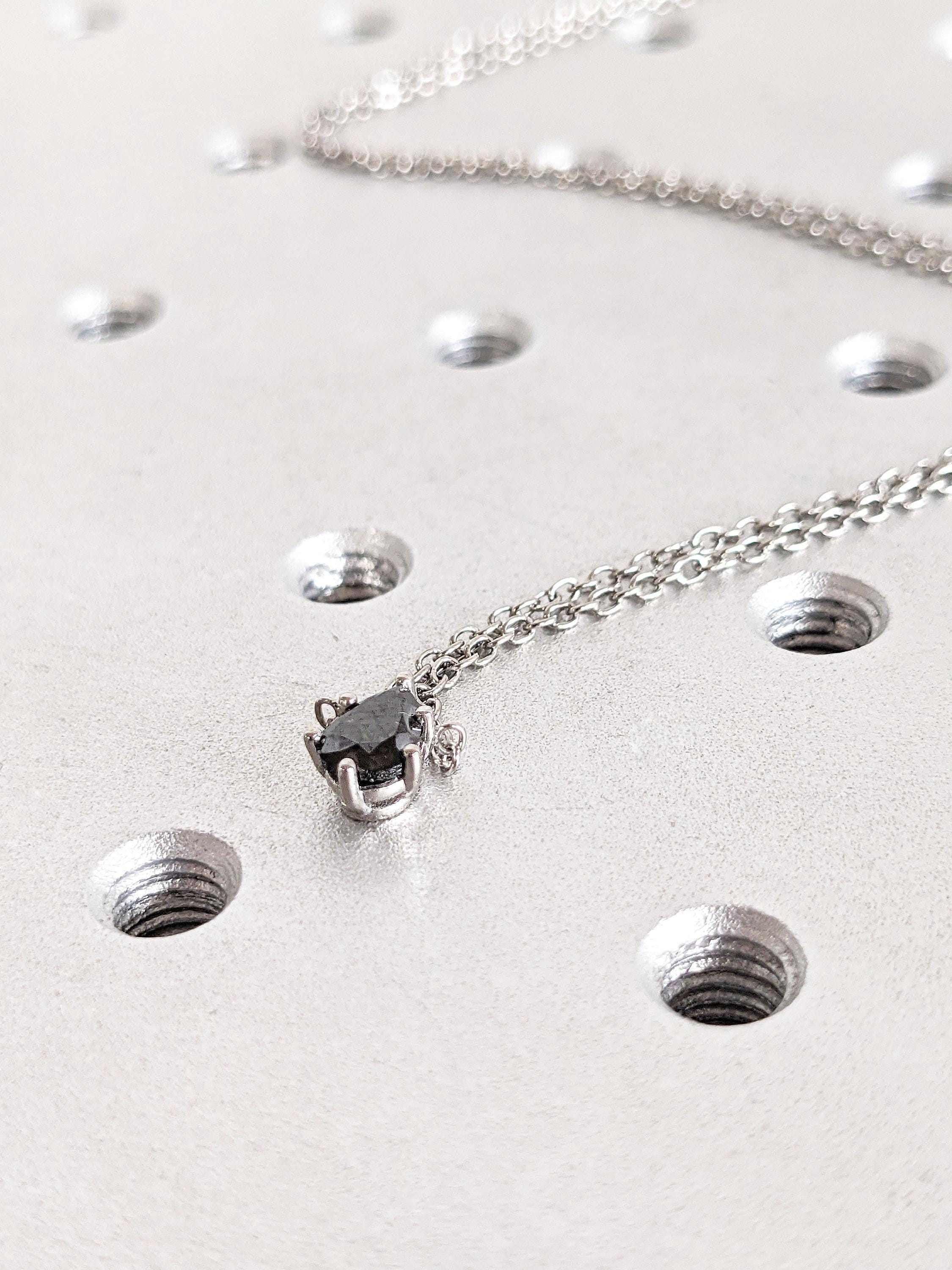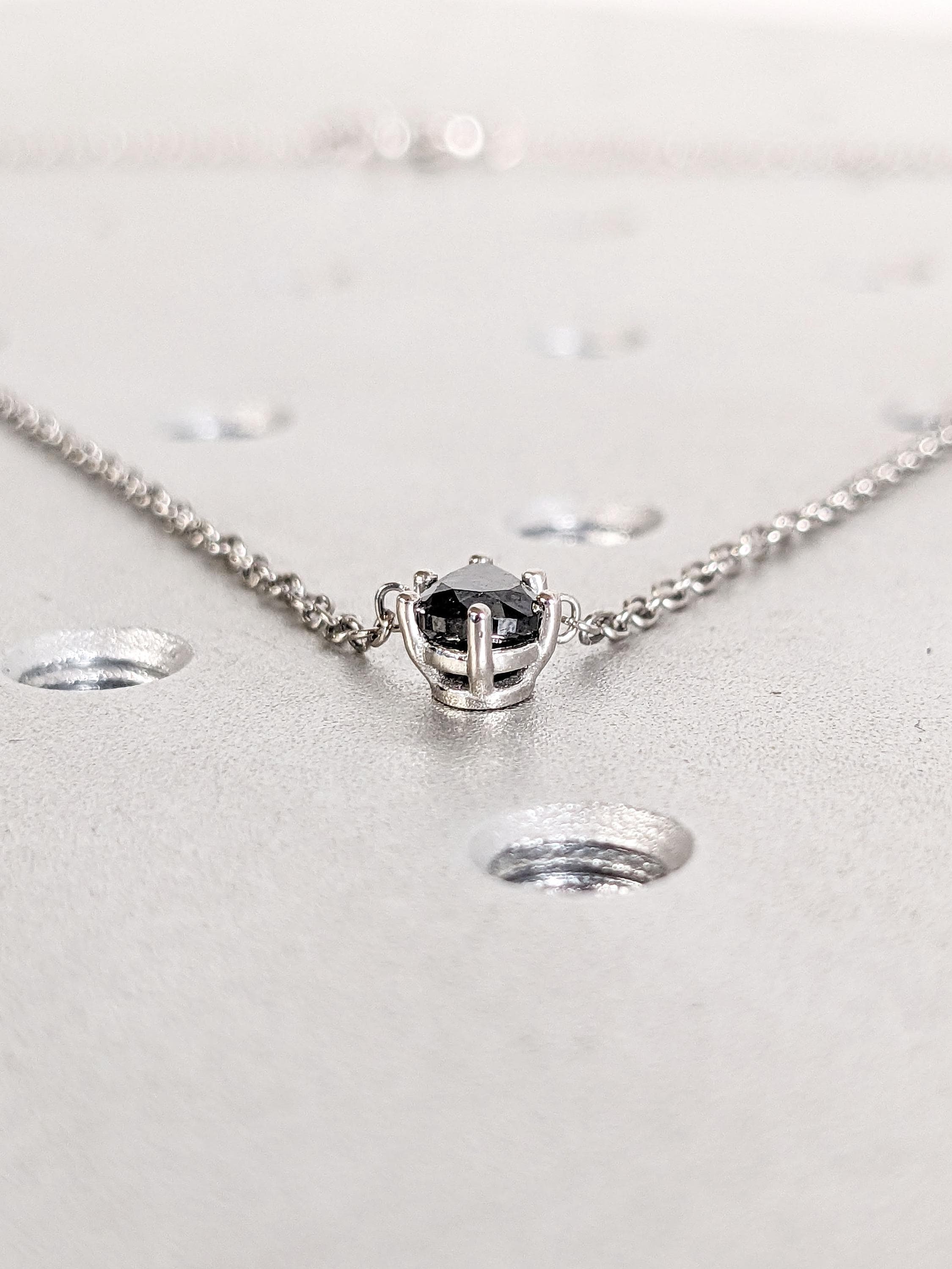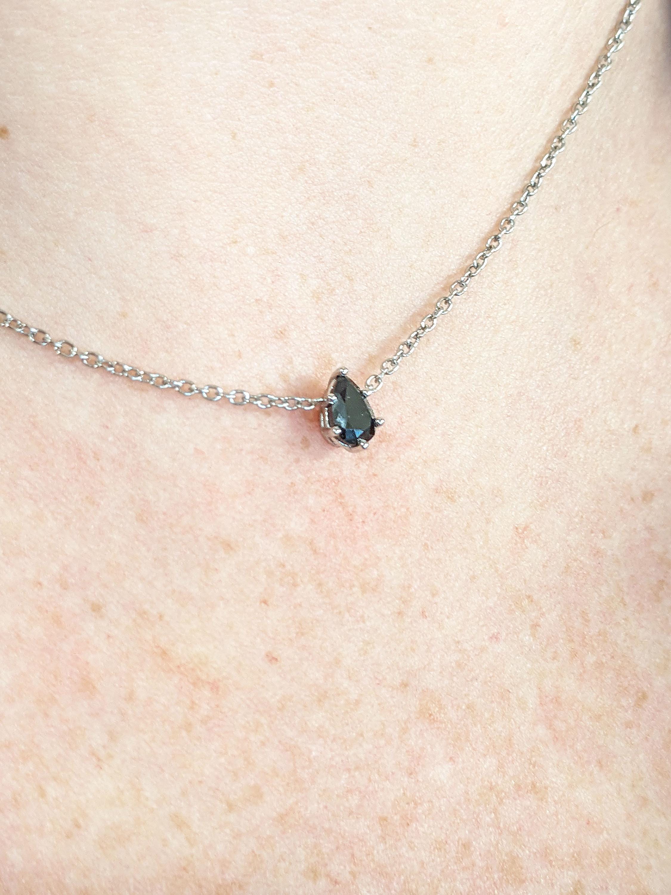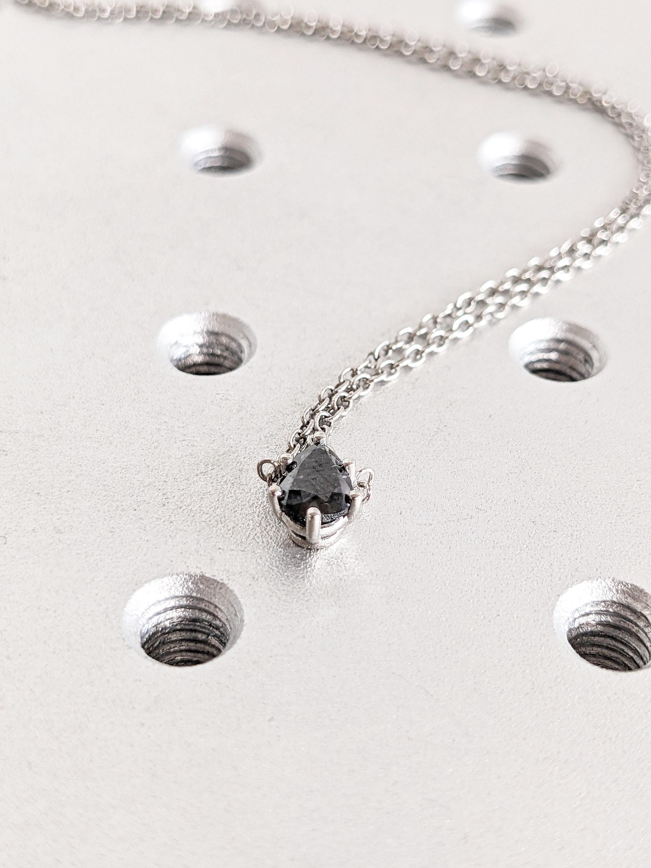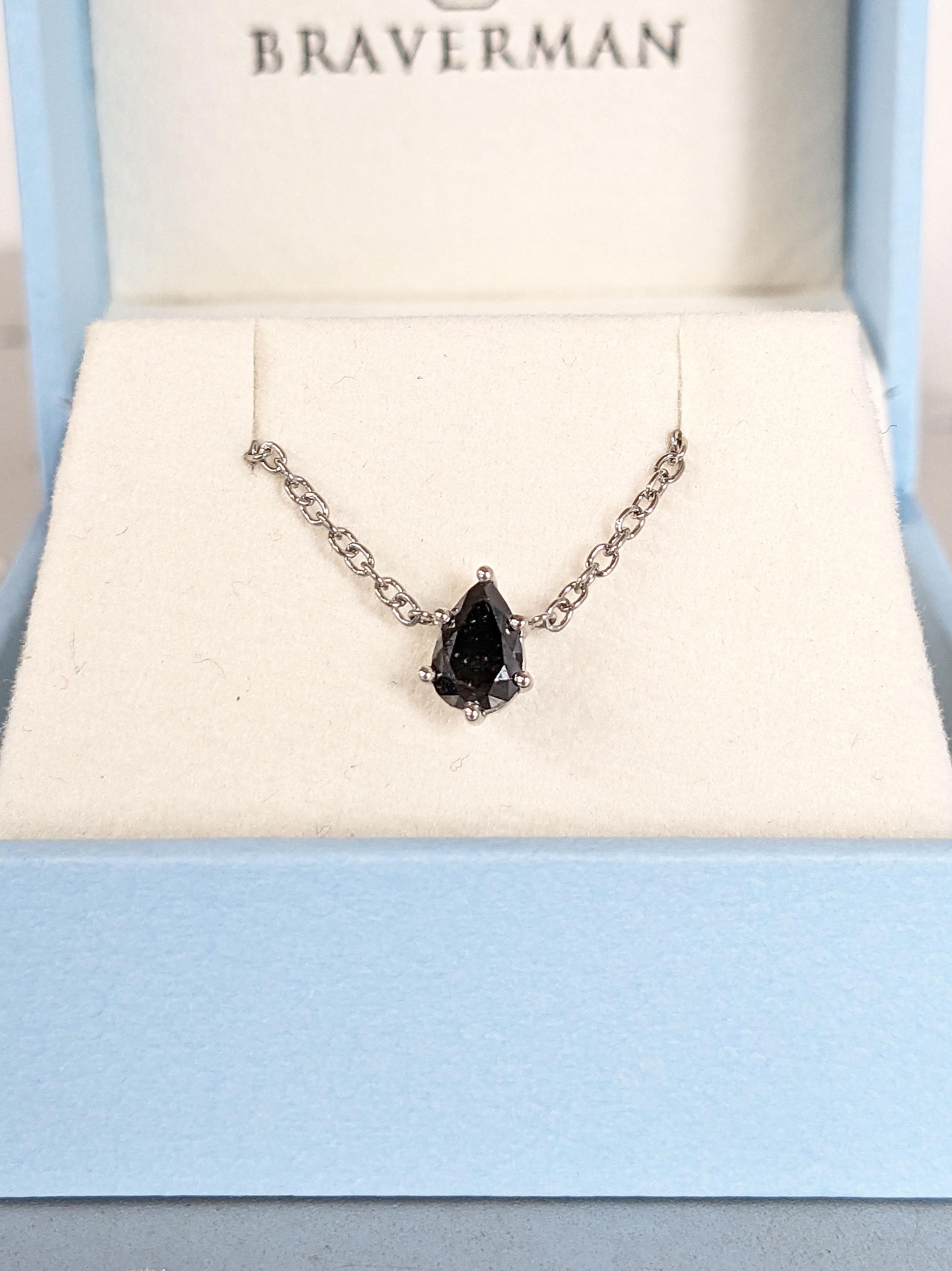 Redefine your jewelry collection with our solitaire pendant, showcasing a pear cut Black Diamond in a low secured setting. This elegant piece effortlessly adds sophistication to any ensemble, ensuring a refined and timeless look, day or night.