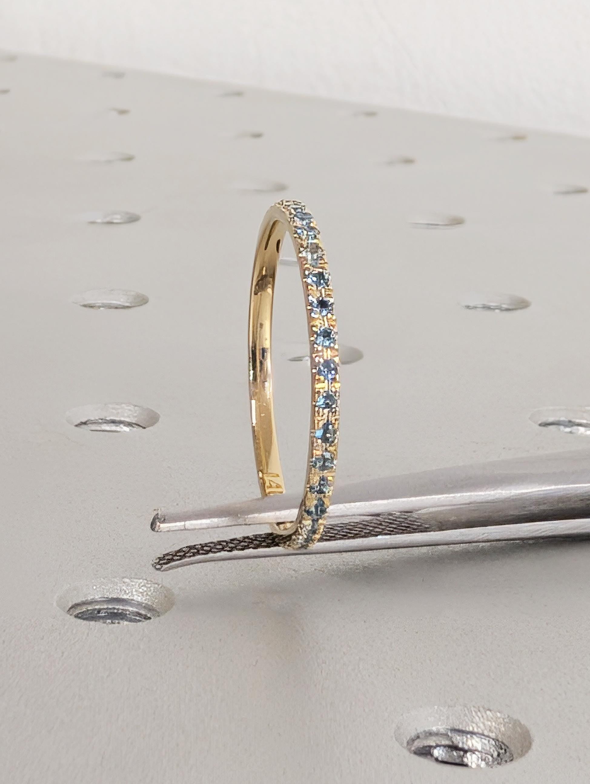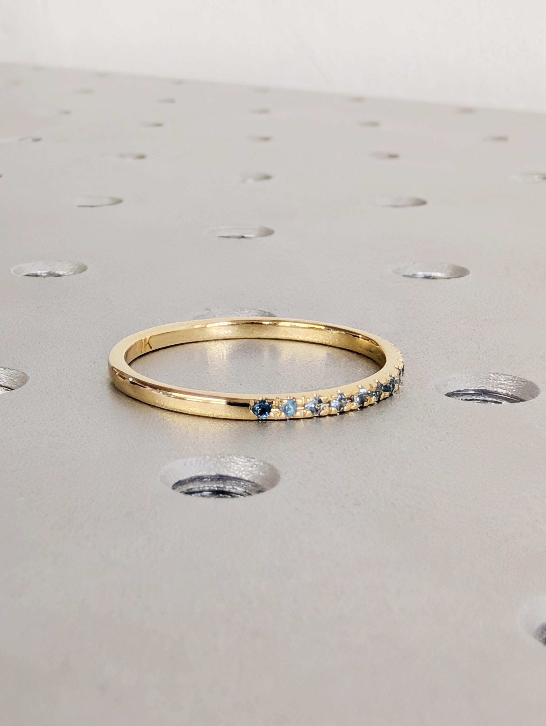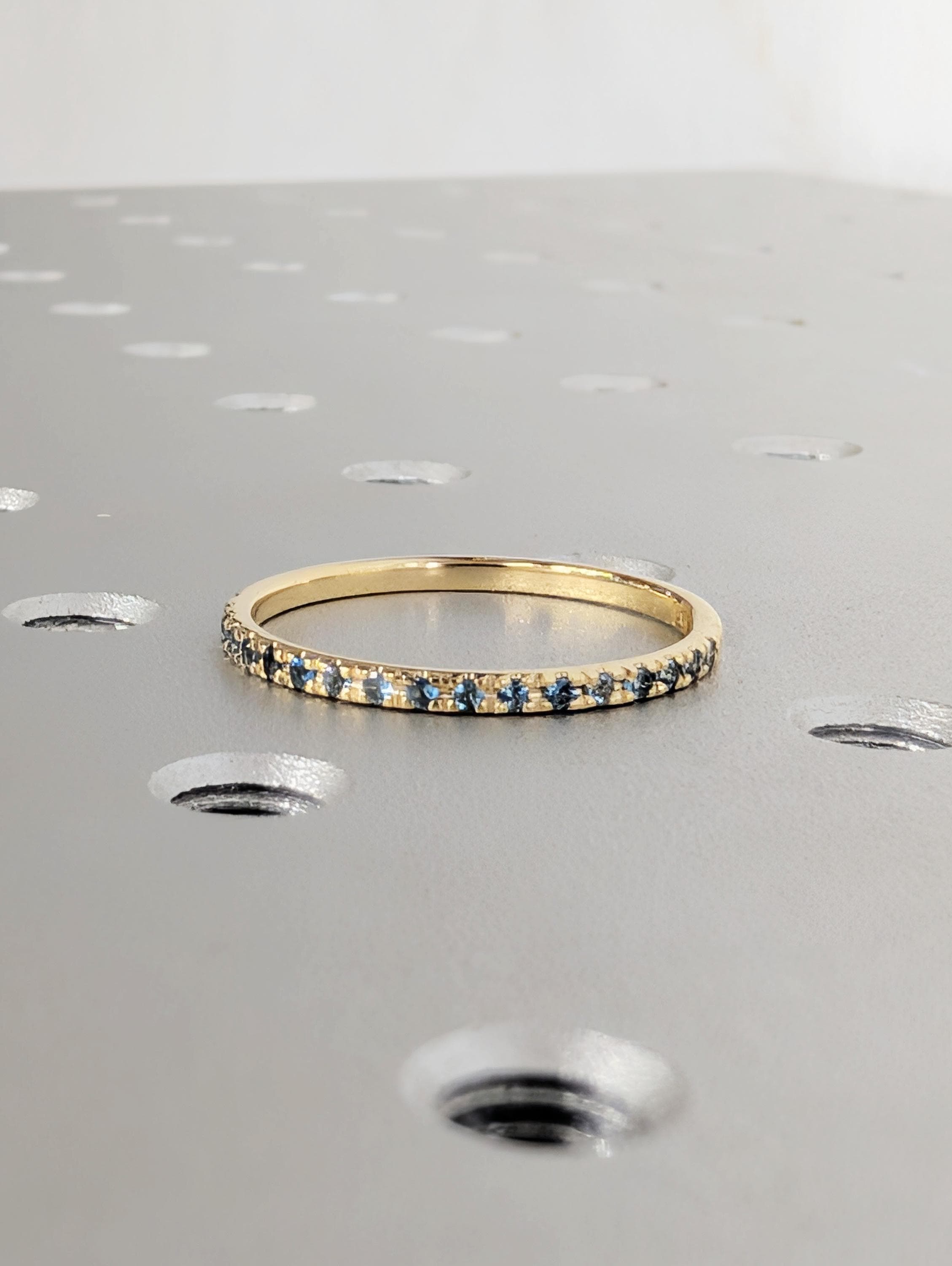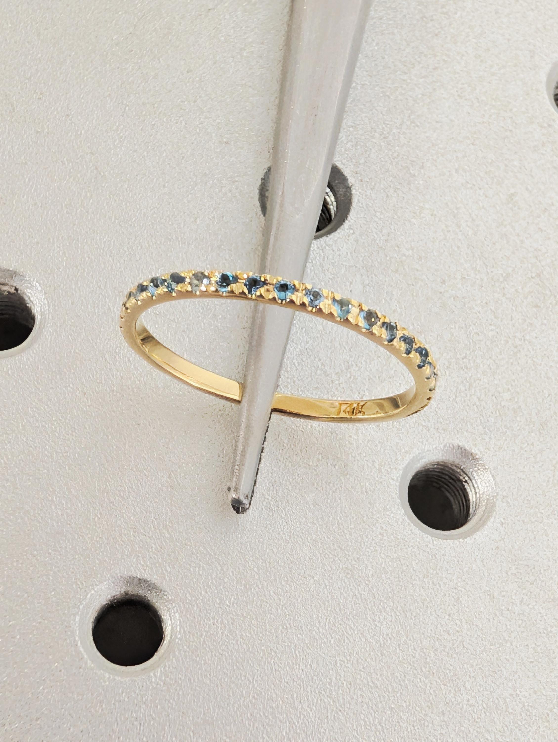 This delicate wedding band features a round of Natural Blue Topaz stones that shimmer with cool, bright blue tones. Designed to sit comfortably on its own or stack perfectly with an engagement ring, the slender band has an elegant and timeless look. The blue topaz subtle sparkle and refined style make this ring a lovely everyday piece or a meaningful symbol of love and connection.