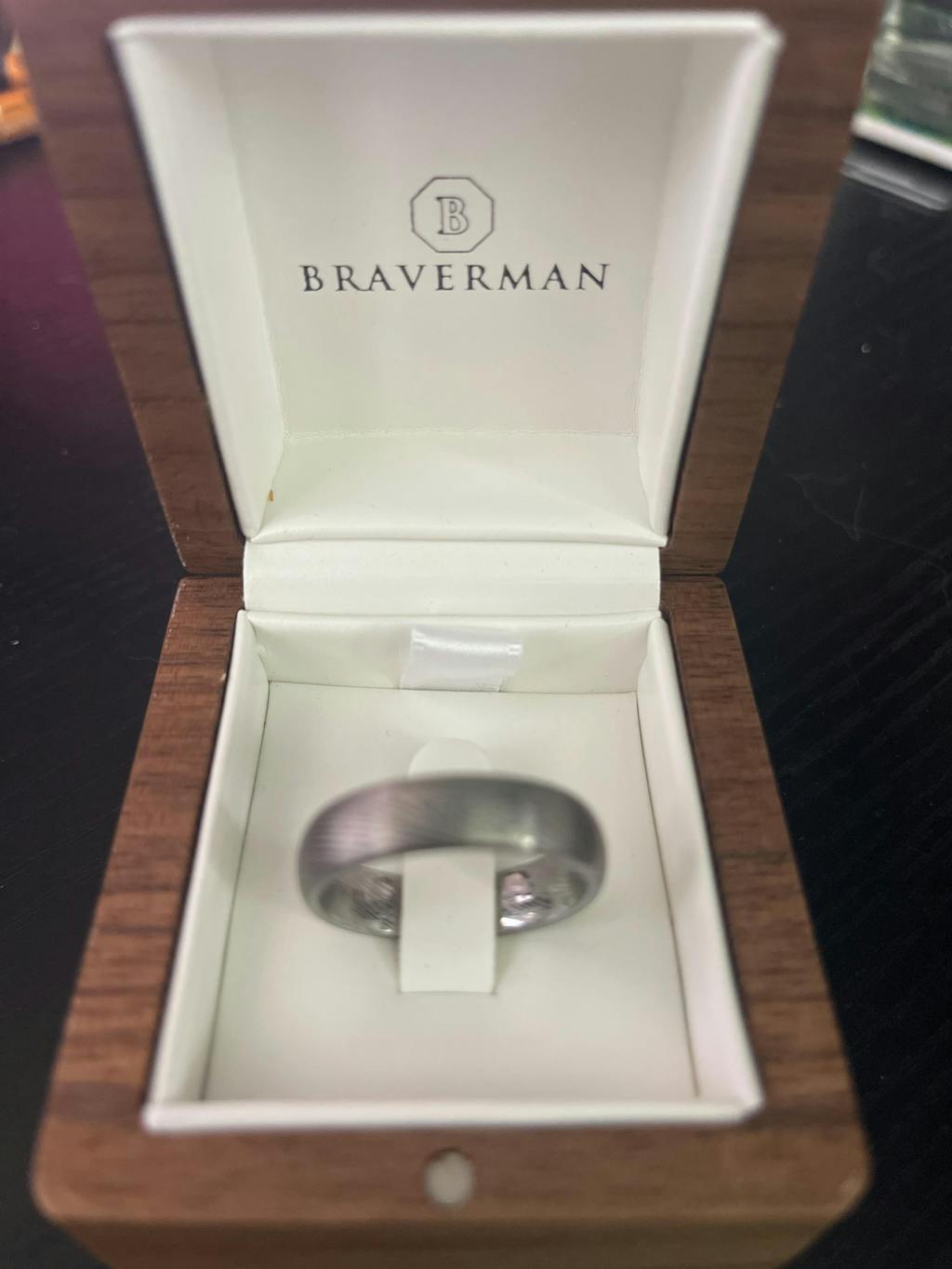 This hand made ring is crafted of the finest quality tungsten carbide. This low dome ring has mokume pattern engraving and a brushed matte finish. It's comfort fit and can be as a day to day accessory or as men’s wedding band or engagement ring.