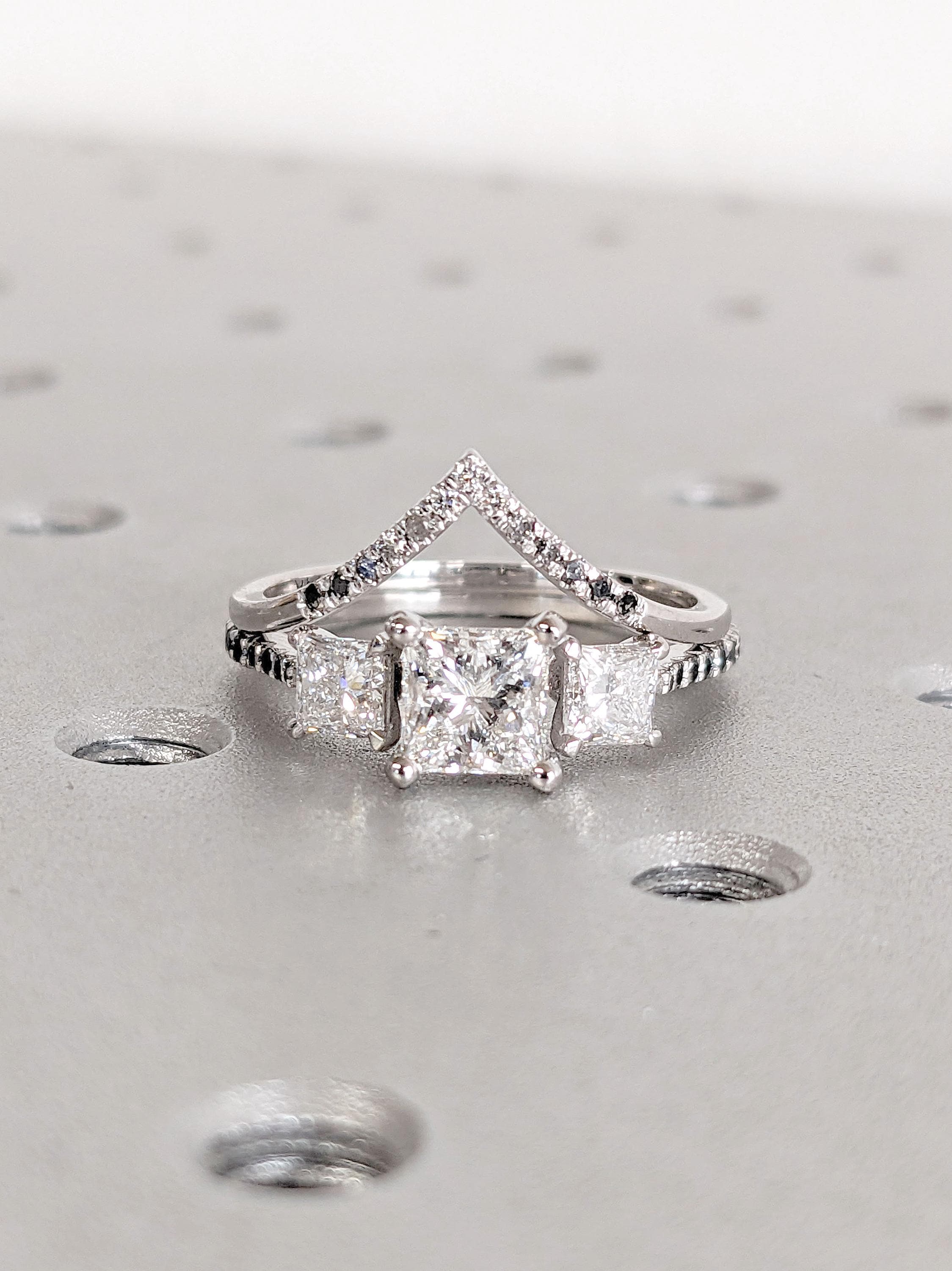 A beautiful three stone ring design, features princess cut Lab Diamond focal stone, accented by princess cut white side stones, set on a dainty half eternity band paved with tiny round black diamonds. This luxurious statement jewelry is the perfect gift for those who loves a little added sophistication to their style for any occasion.