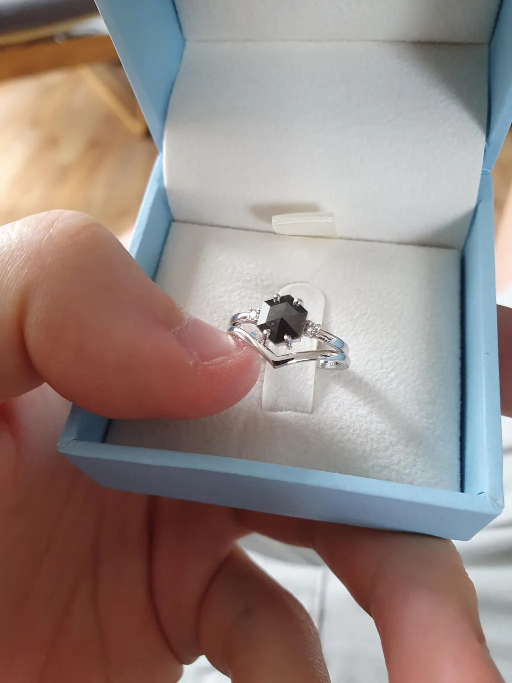 ONE-OF-A-KIND Hexagon salt and pepper diamond, solitaire ring that is just pure uniqueness, nothing that has ever been seen before.