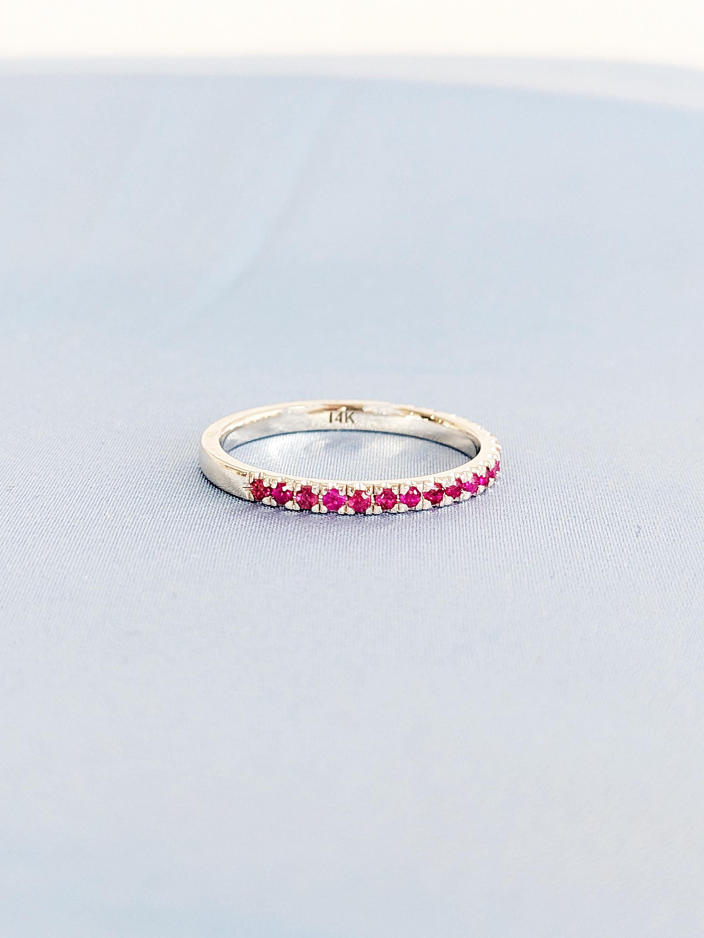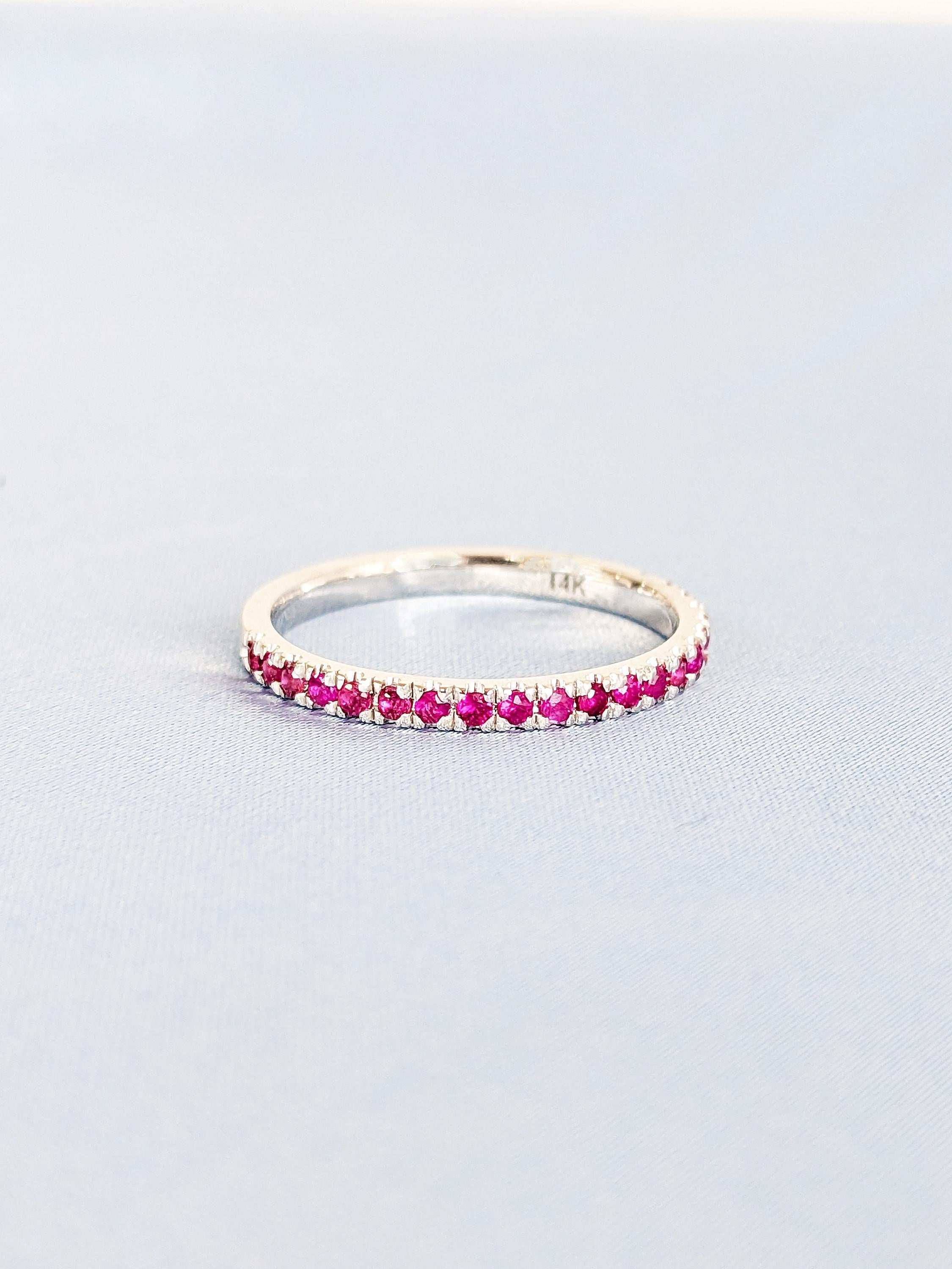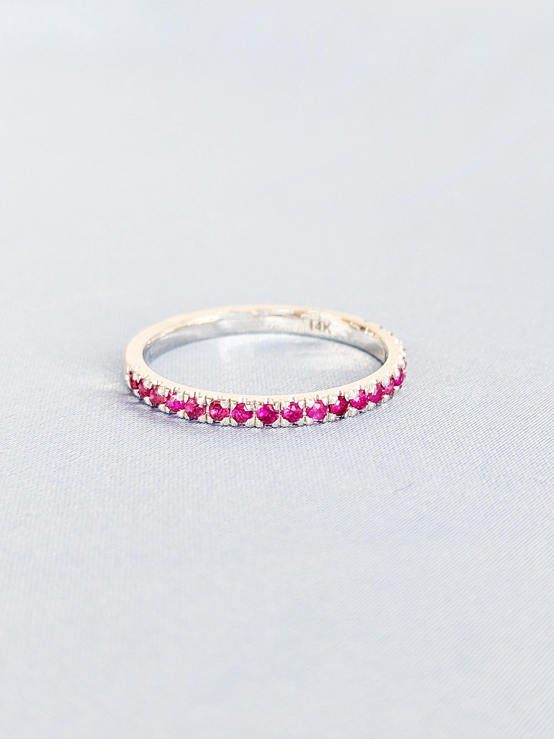 A dainty matching band adorned with round-cut rubies that add a bold pop of color. Perfect for stacking or pairing with your engagement ring, this ruby band brings timeless elegance and vibrant charm to any set.