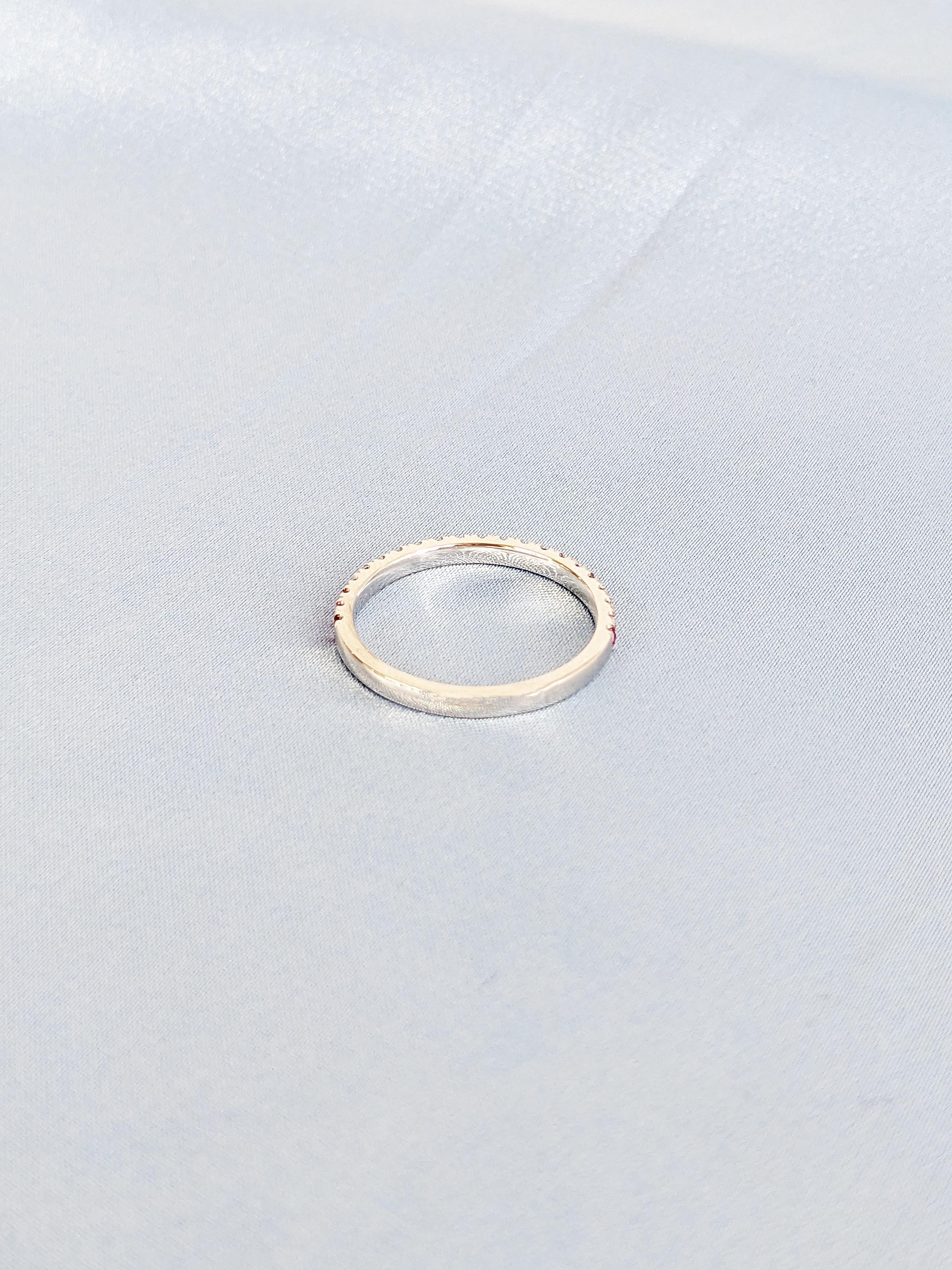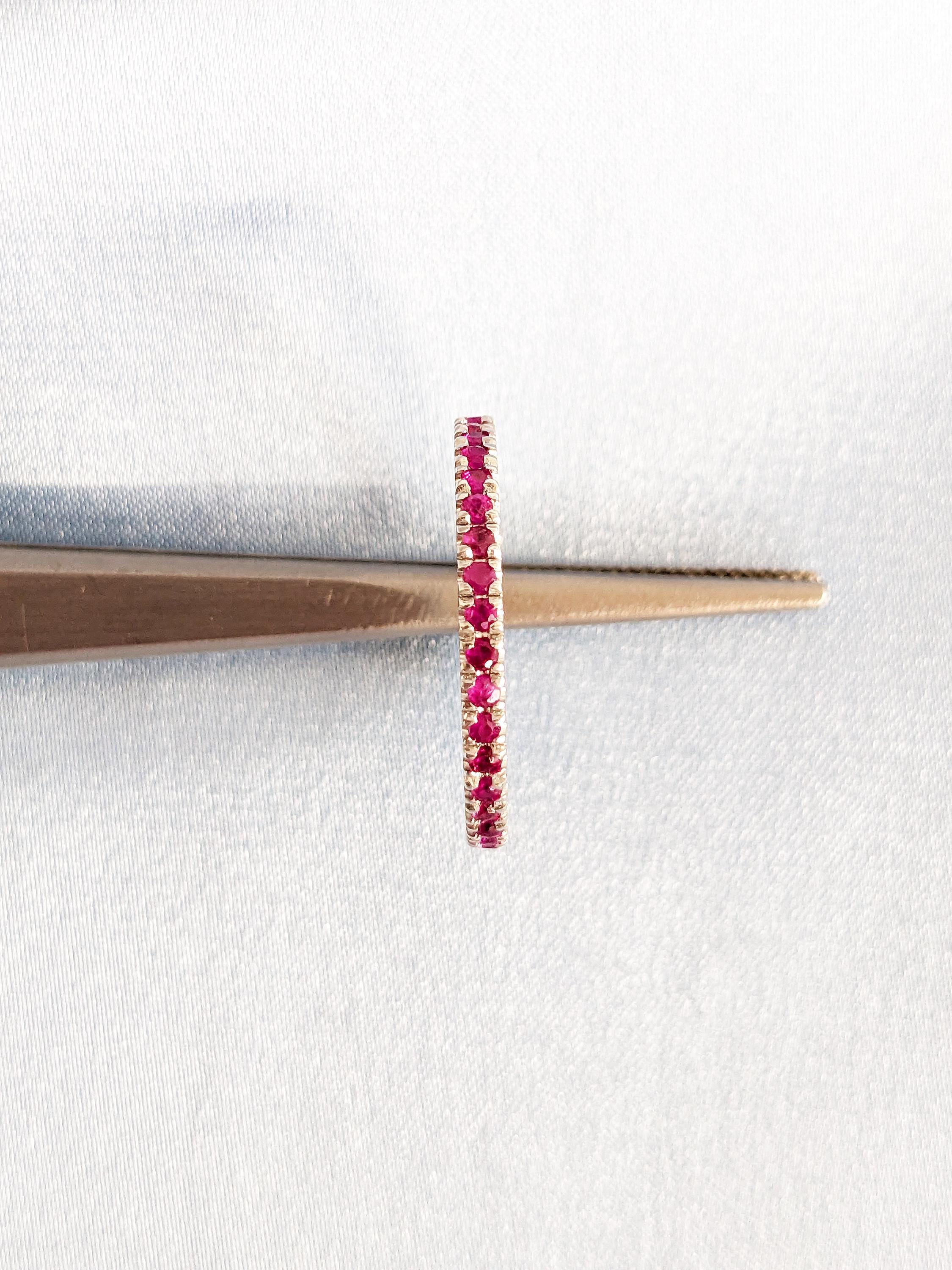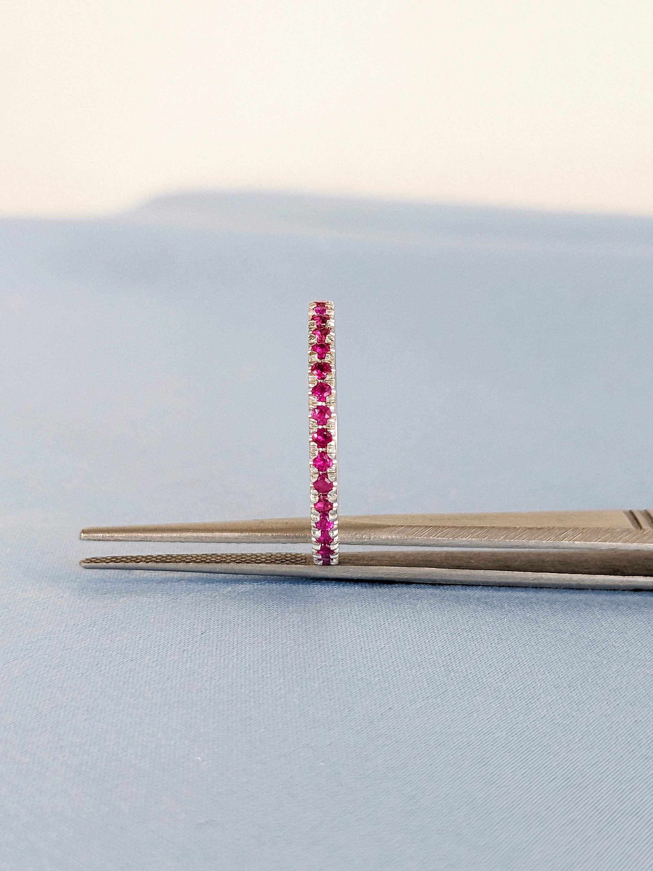 A dainty matching band adorned with round-cut rubies that add a bold pop of color. Perfect for stacking or pairing with your engagement ring, this ruby band brings timeless elegance and vibrant charm to any set.