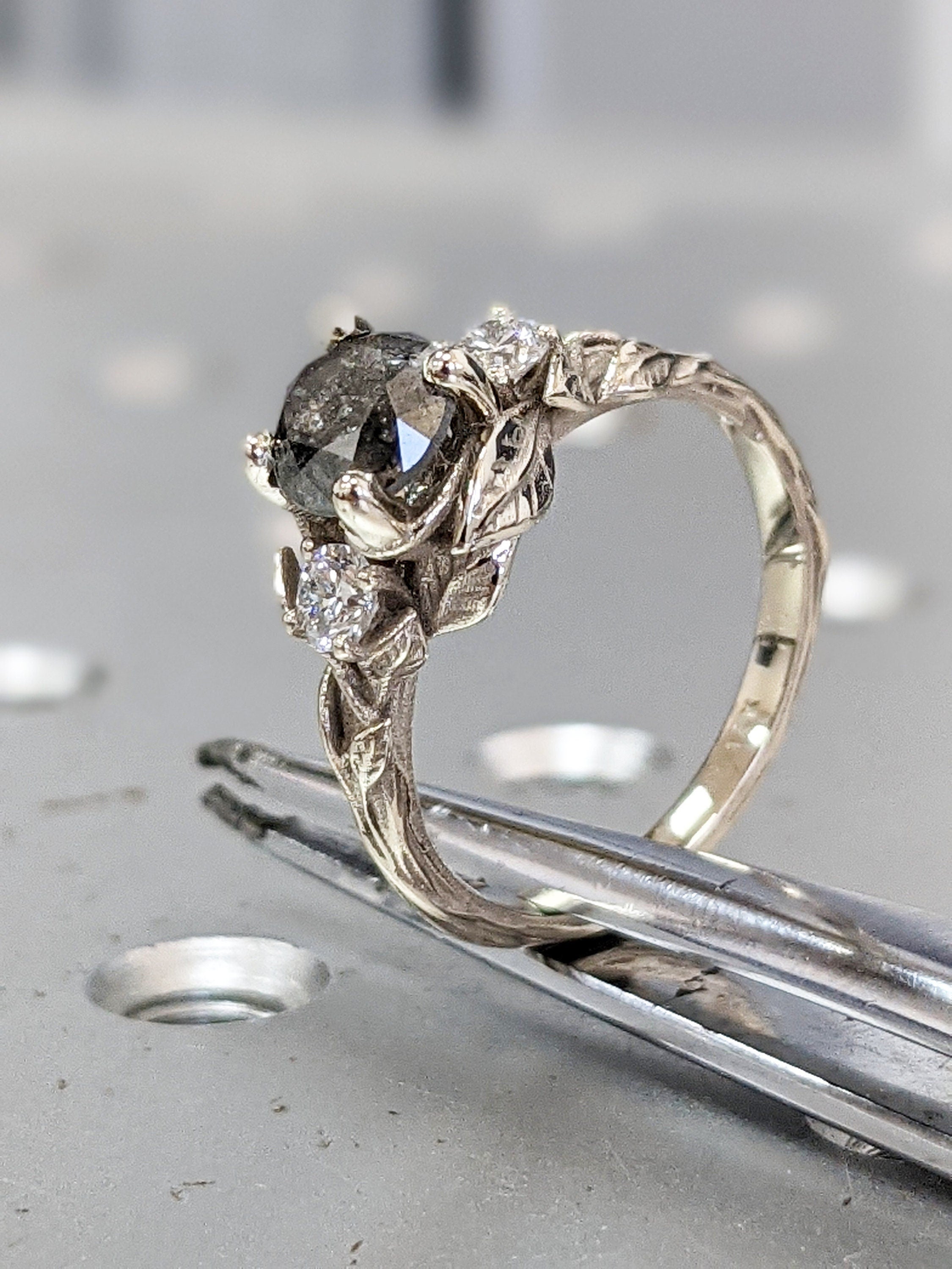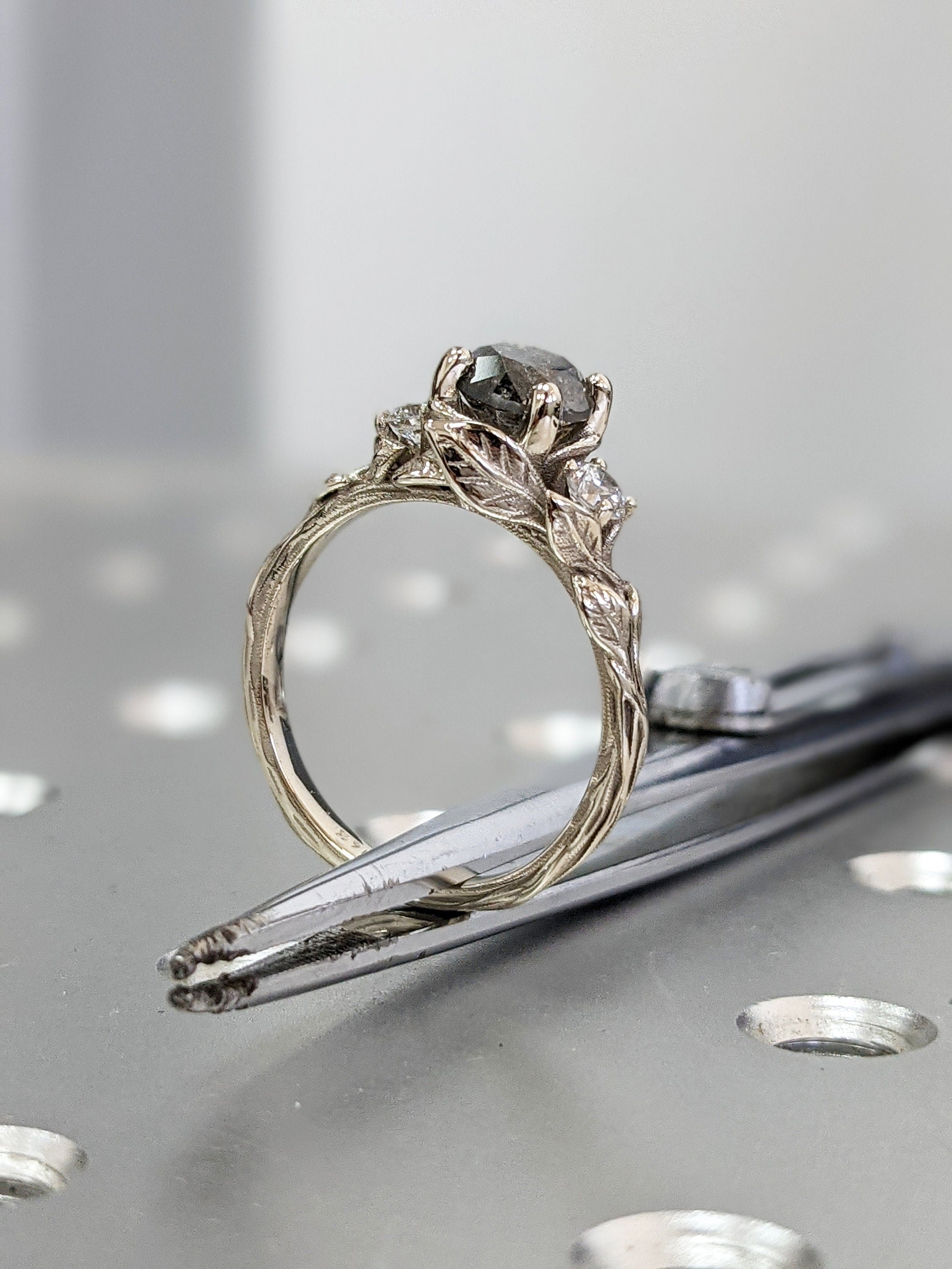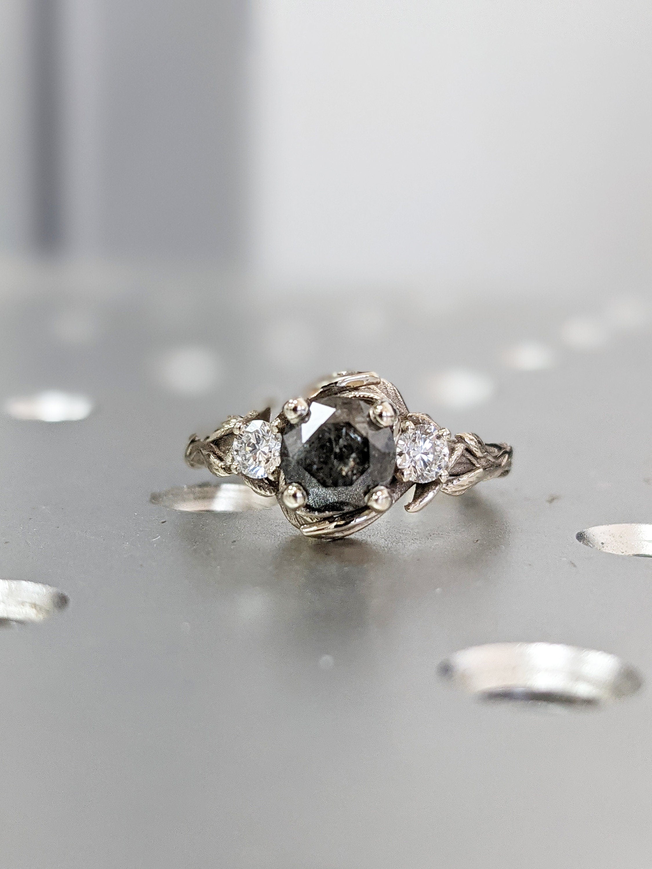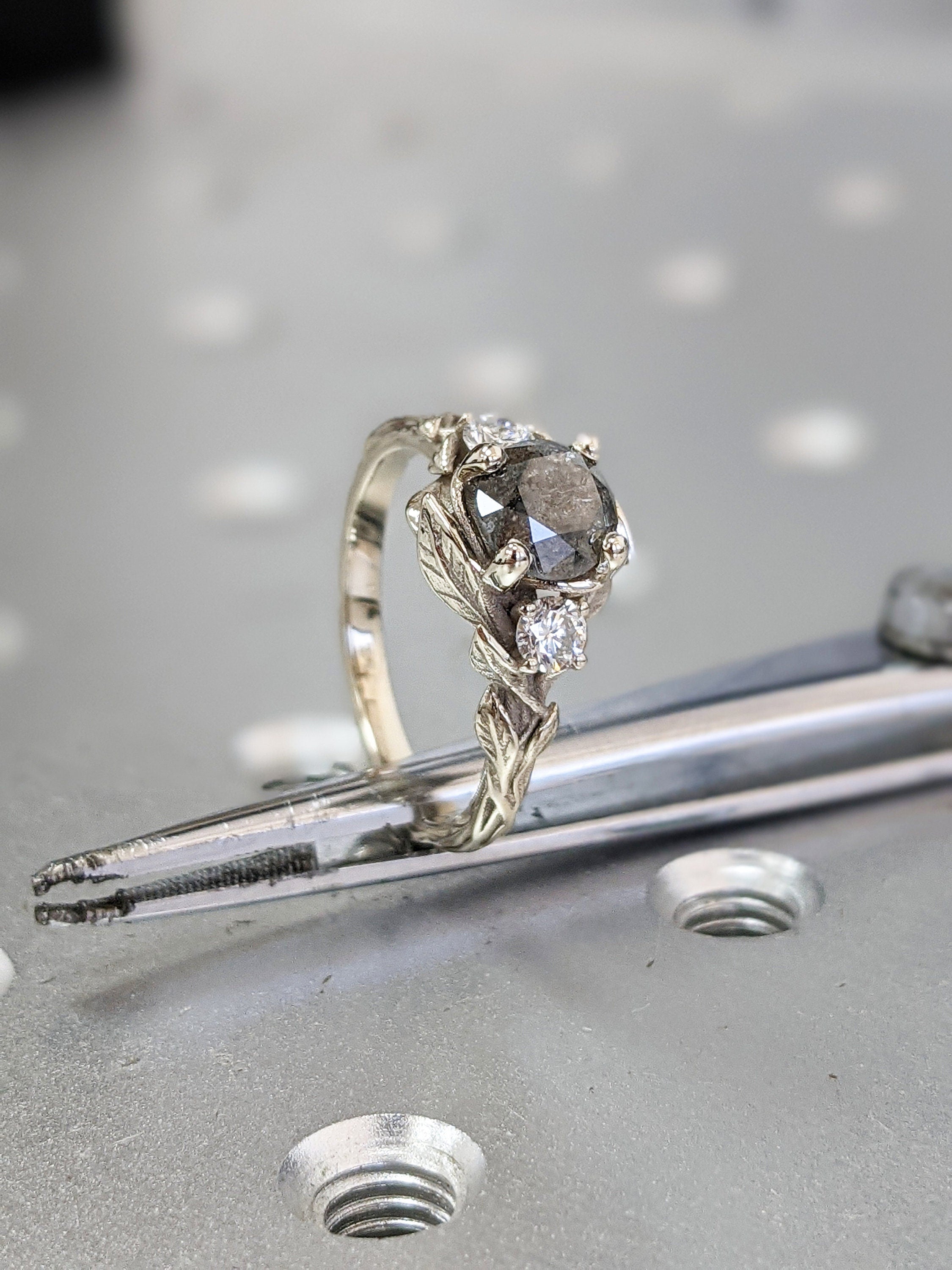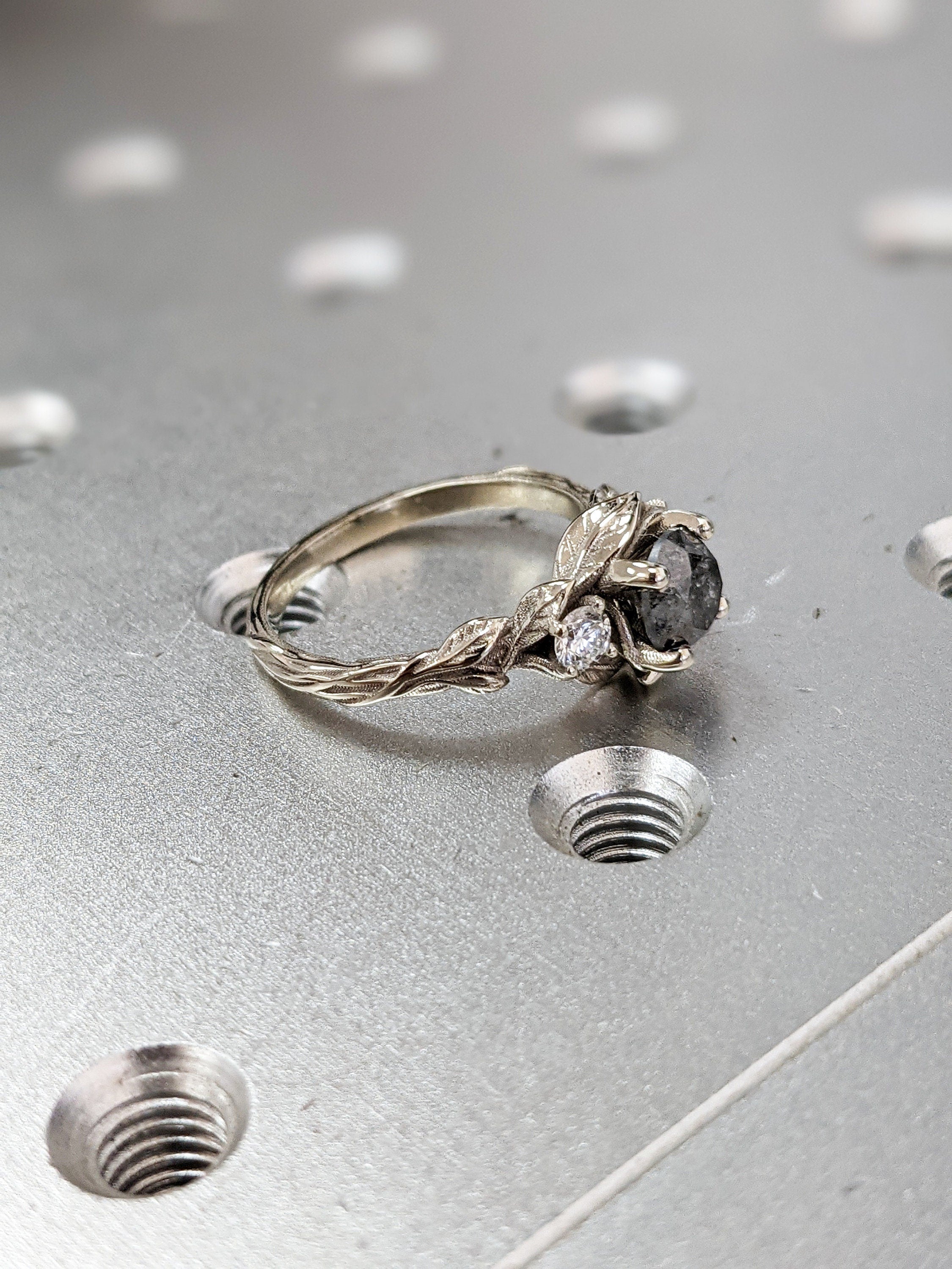 Natural Salt and Pepper Diamond Promise Ring: Solid White Gold Band with Leaf and Branch Engraving