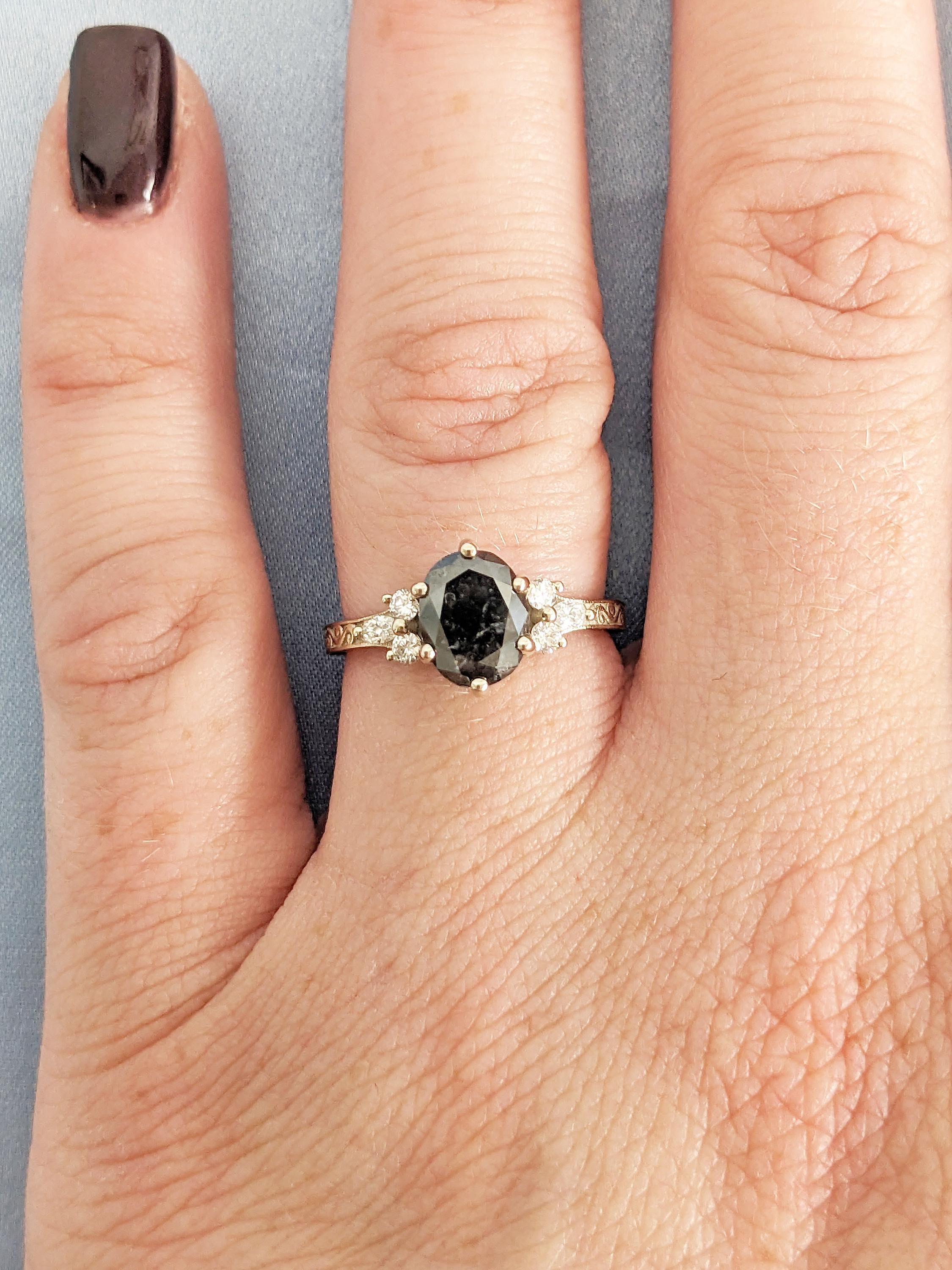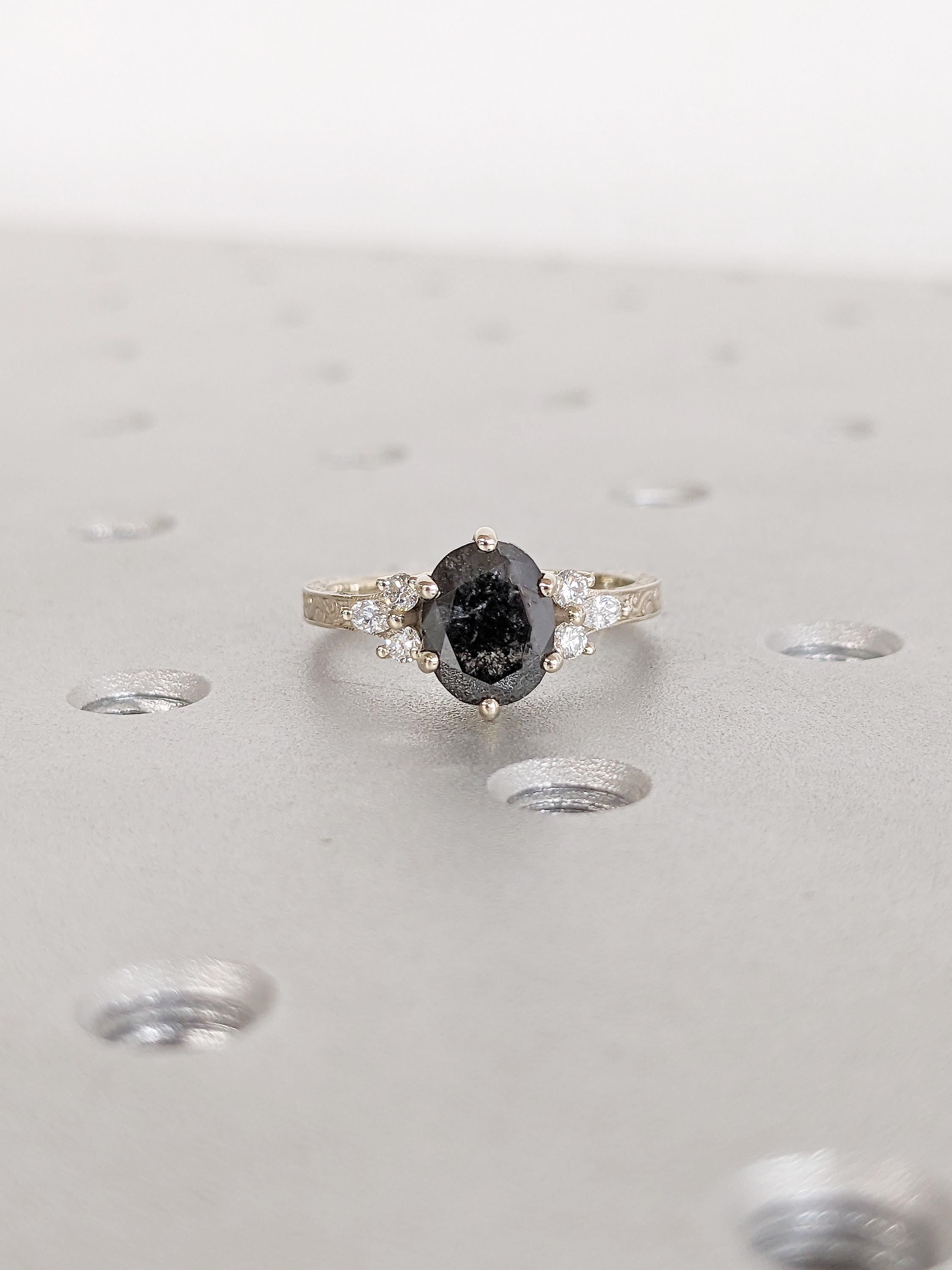 This engagement ring showcases an oval Salt and Pepper Diamond, accented with round and marquise side stones available in Natural Diamonds, Lab Grown Diamonds, or Moissanites. The band features elegant filigree design detailing, creating a unique blend of character and timeless elegance.