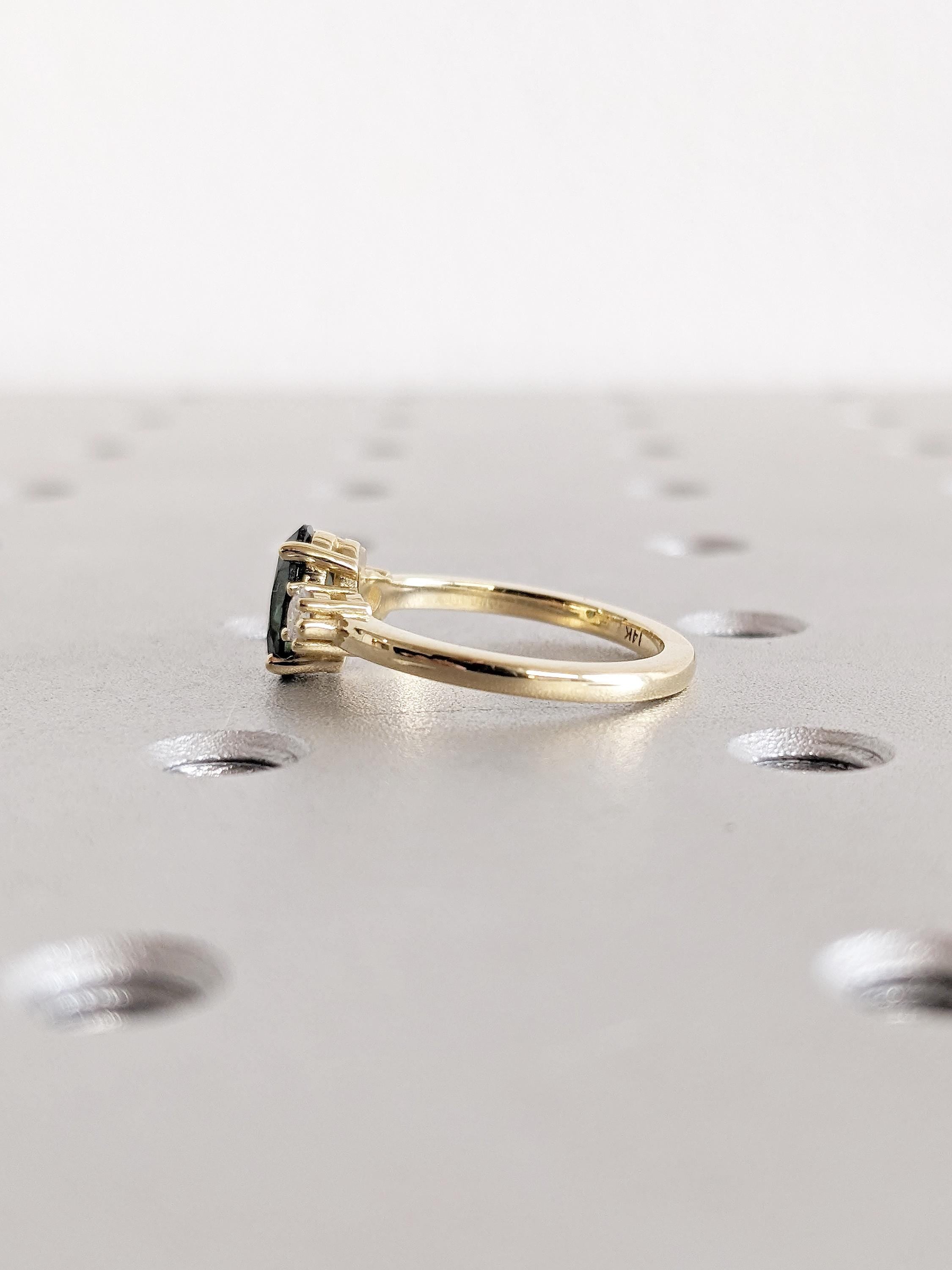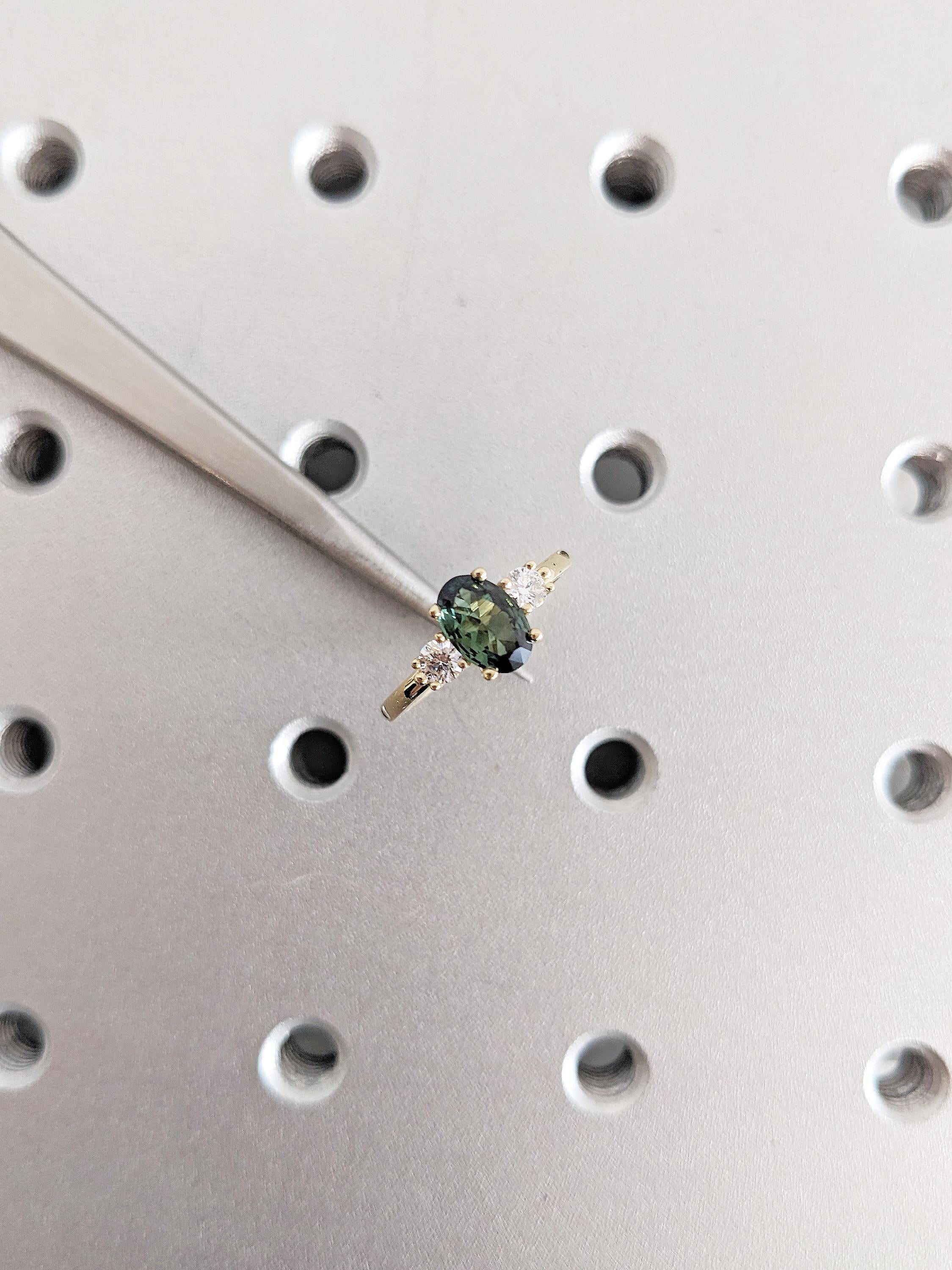 This elegant engagement ring features a captivating oval cut Green Natural Sapphire at its center, radiating earthy charm and timeless beauty. On each side, a single round cut stone, available in Natural Diamond, Lab Grown Diamond, or Moissanite, adds a touch of brilliance and balance. A refined yet striking design, perfect for celebrating love that’s as unique as it is enduring.