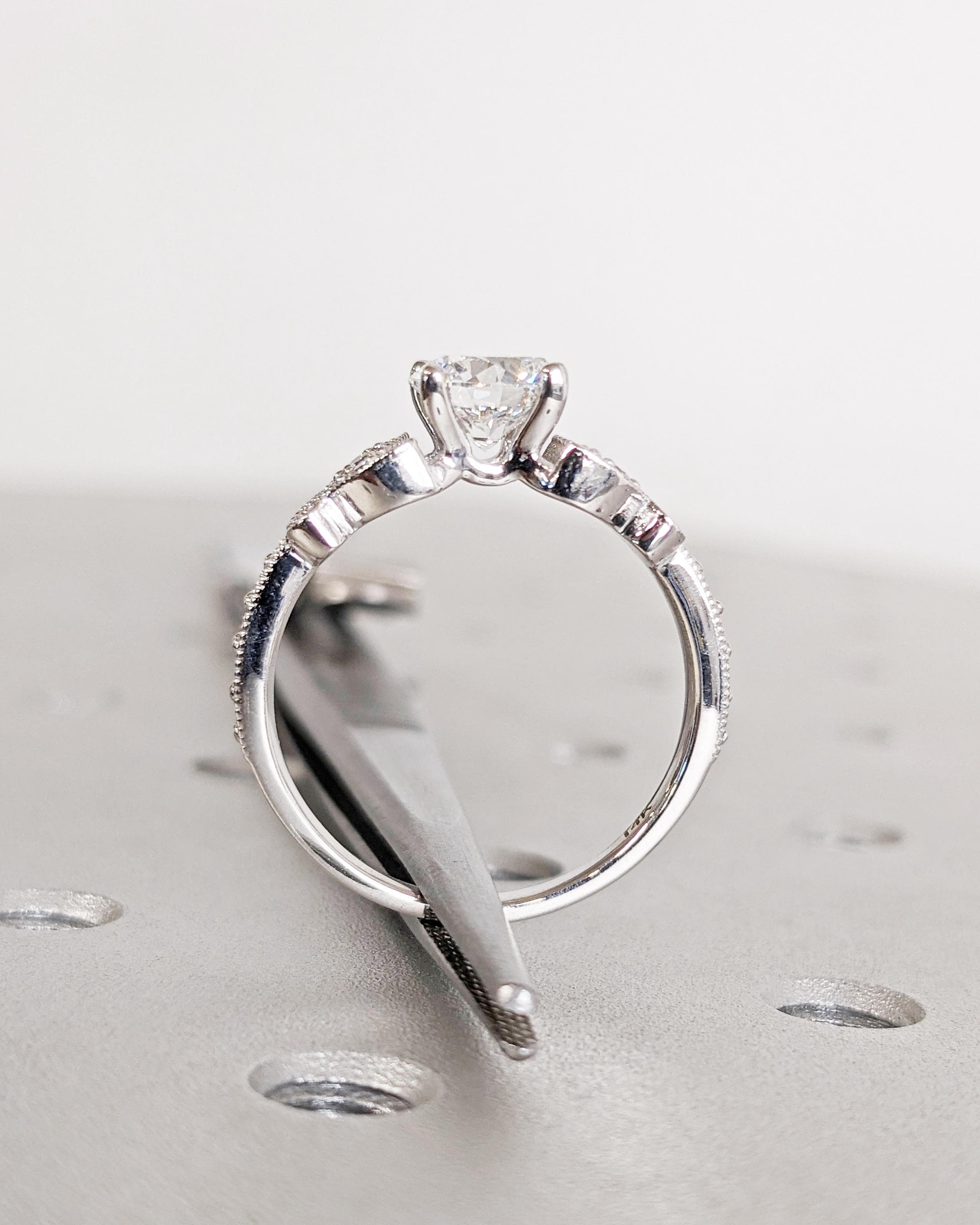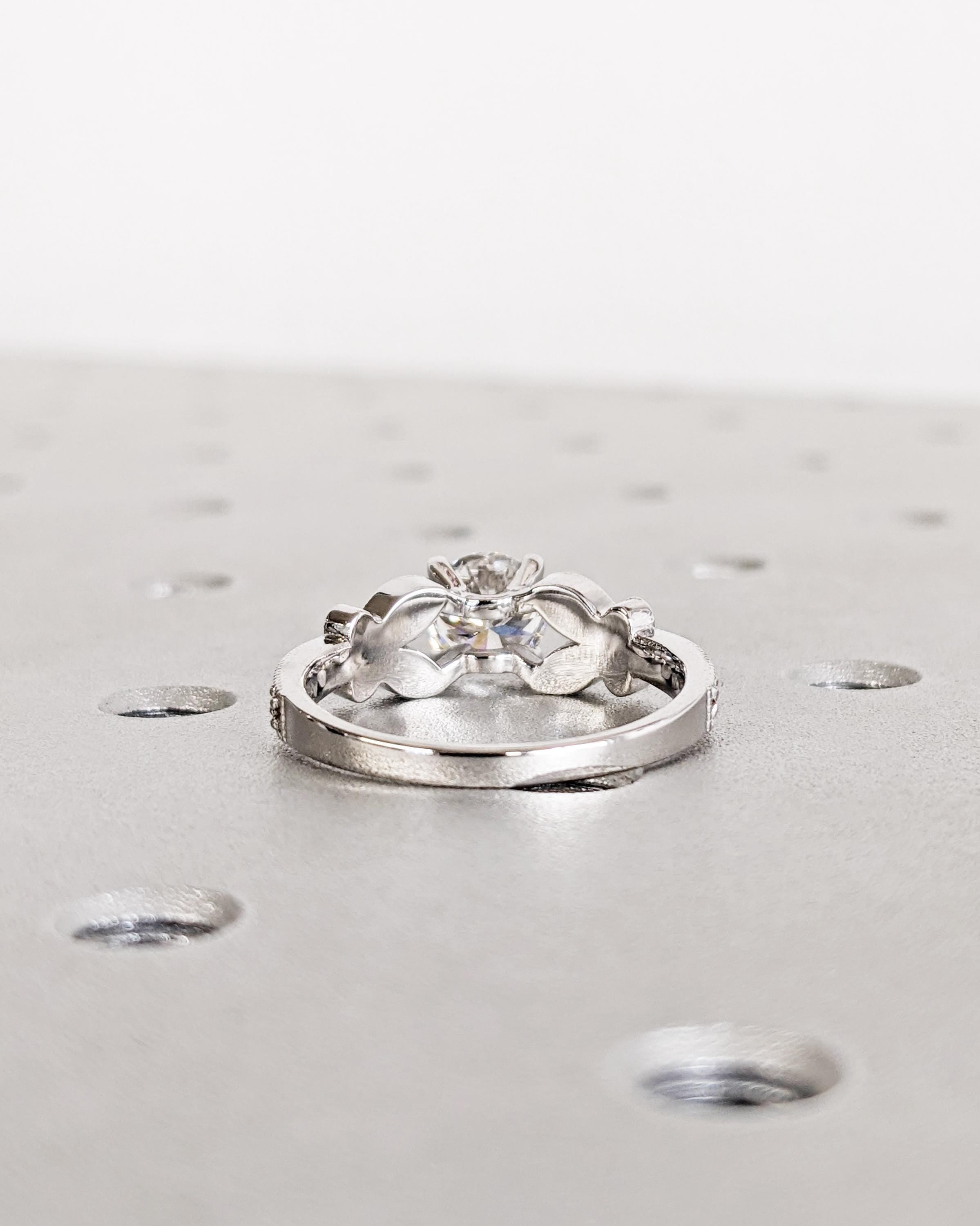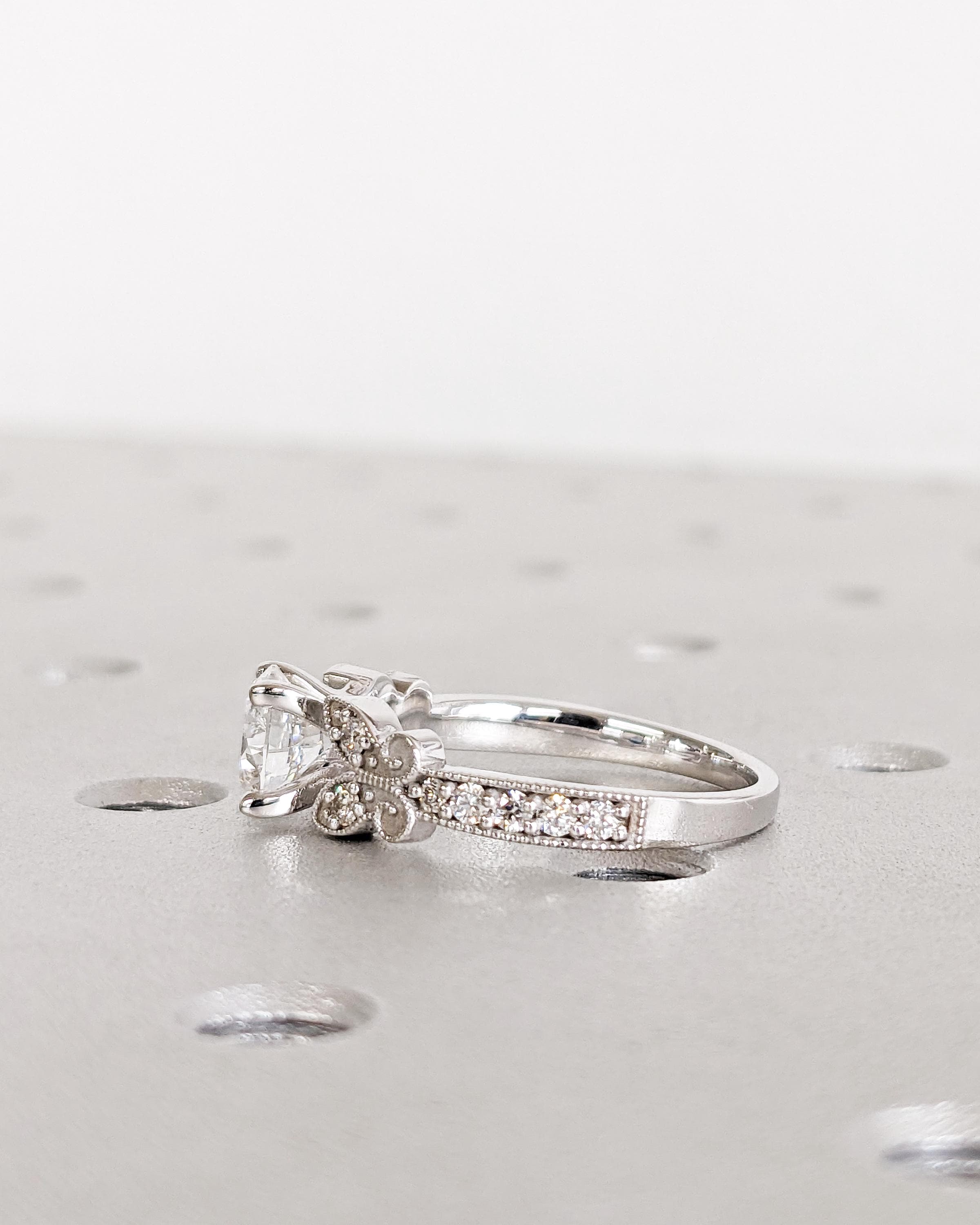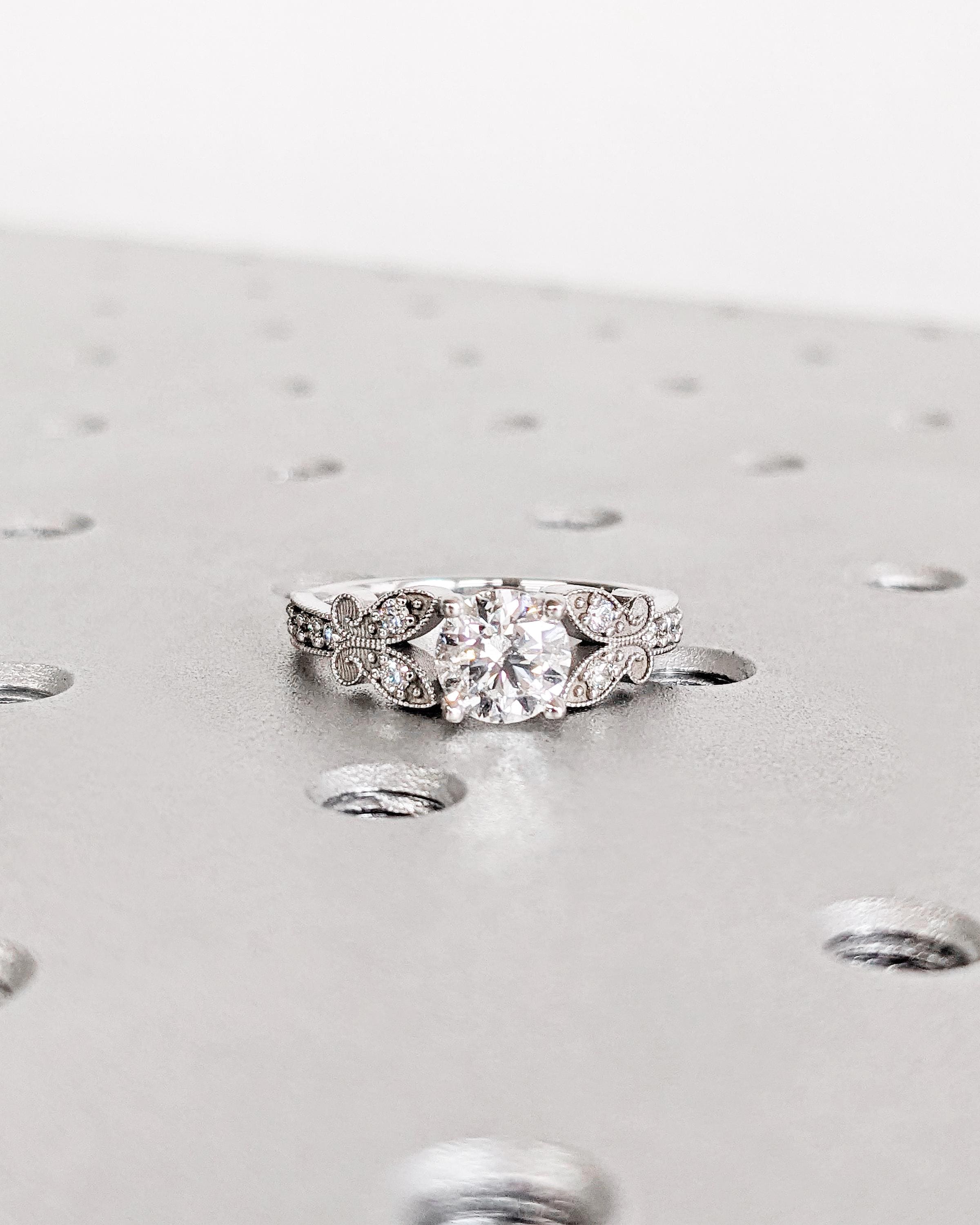 A vintage-inspired butterfly motif sets this engagement ring apart, with a round center stone at its heart. Sparkling pavé side stones and ornate milgrain borders bring the butterflies to life on each side. Customize your design with lab diamond or moissanite accents. A nature-inspired symbol of love, transformation, and beauty.