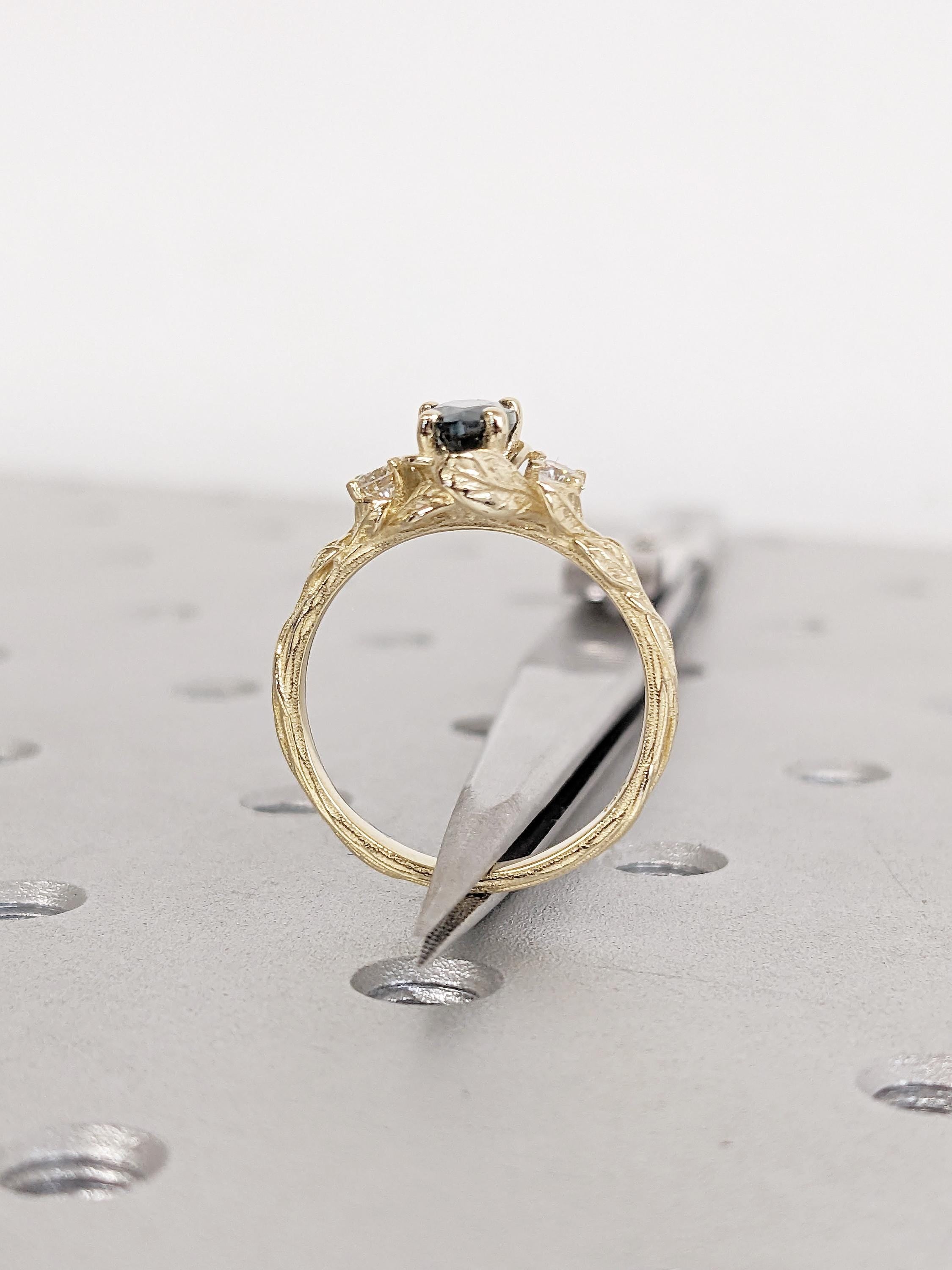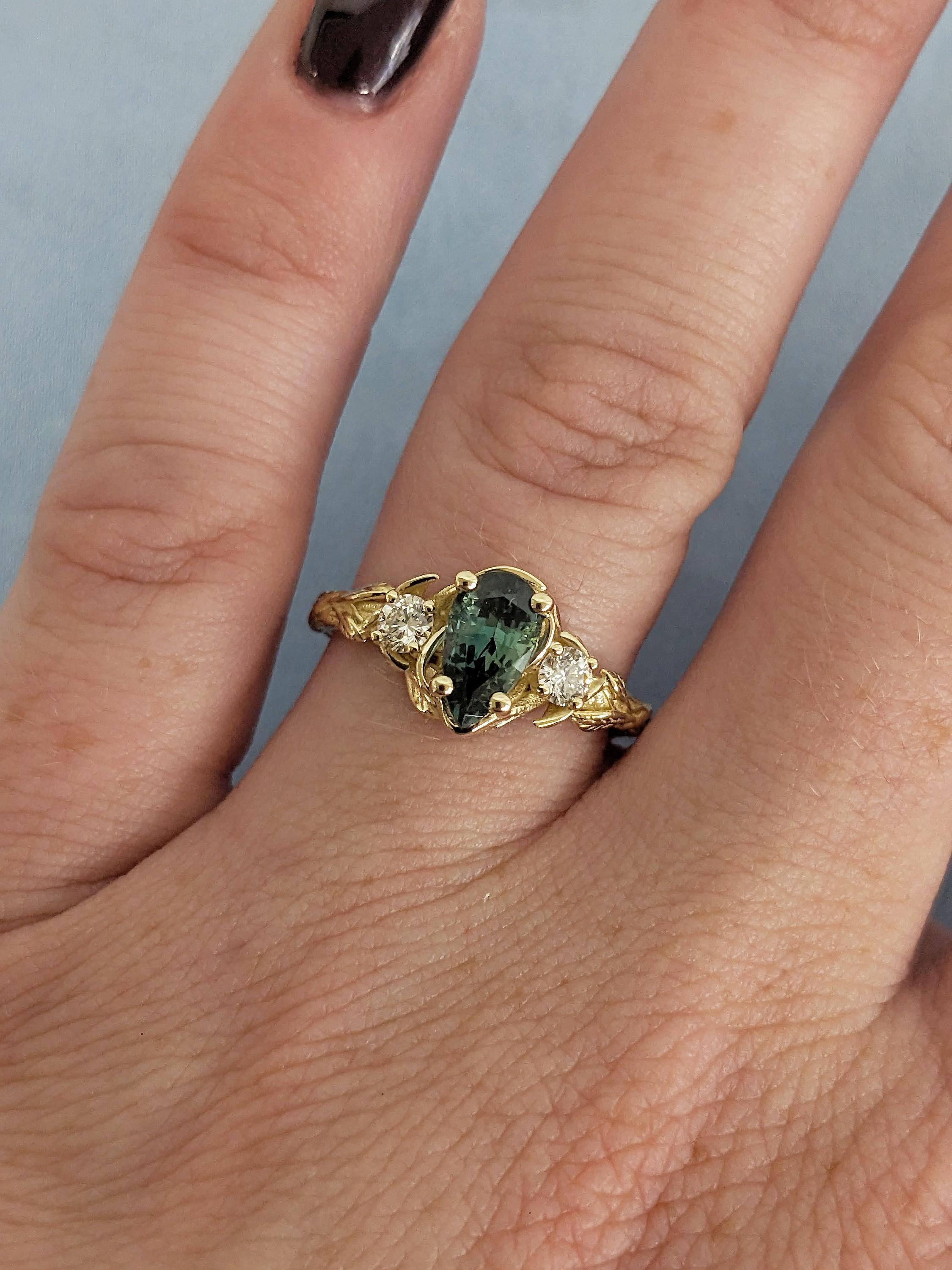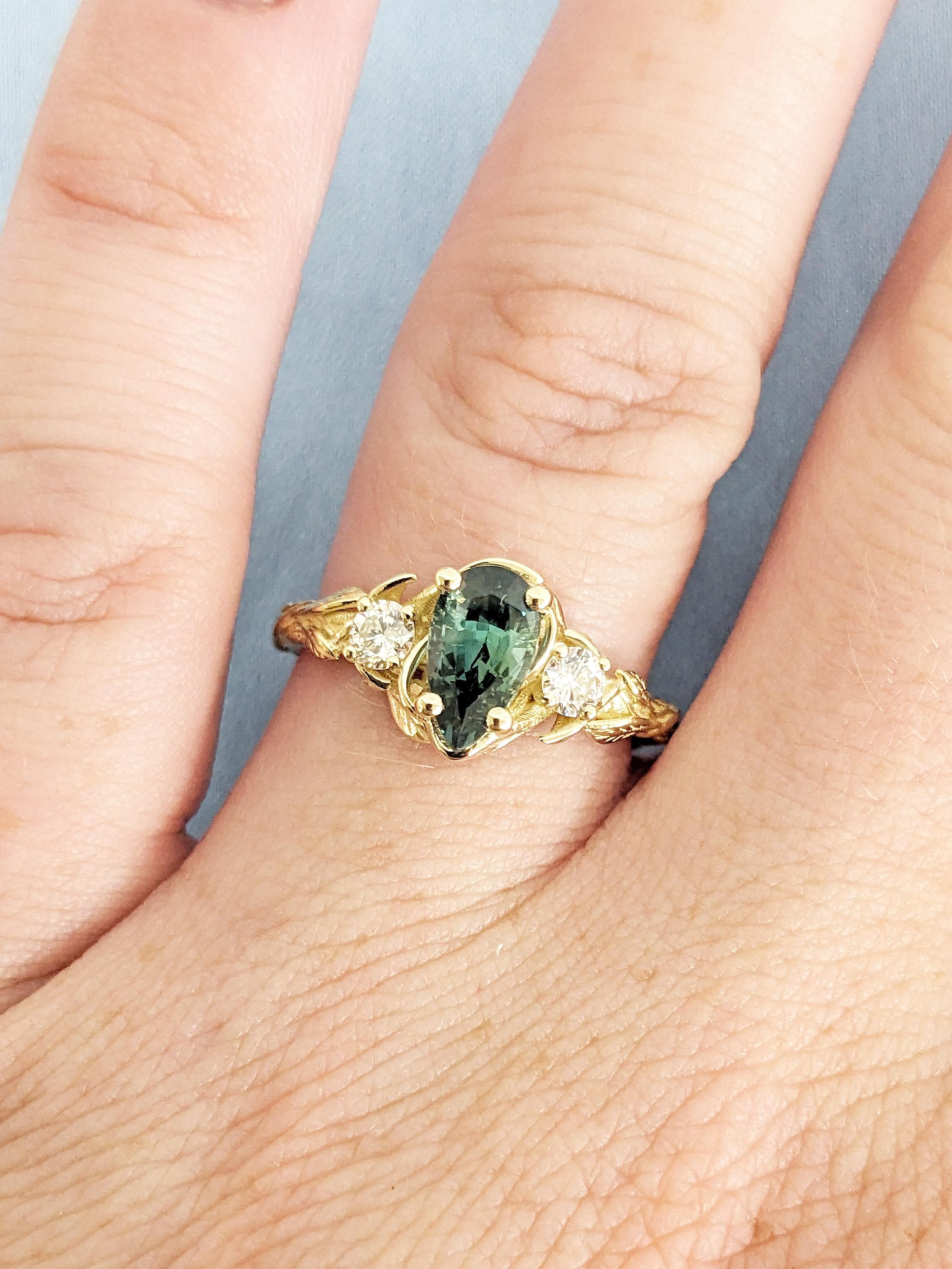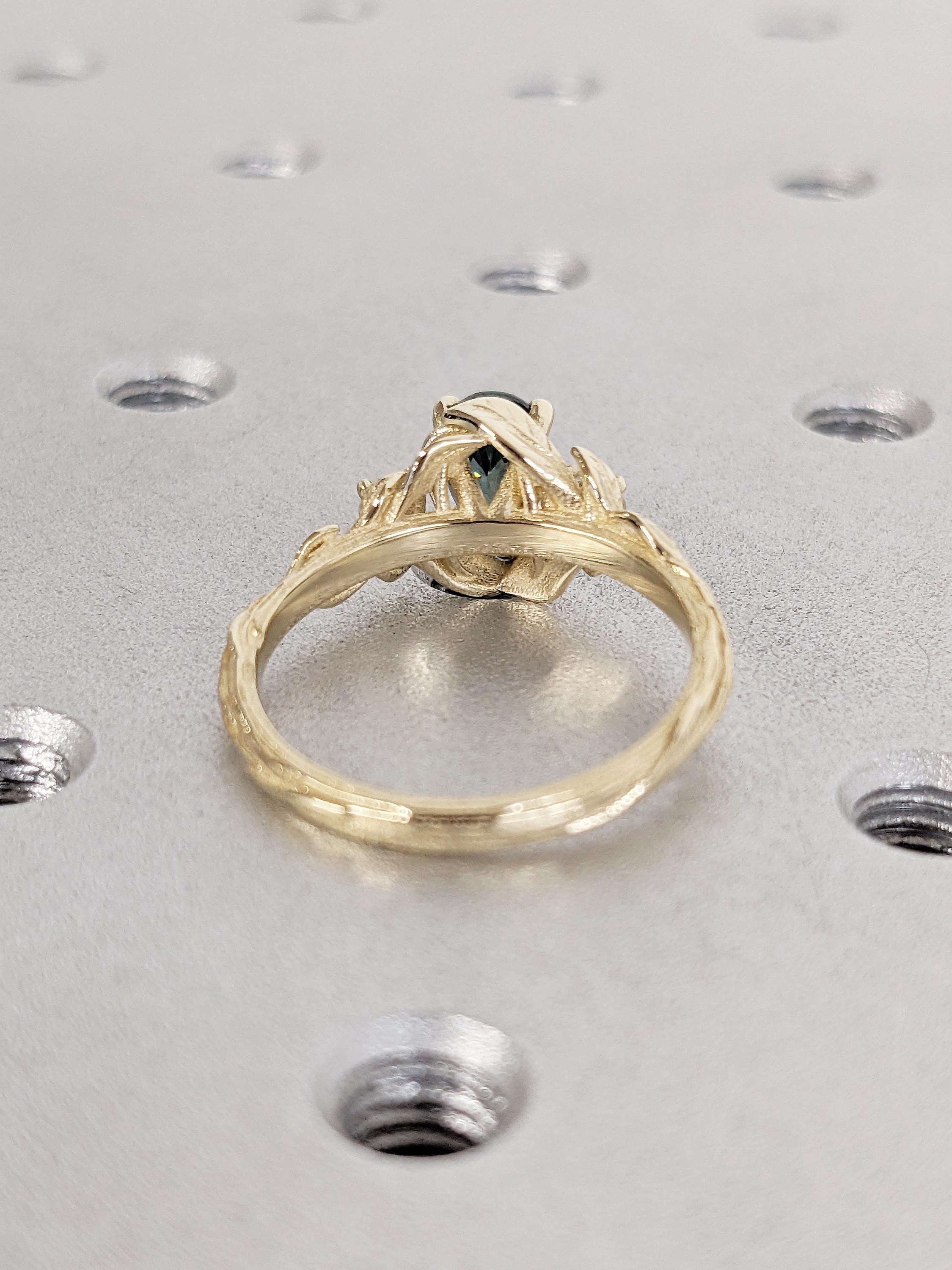 Nature Inspired Engagement Ring, 14k Solid Gold Pear Cut Teal Sapphire Ring for Women