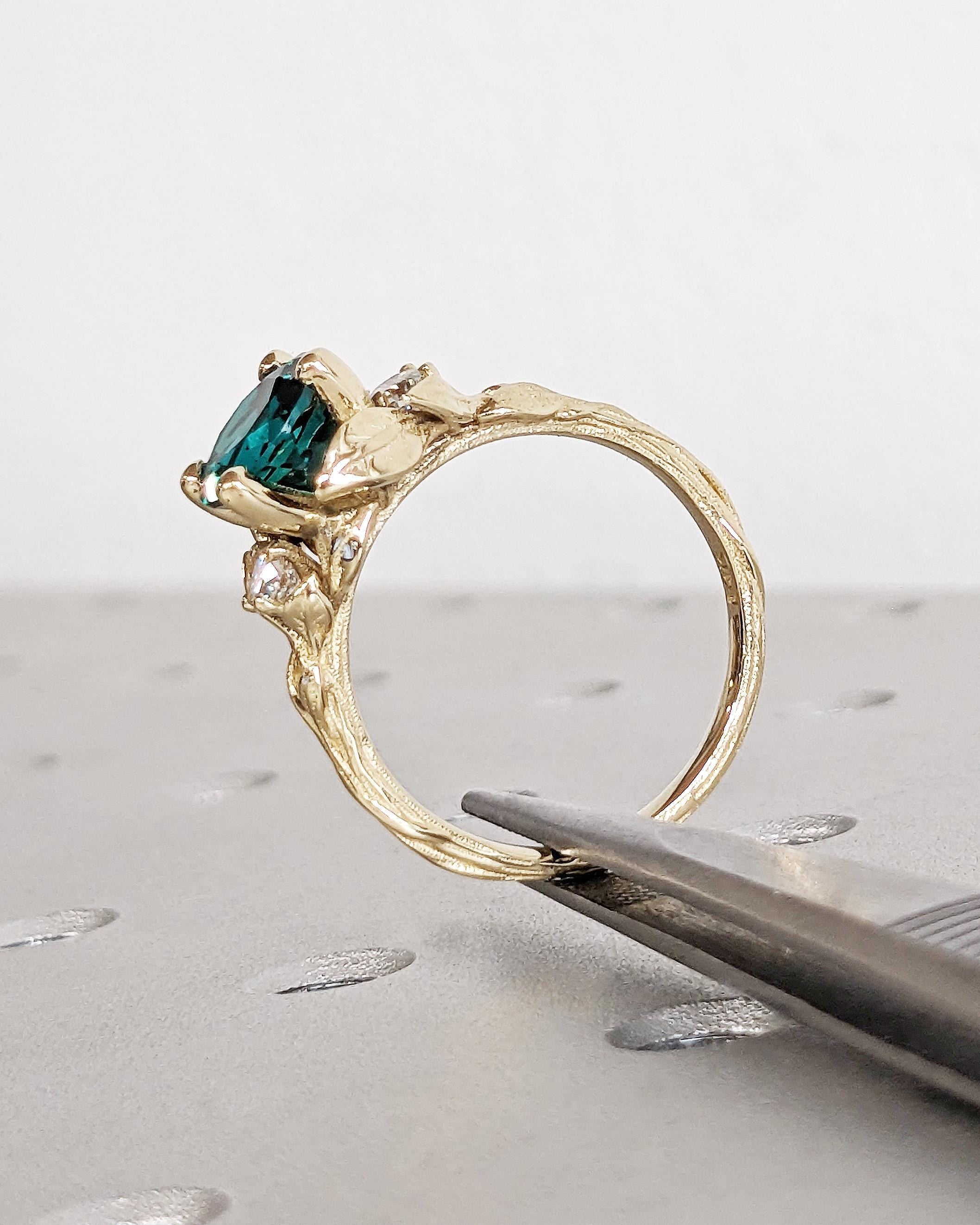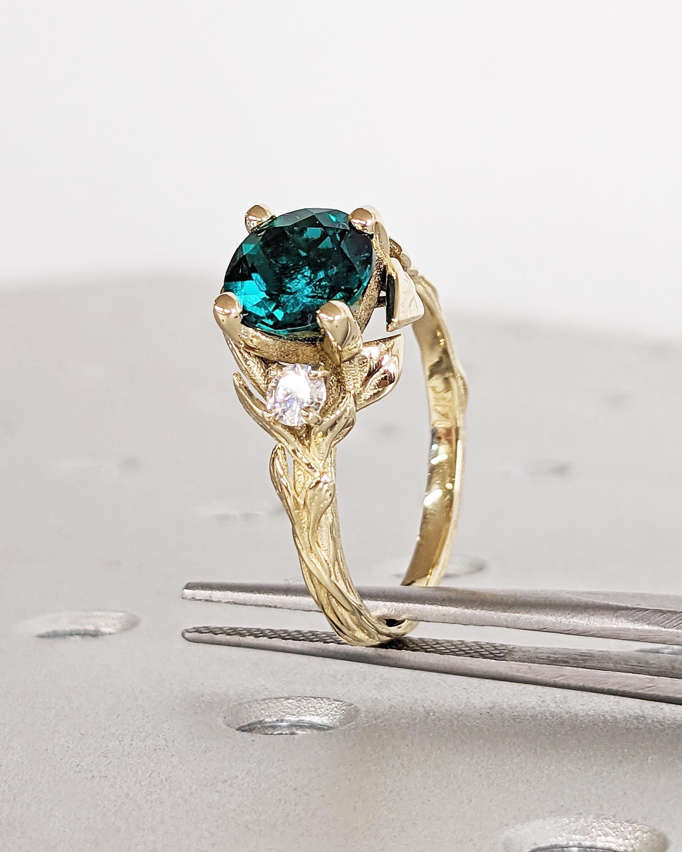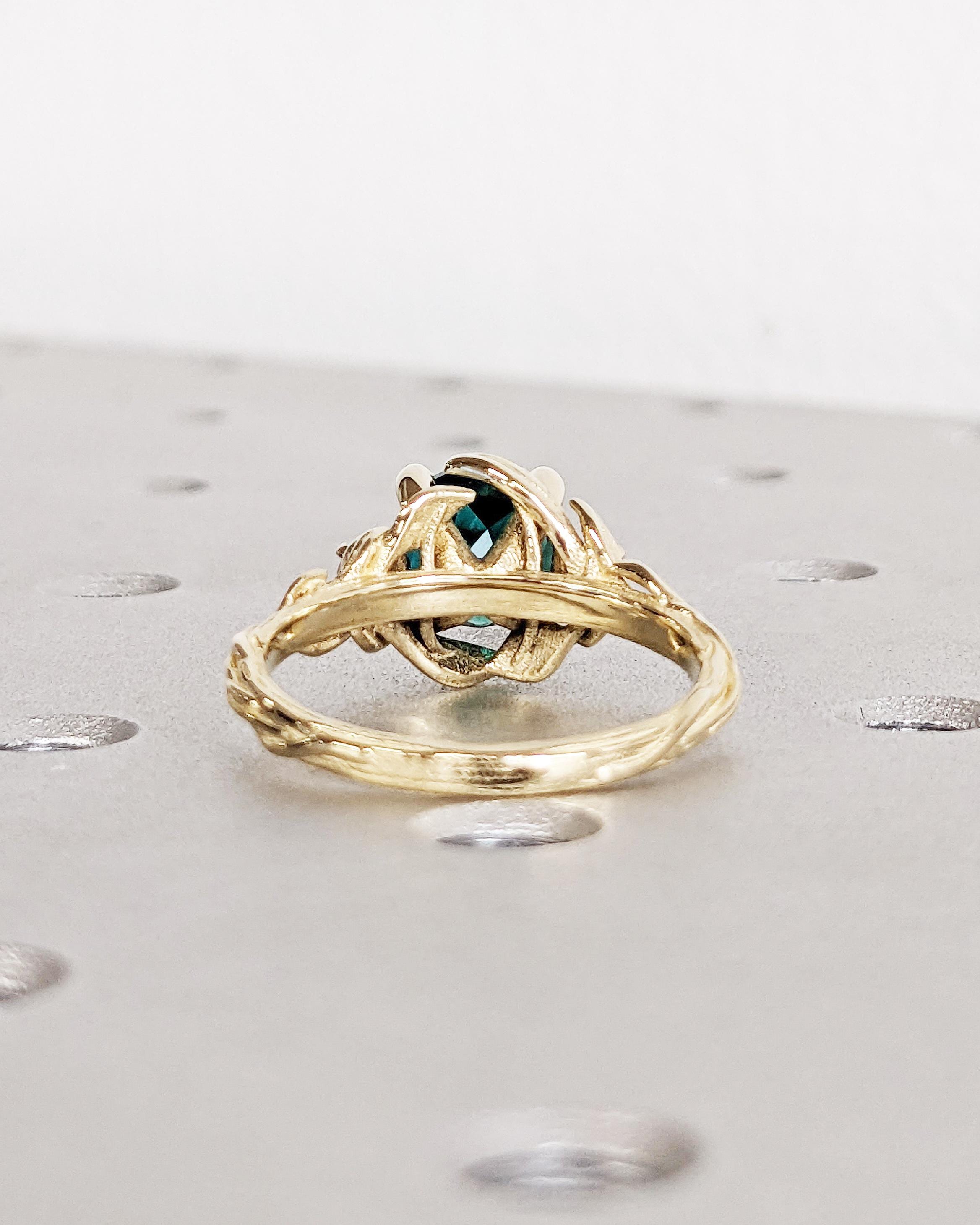 Nature Inspired Green Lab Emerald Engagement Ring Leaves Band, Moissanite Diamond Wedding Ring Leaf Vine Branch, Alternative Engagement Ring