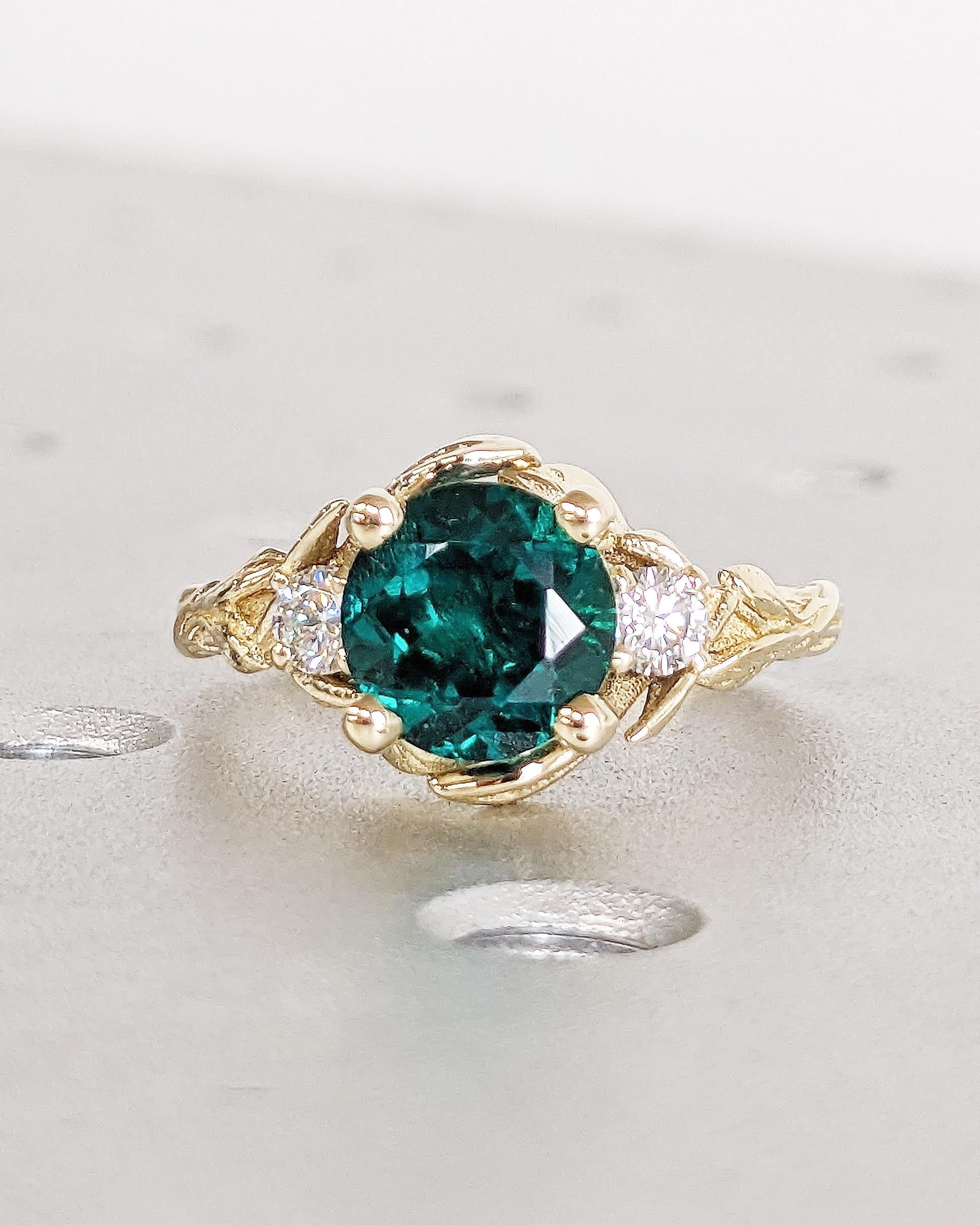 Graceful stems sinuate towards the central round cut Lab Grown Emerald setting, which is framed by elegant lily flowers in this vintage, nature inspired engagement ring set with diamond or moissanite accents. This rustic handcrafted piece looks great as a bridal jewellery or art deco statement cocktail ring.