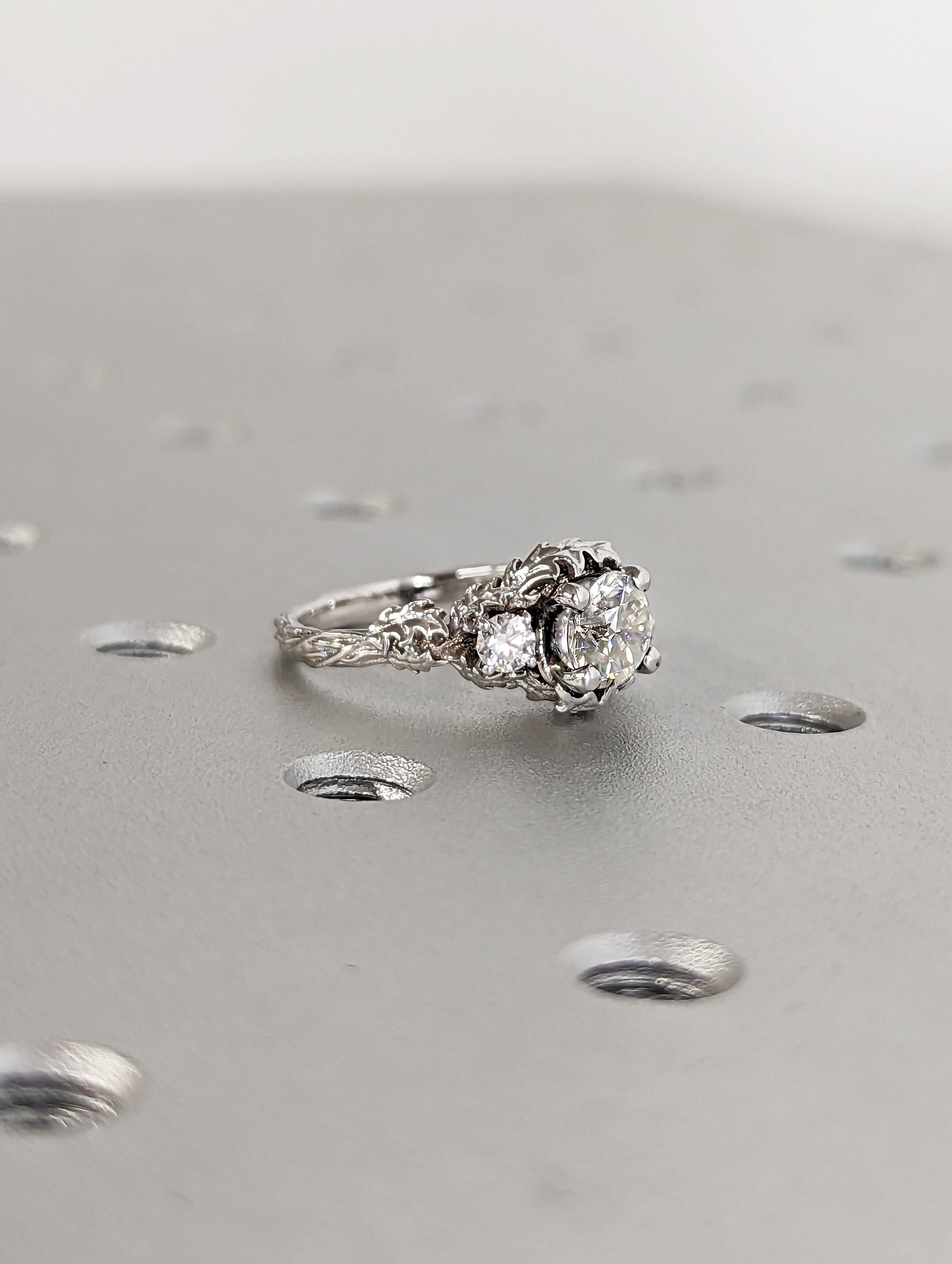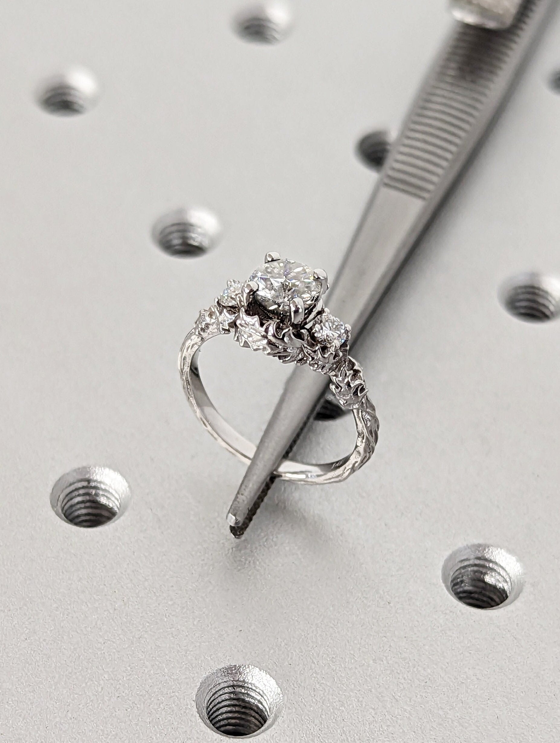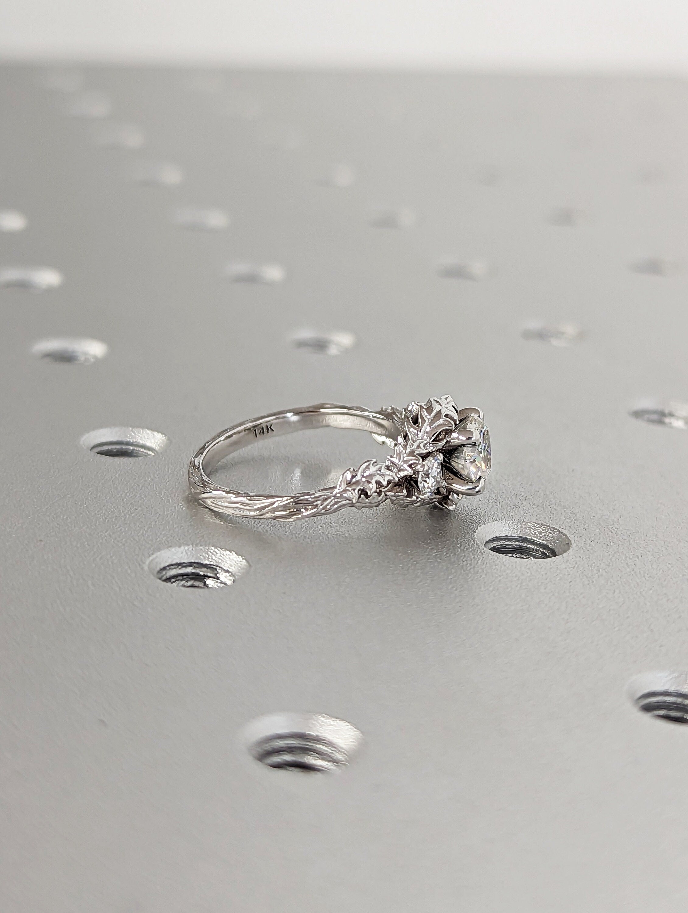 Introducing our meticulously hand-engraved thistle leaves design, boasting a delicate width of 2.18mm. Explore the exquisite beauty of this piece, showcasing a lab-grown round-cut diamond as the main stone, accompanied by two side stones, available in your choice of dazzling diamonds or shimmering moissanite.