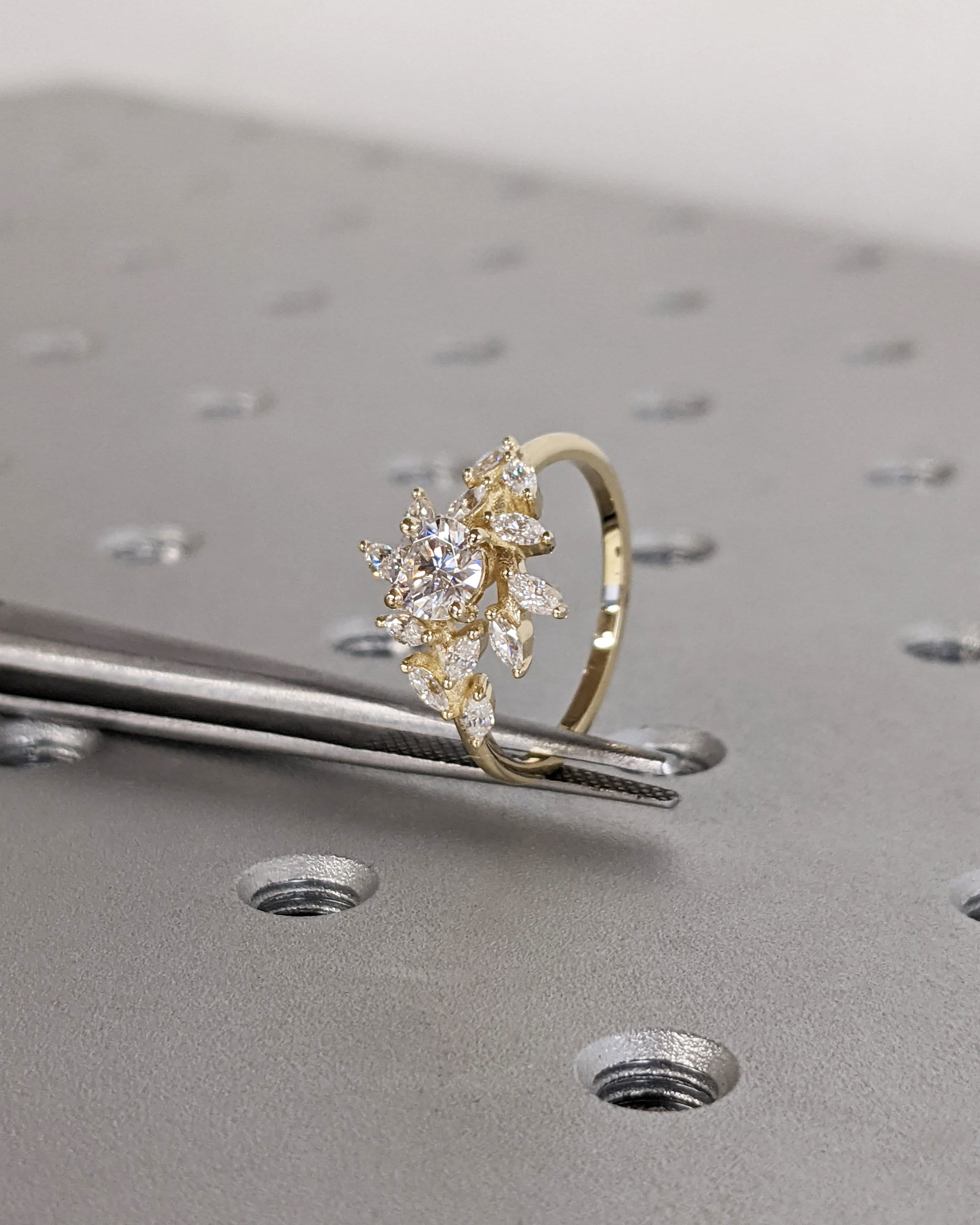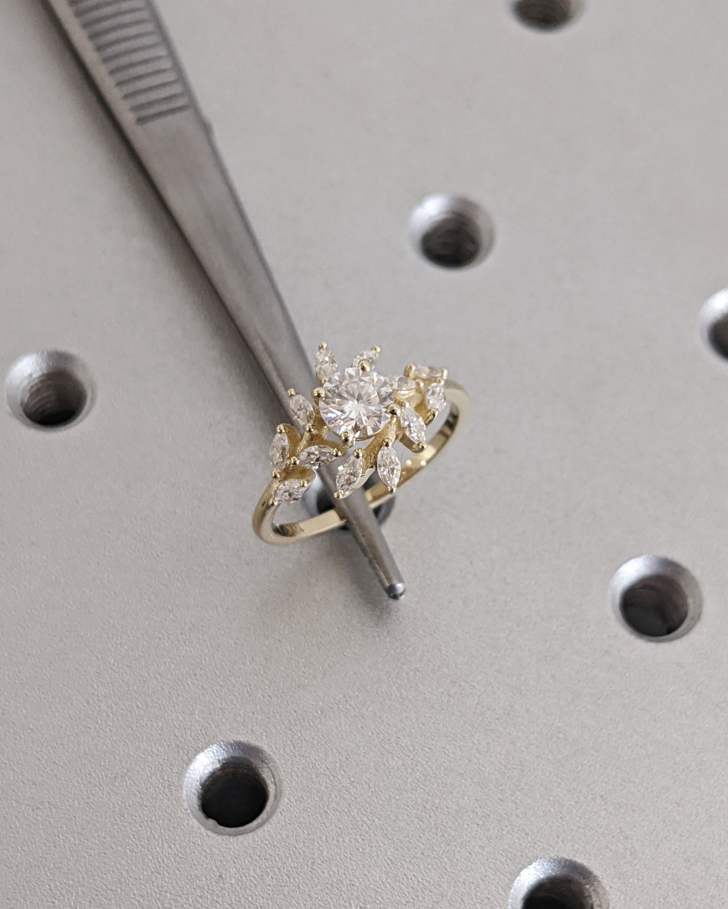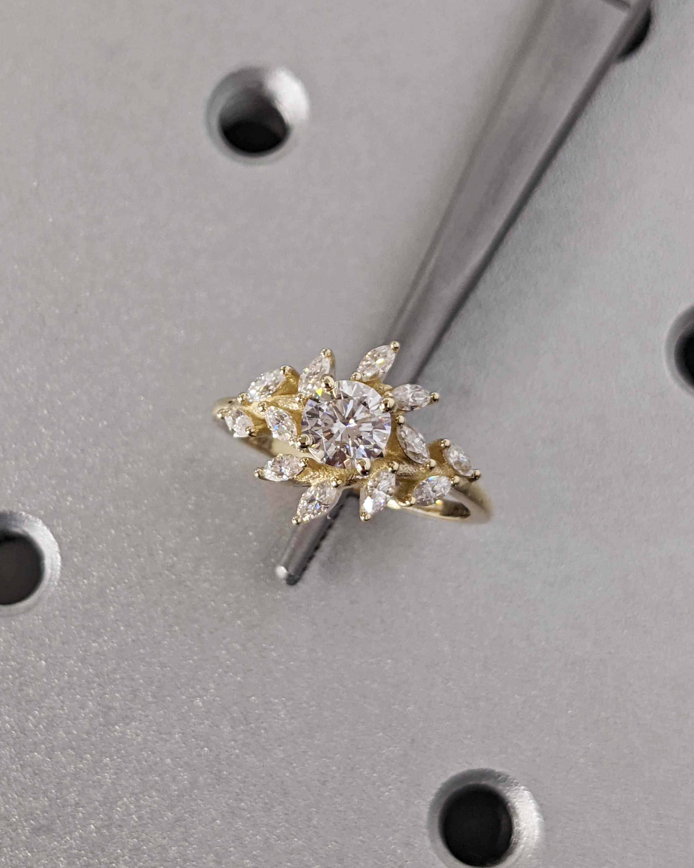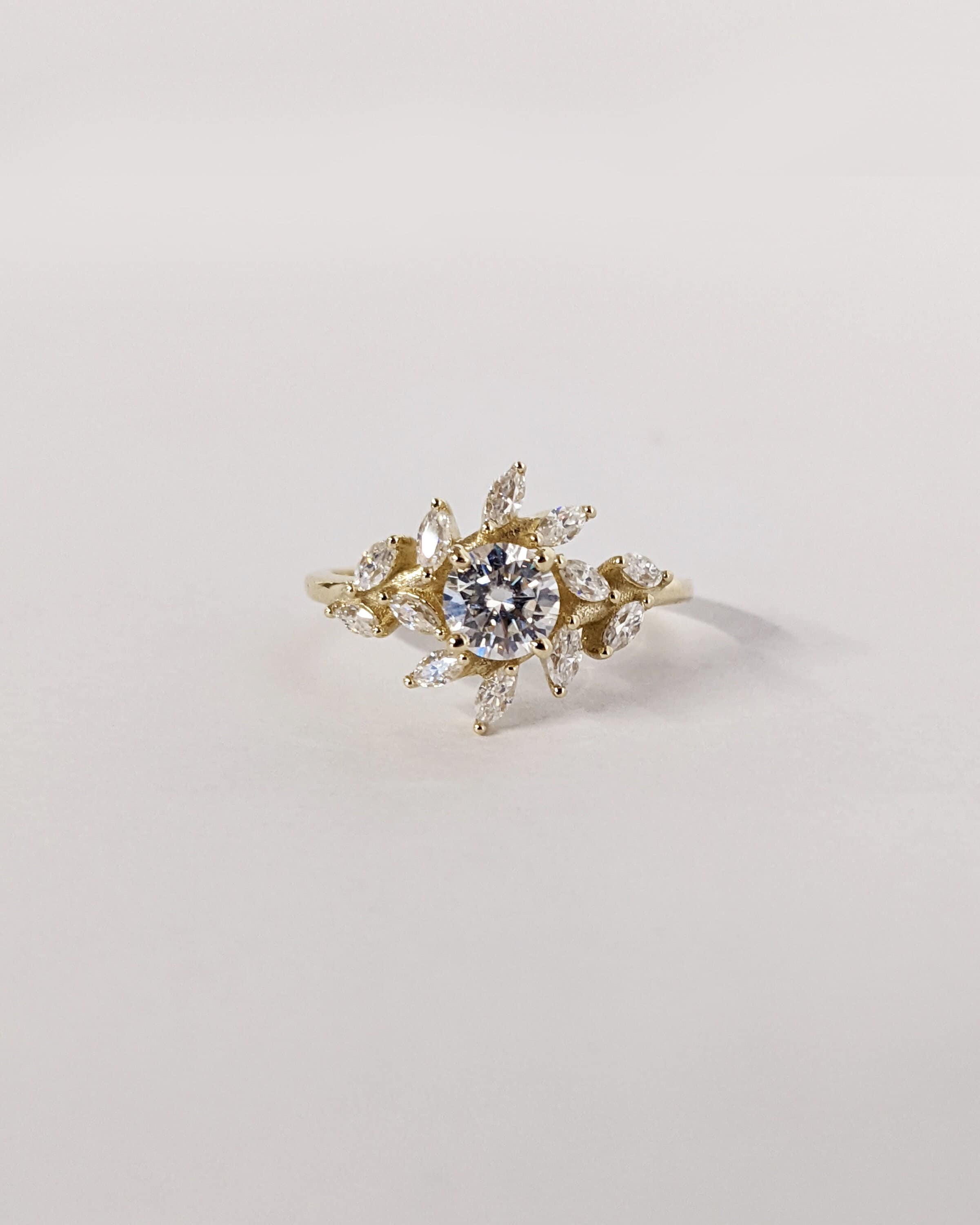 Declare your love with a vintage engagement ring that boasts a distinctive leaf design and a breathtaking marquise-shaped diamond or moissanite. This cluster band is a romantic masterpiece, symbolizing the unique bond you share with your significant other.