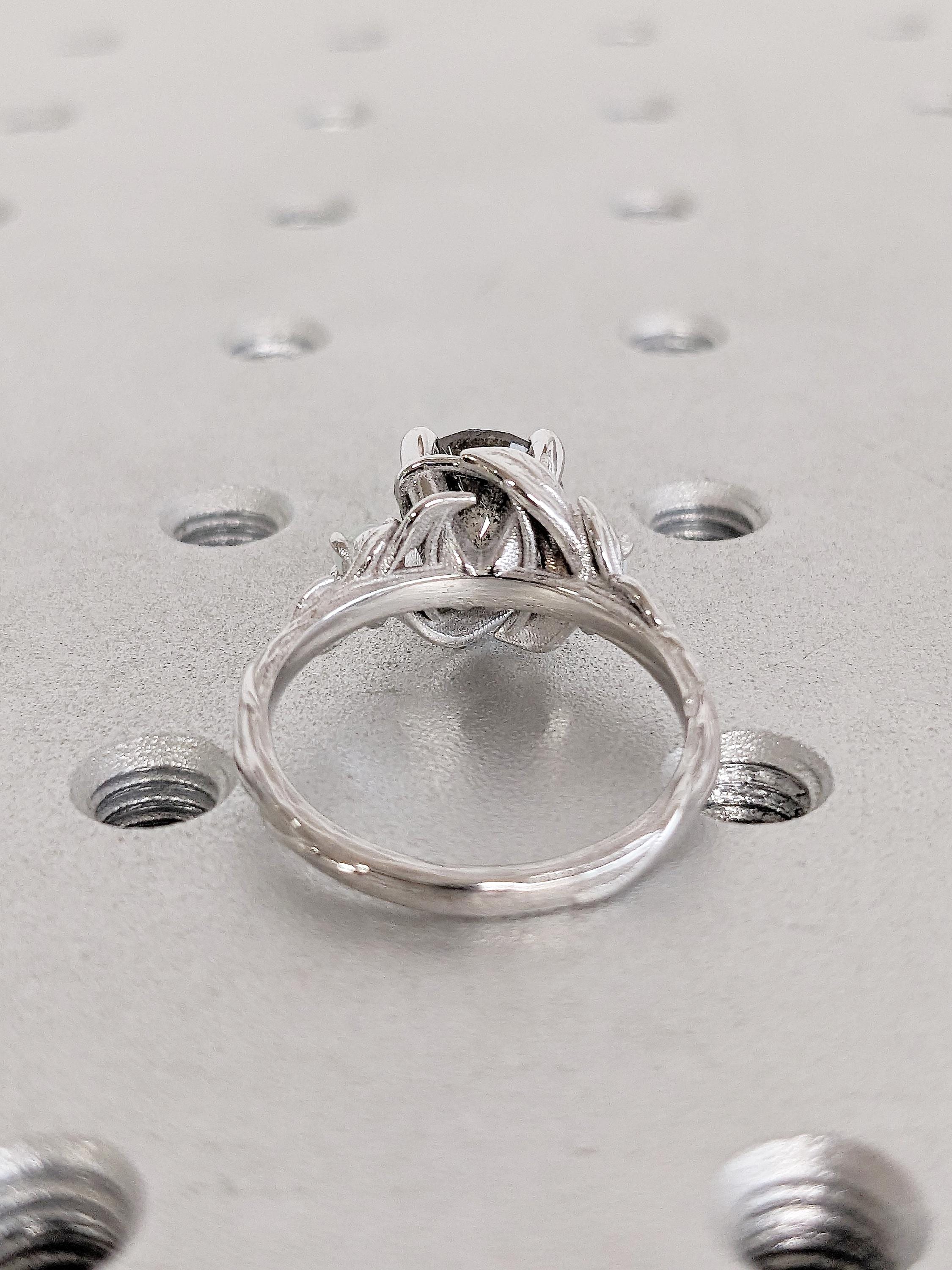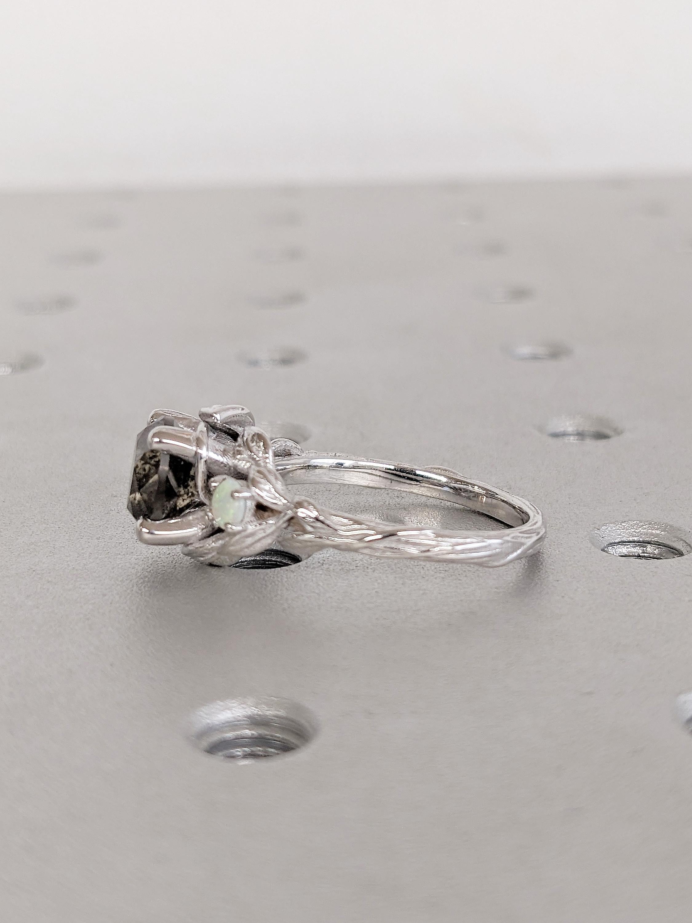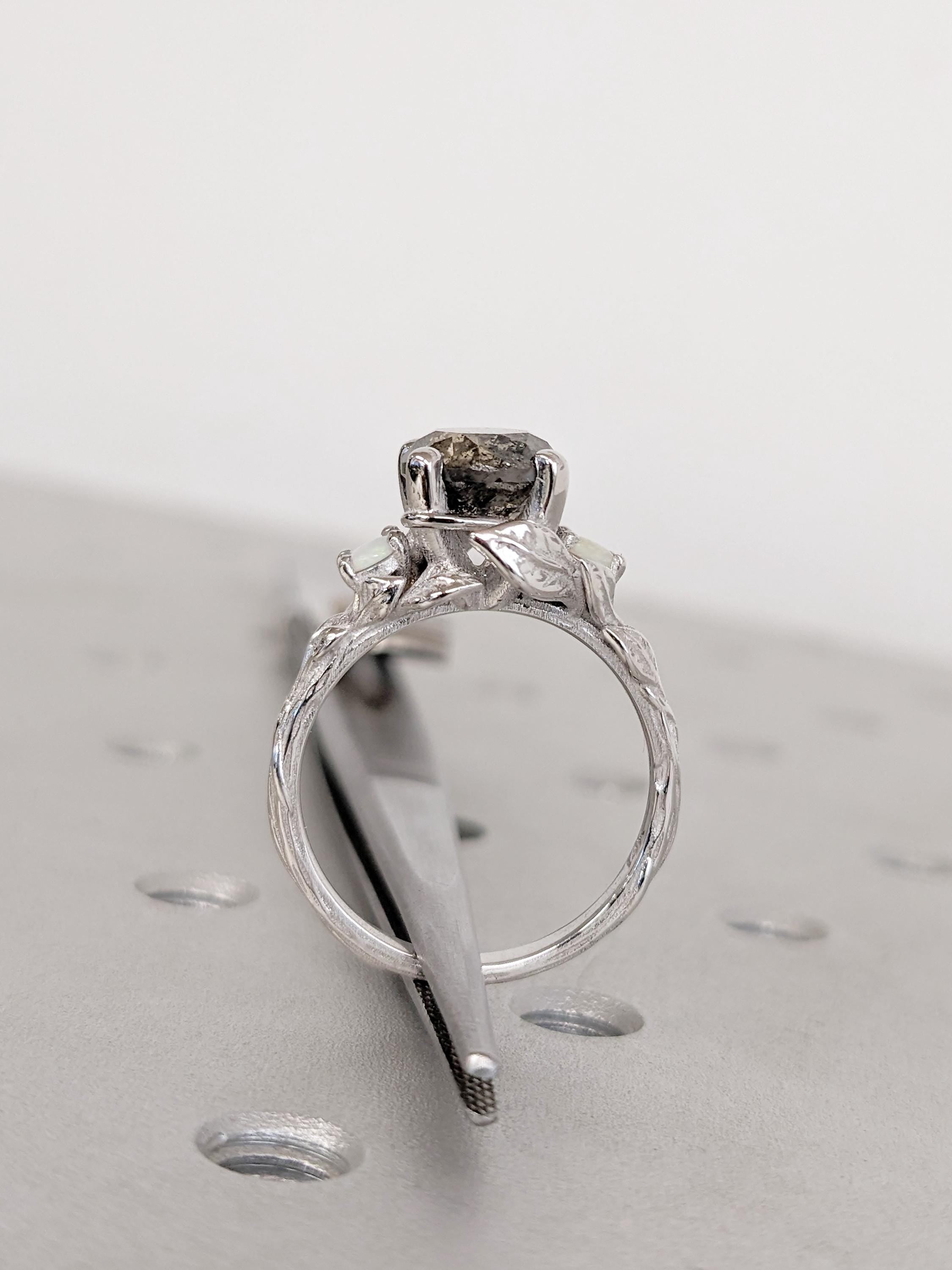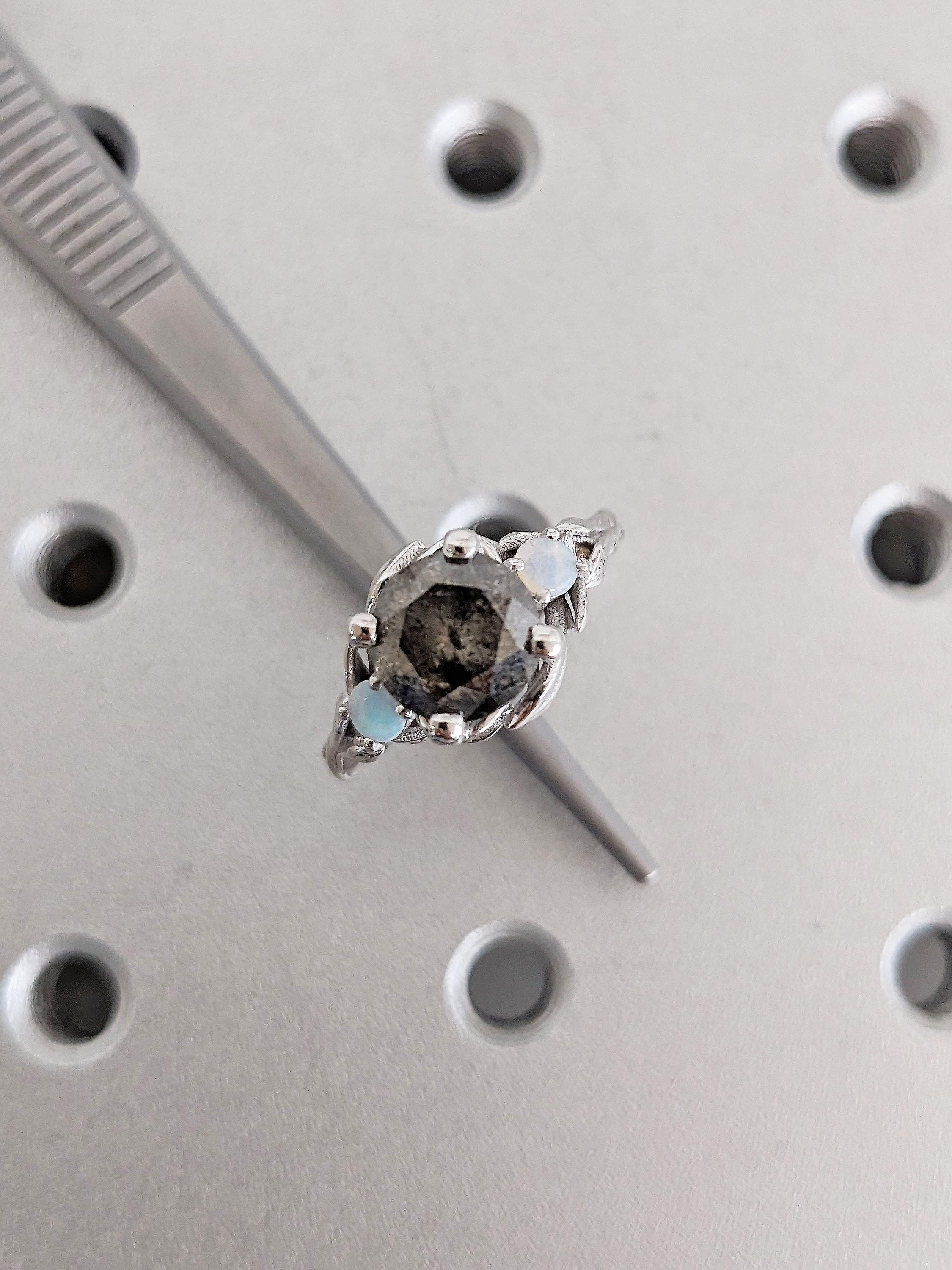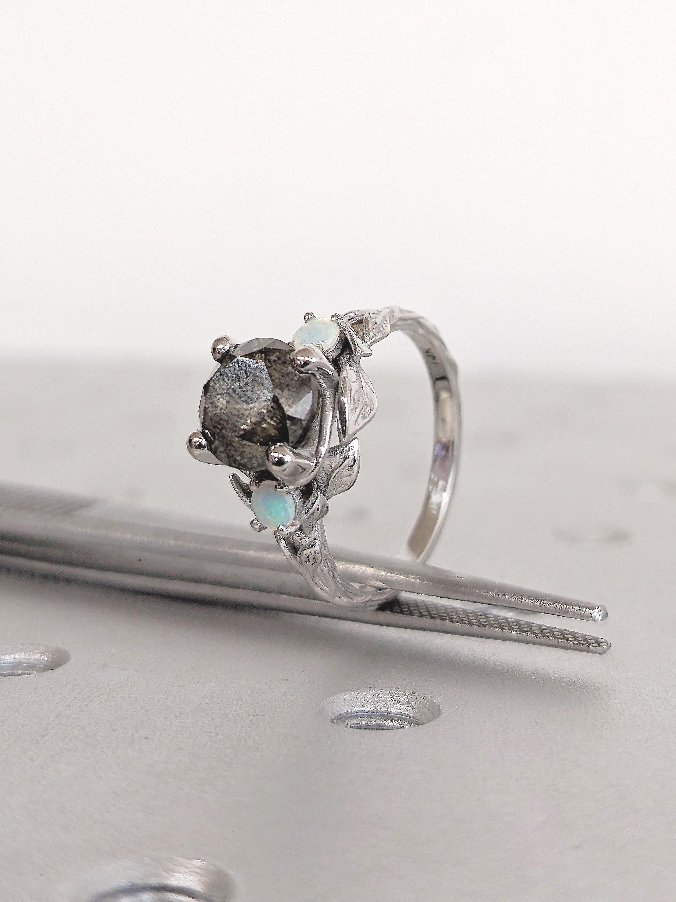 Nature Inspired Salt and Pepper Diamond Engagement Ring, 14k White Gold Ring, Round Cut Diamond and Opal Ring, Three Stone Anniversary Ring