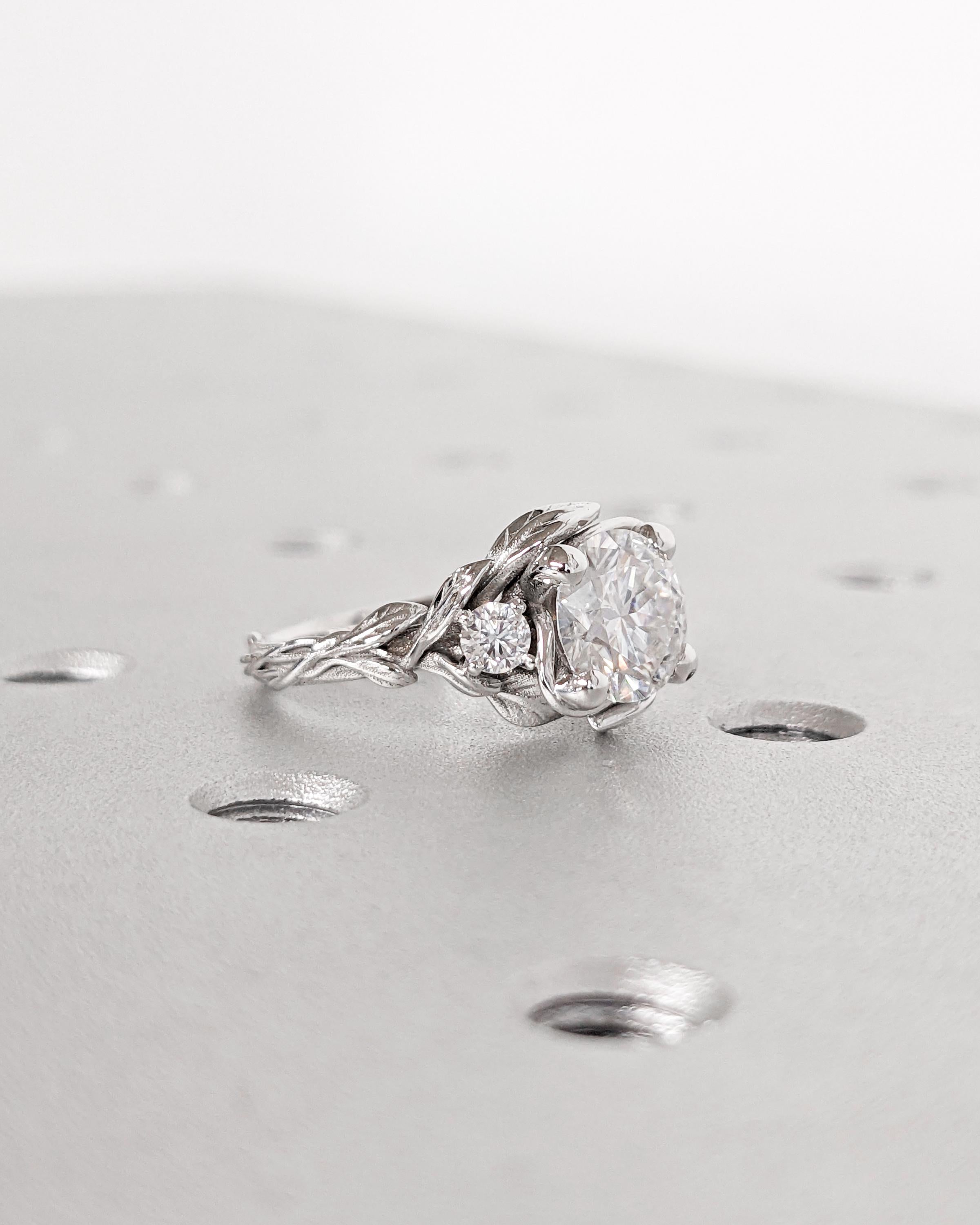 Nature Inspired Wedding Ring Set - Leaf Engagement Ring and Matching Leaf Wedding Band - 14K White Gold - Unique Promise Ring Bridal Set