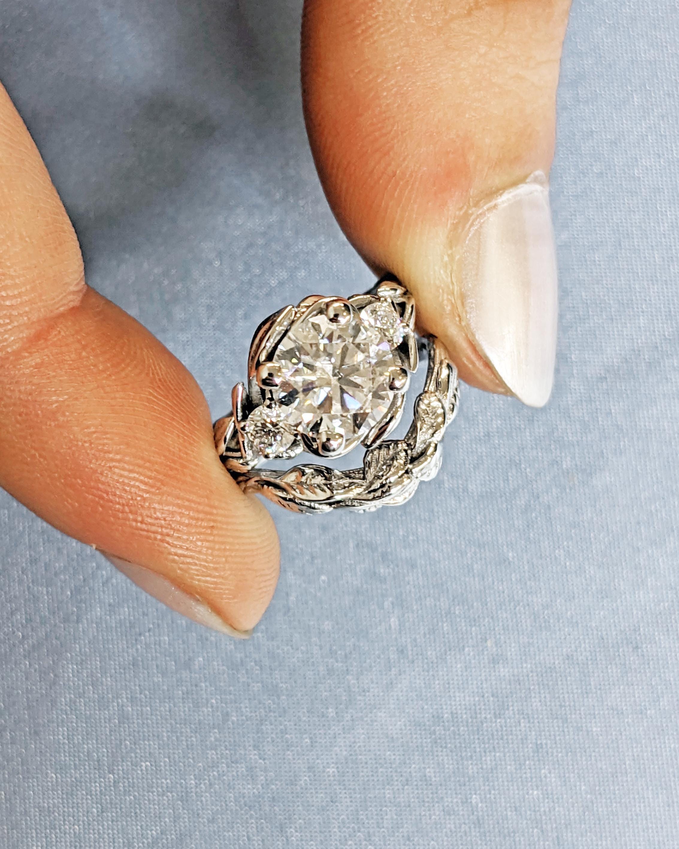 This ring set features an elegant design of lotus flower leaves intertwined to form a twisted vine across the crown towards the central Moissanite setting with two moissanite side stones, all crafted in gold with a stunning curved-shaped leaf engraved matching band. This design was inspired by nature, and this exquisite piece captures the beauty of organic elements. Ideal as an engagement, wedding, or anniversary gift for your wife.