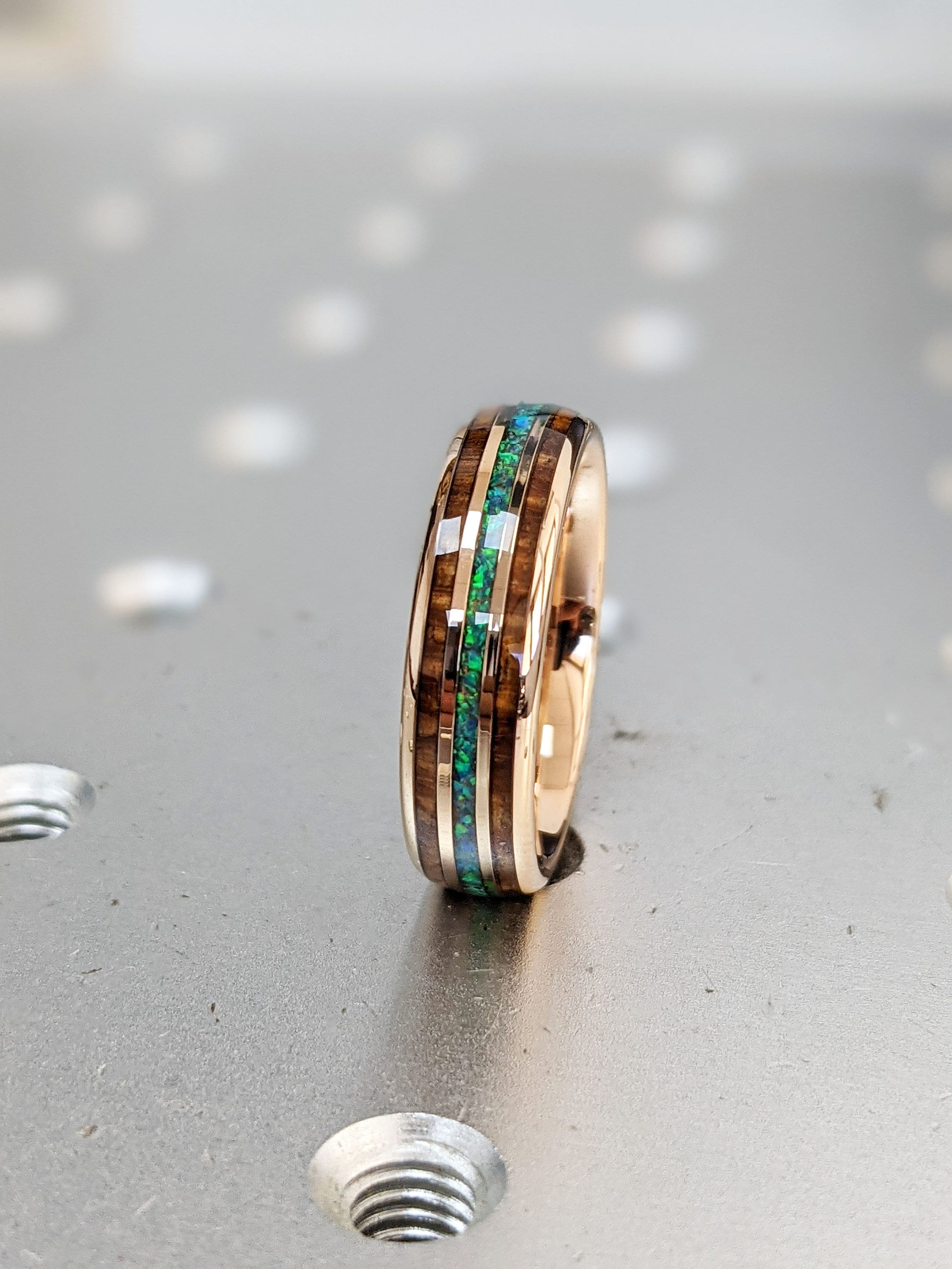 Opal and Koa Wood Inlay Wedding Band, Polished Finish Tungsten Ring, Rose Gold Plated Ring, 6mm Tungsten Carbide Ring, Wooden Inlay Ring