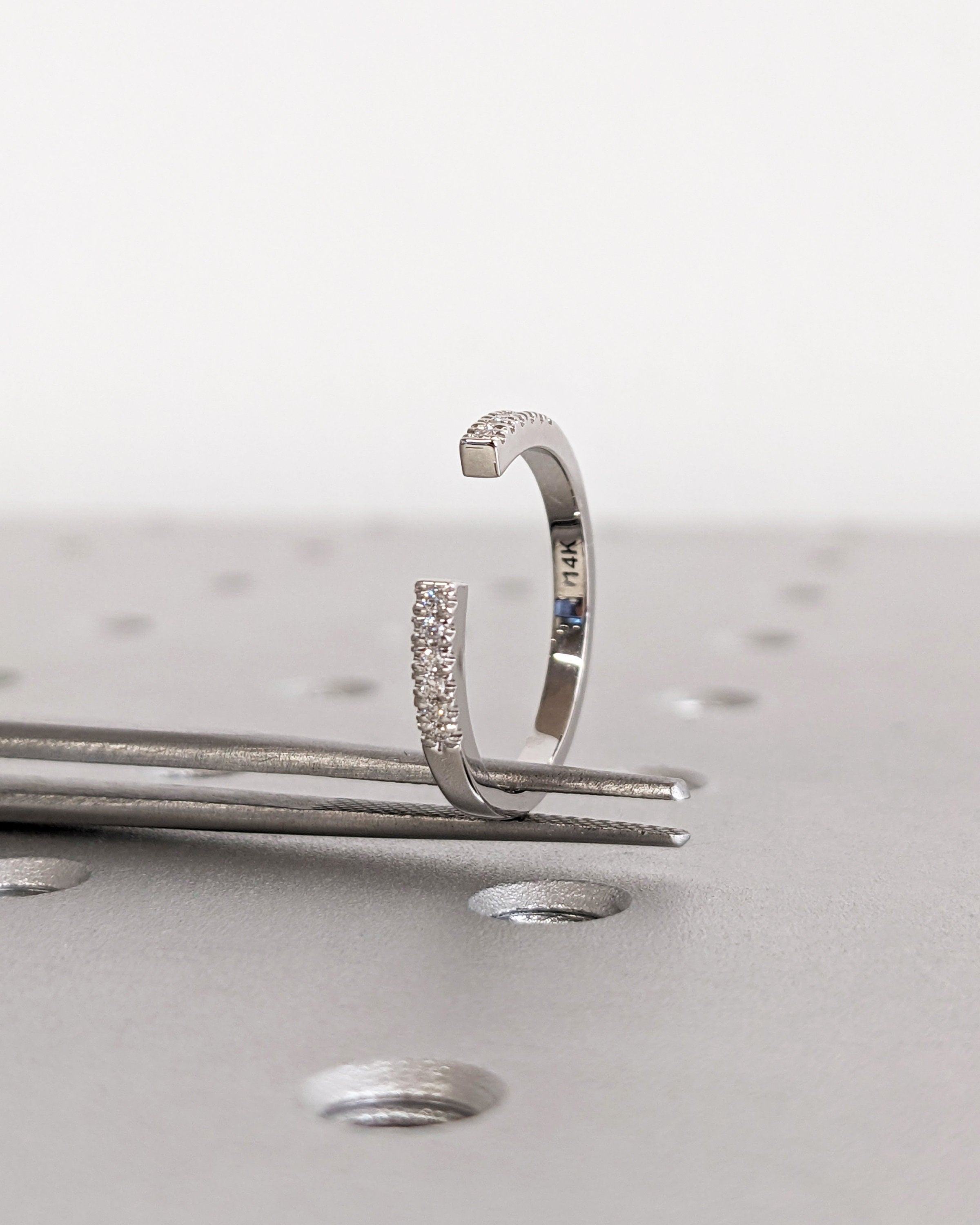 This elegant Diamond Wedding Band features a graceful open gap design adorned with round cut diamonds available in Natural Diamond, Lab Diamond or Moissanite. Perfect for stacking or pairing with an engagement ring, this delicate band adds a touch of timeless sparkle to any look.