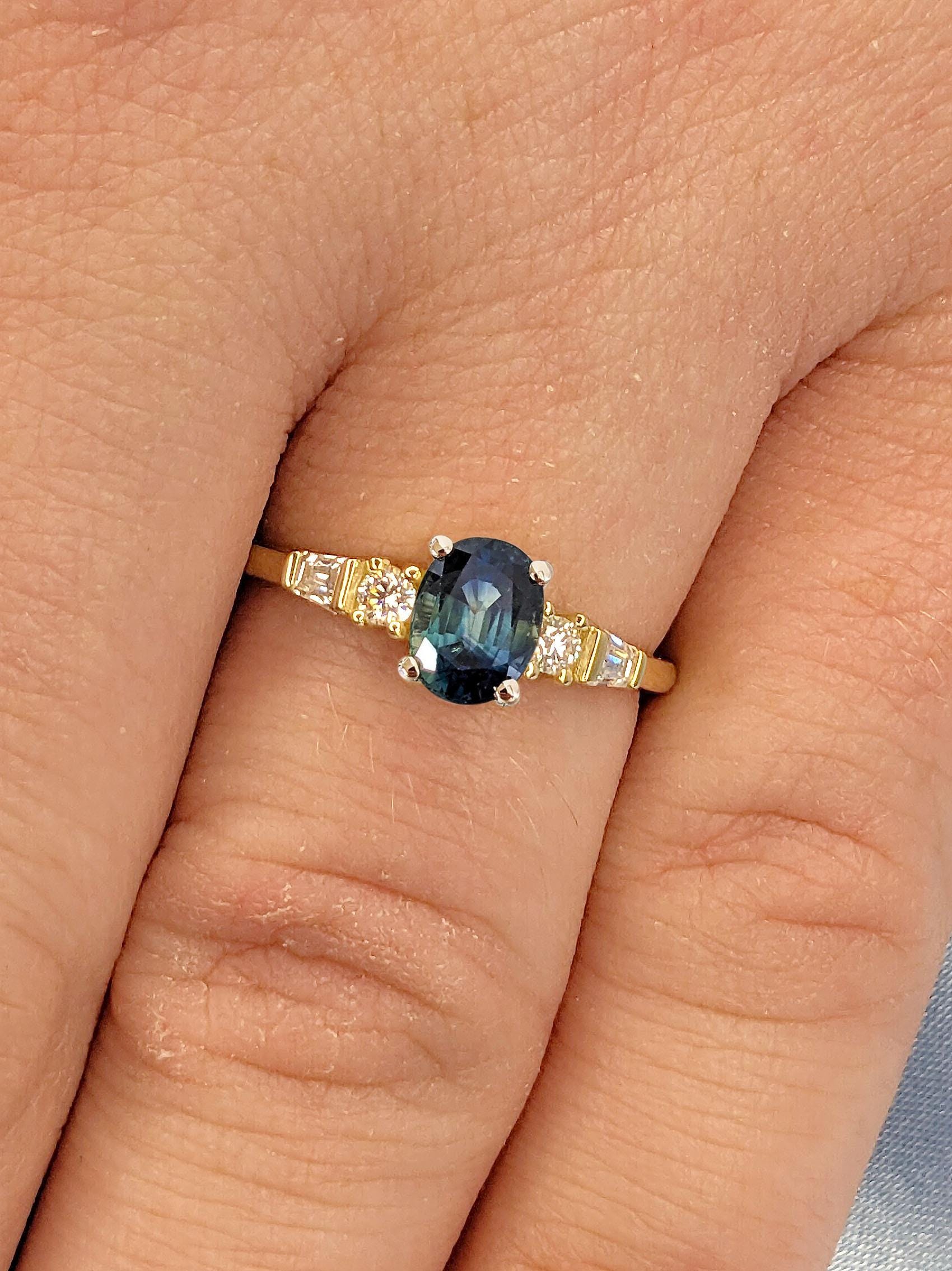 Oval cut Blue Green Sapphire Engagement Ring | 14k Yellow Gold Sapphire Ring | Dainty Engagement Ring | Sapphire and Diamond Promise Ring