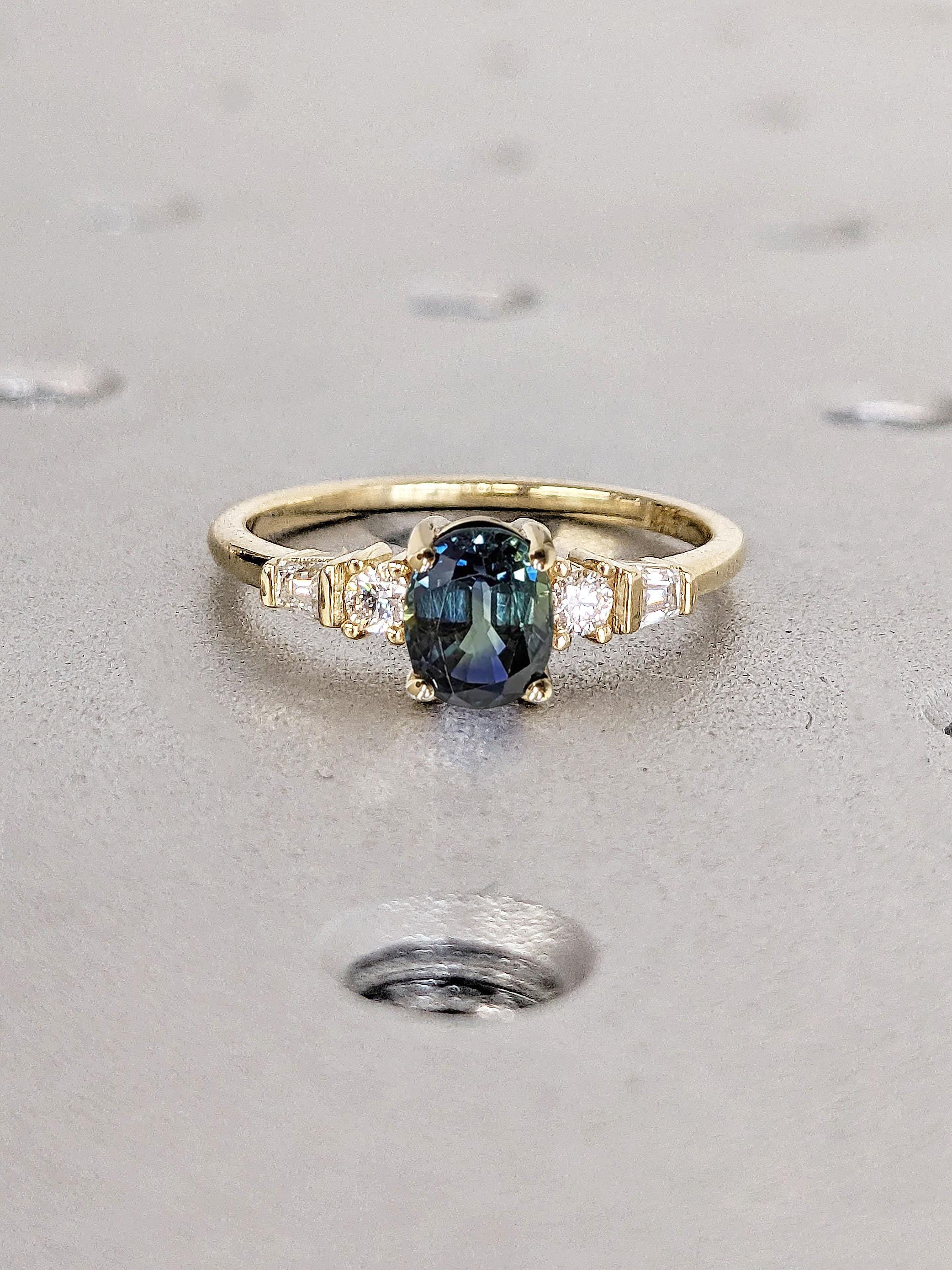 An elegant dainty ring with an oval cut Sapphire center, accented by round and tapered baguette cut side stones set on a mix of prong and bar/channel setting. This ring is classic yet modern, making it the perfect complimenting statement jewelry for a sophisticated look. With its blue green hue from the center stone, this ring is mesmerizing and a wonderful piece to cherish.