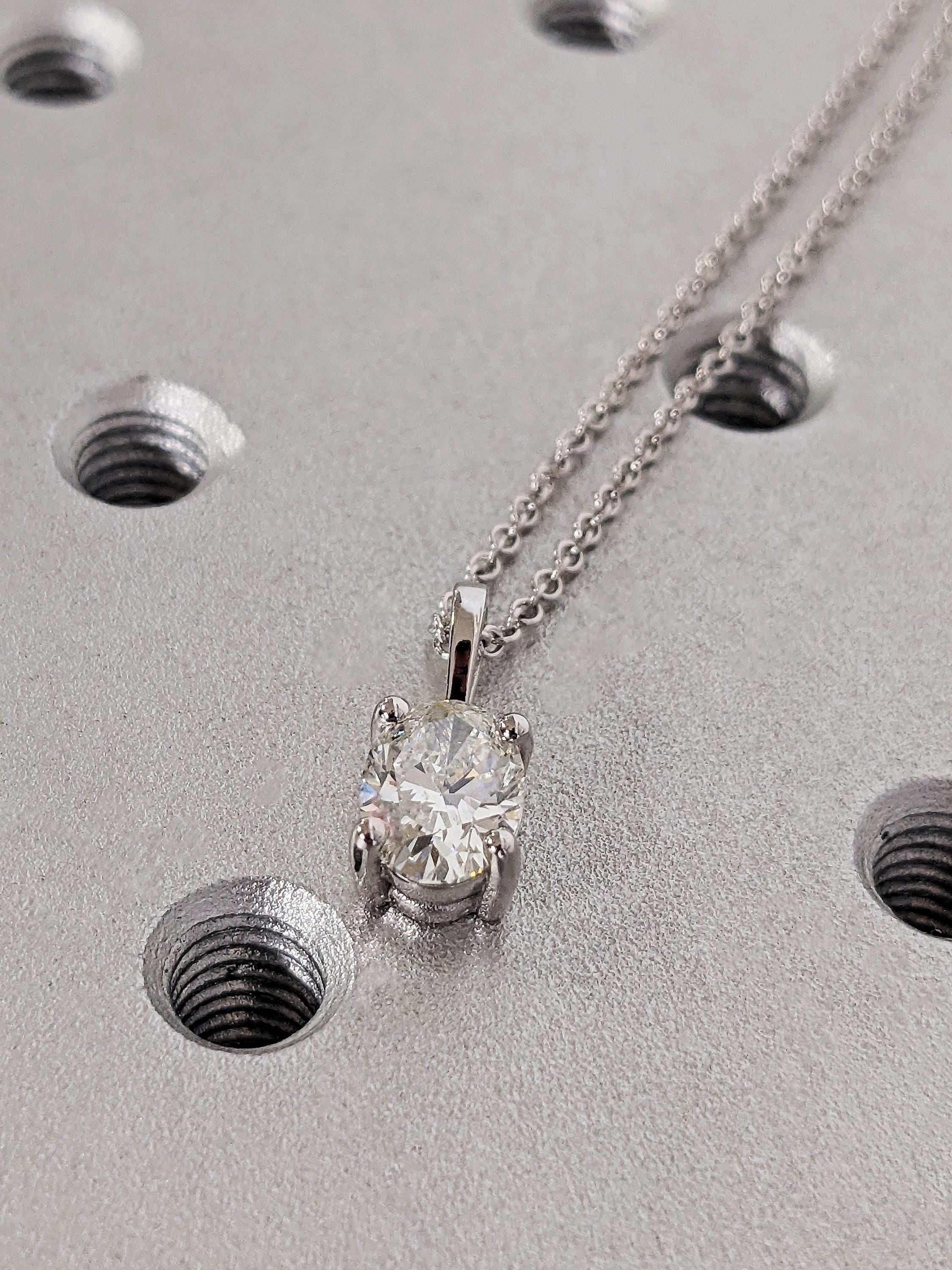 Sleek and elegant, this oval cut lab grown diamond pendant captures light from every angle for a brilliant sparkle. The minimalist solitaire design pairs effortlessly with any outfit, making it perfect for layering or wearing on its own. An ideal choice for everyday elegance or as a thoughtful gift.