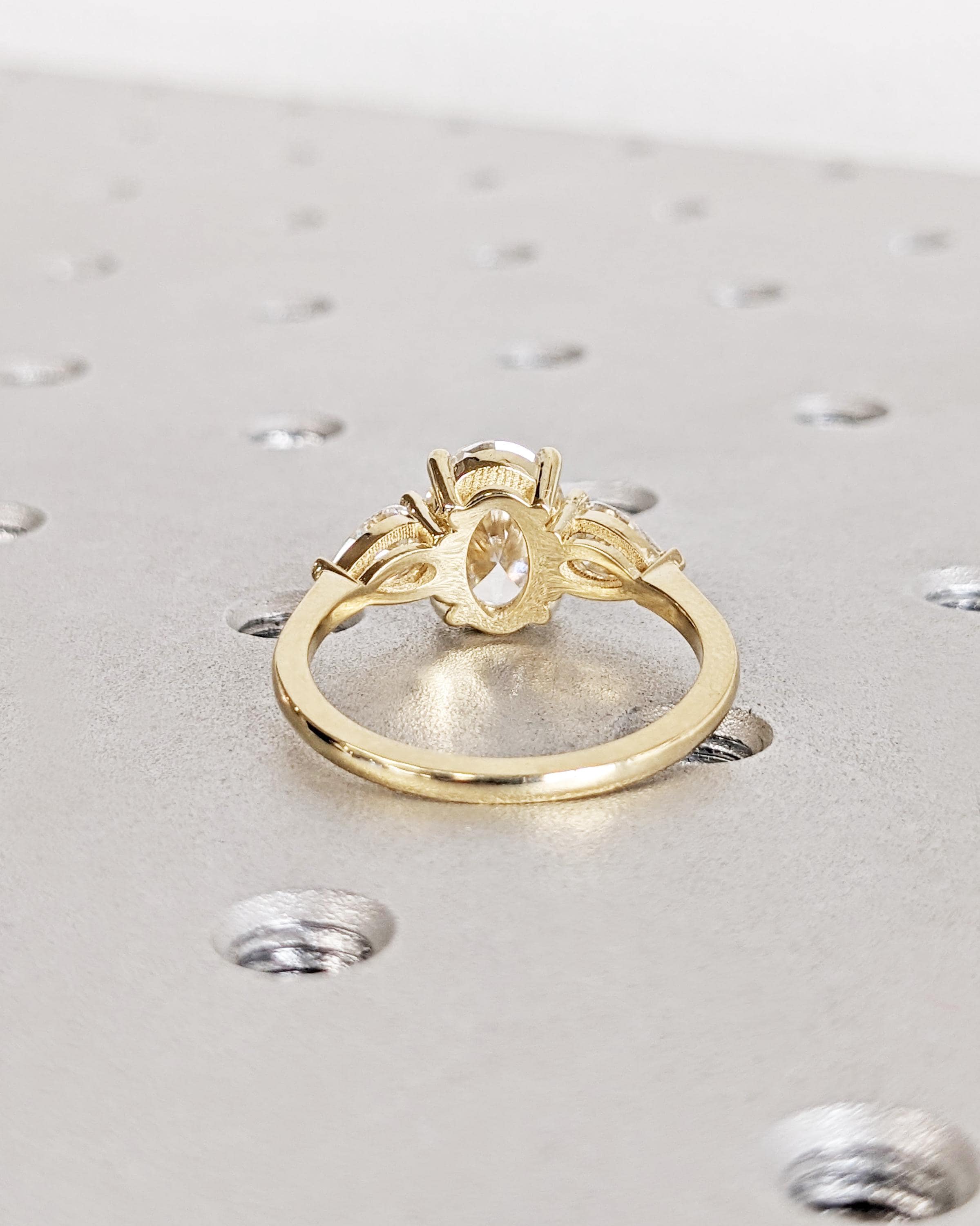 This elegant three-stone engagement ring features a sparkling oval cut lab grown diamond at its center, framed by pear cut side stones. Choose from lab diamond or moissanite accents for your ideal brilliance. Set on a dainty tapered band, it’s effortlessly timeless.