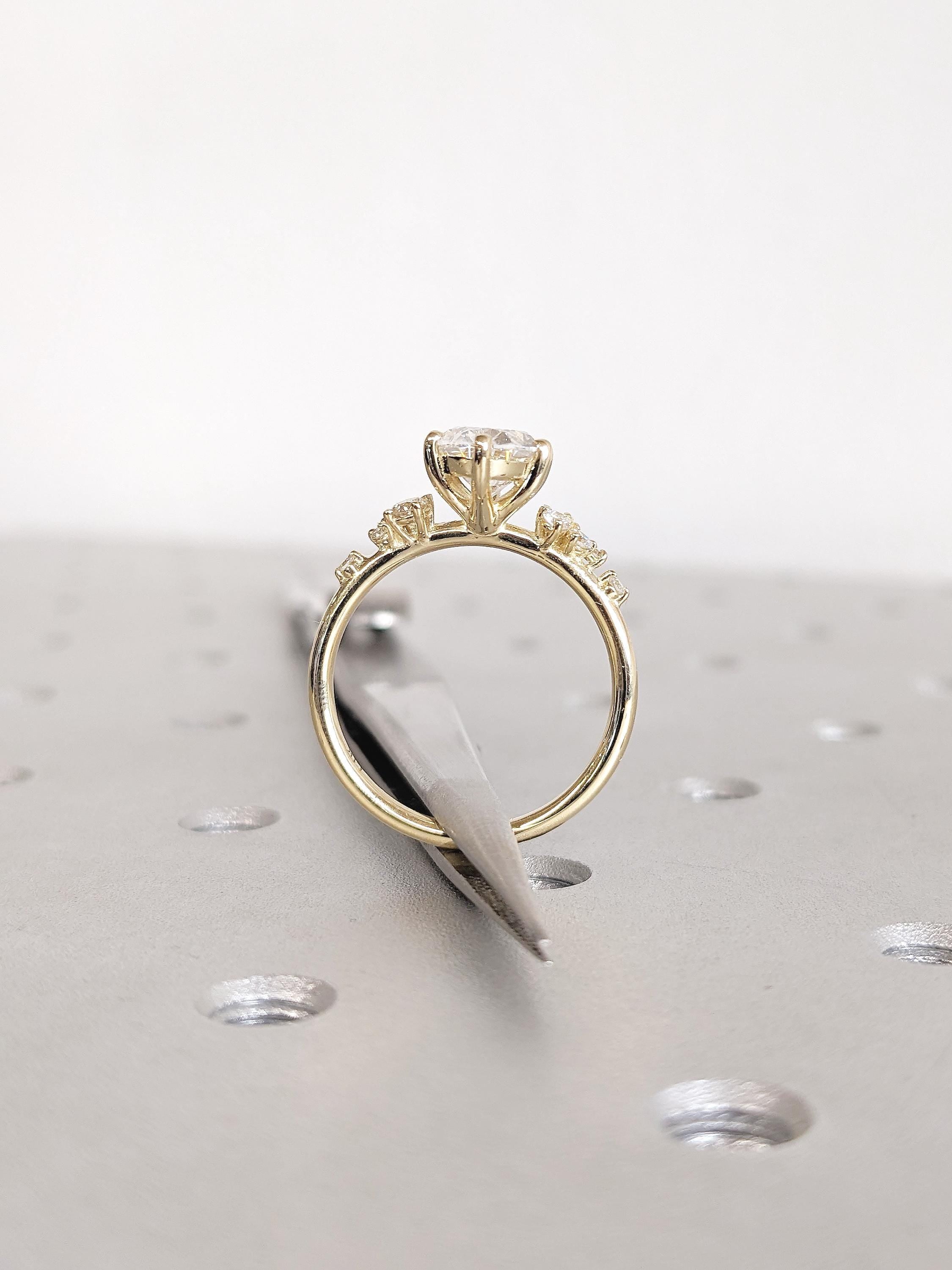 Celebrate the next chapter of your life with our elegantly designed engagement ring, showcasing an oval cut Moissanite center stone in prong setting. Adorned by a cluster of exquisite Natural Diamonds, Lab Grown Diamonds or Moissanites that glisten like freshly fallen snow, this meticulously handcrafted ring is the perfect symbol of your everlasting love.
