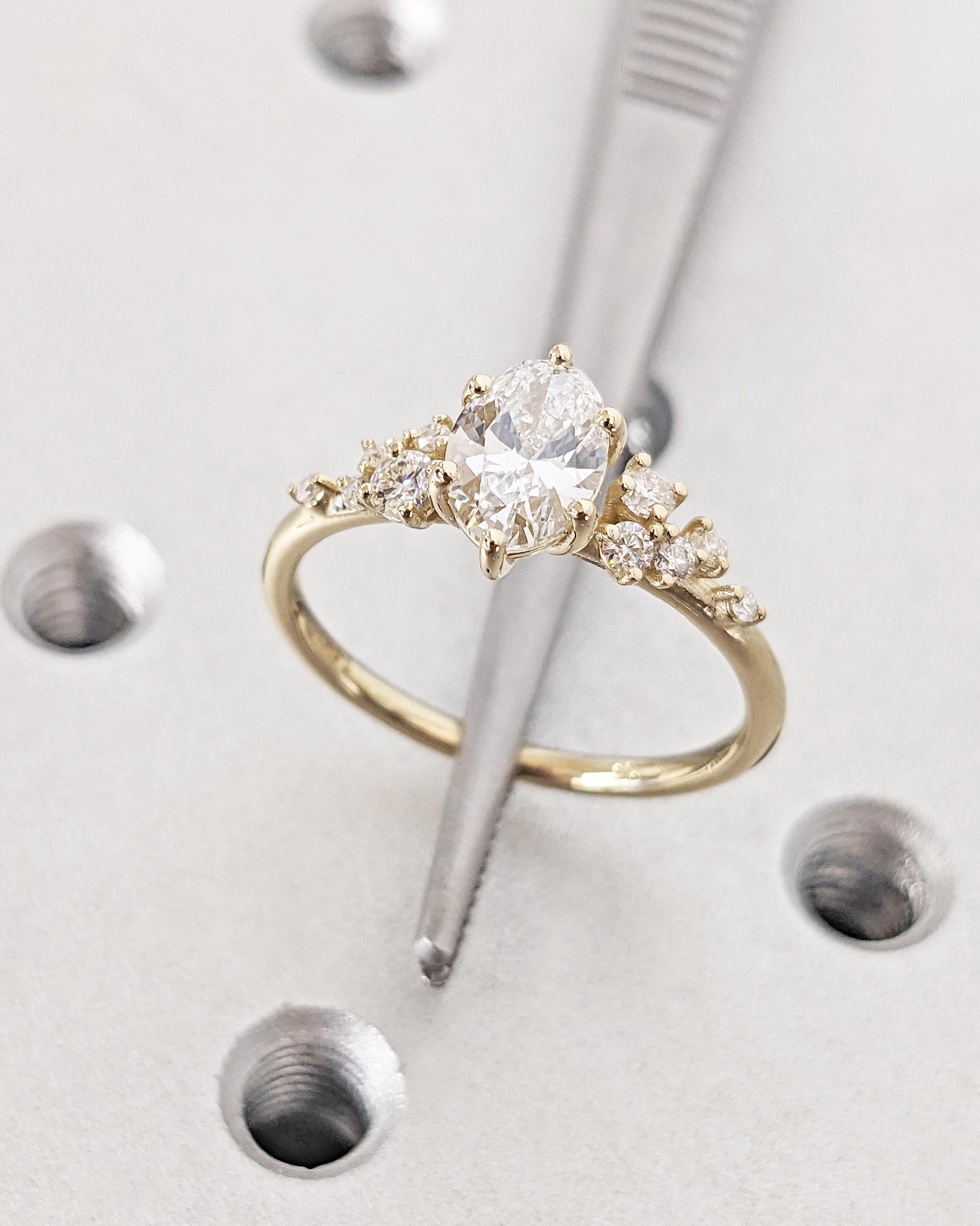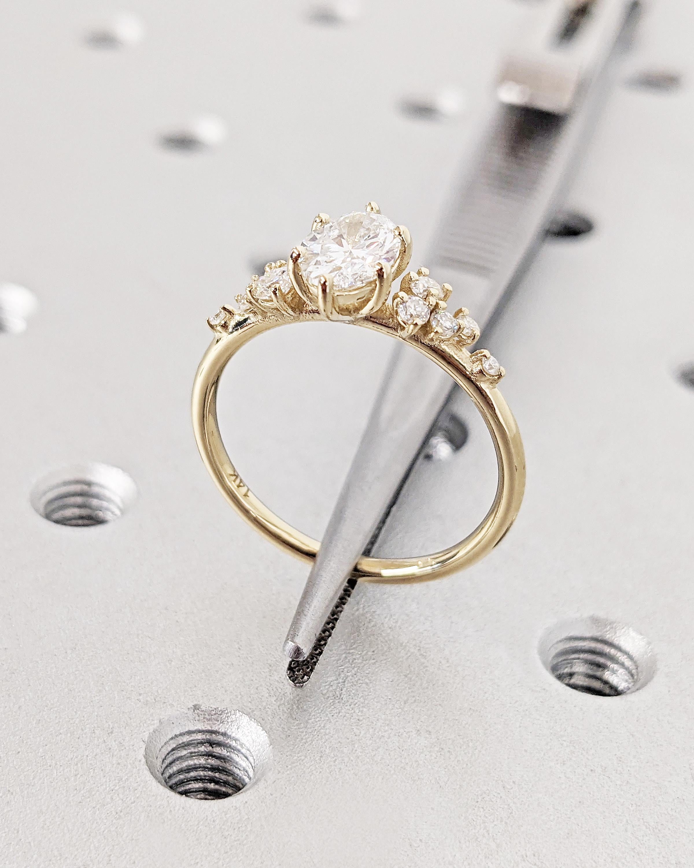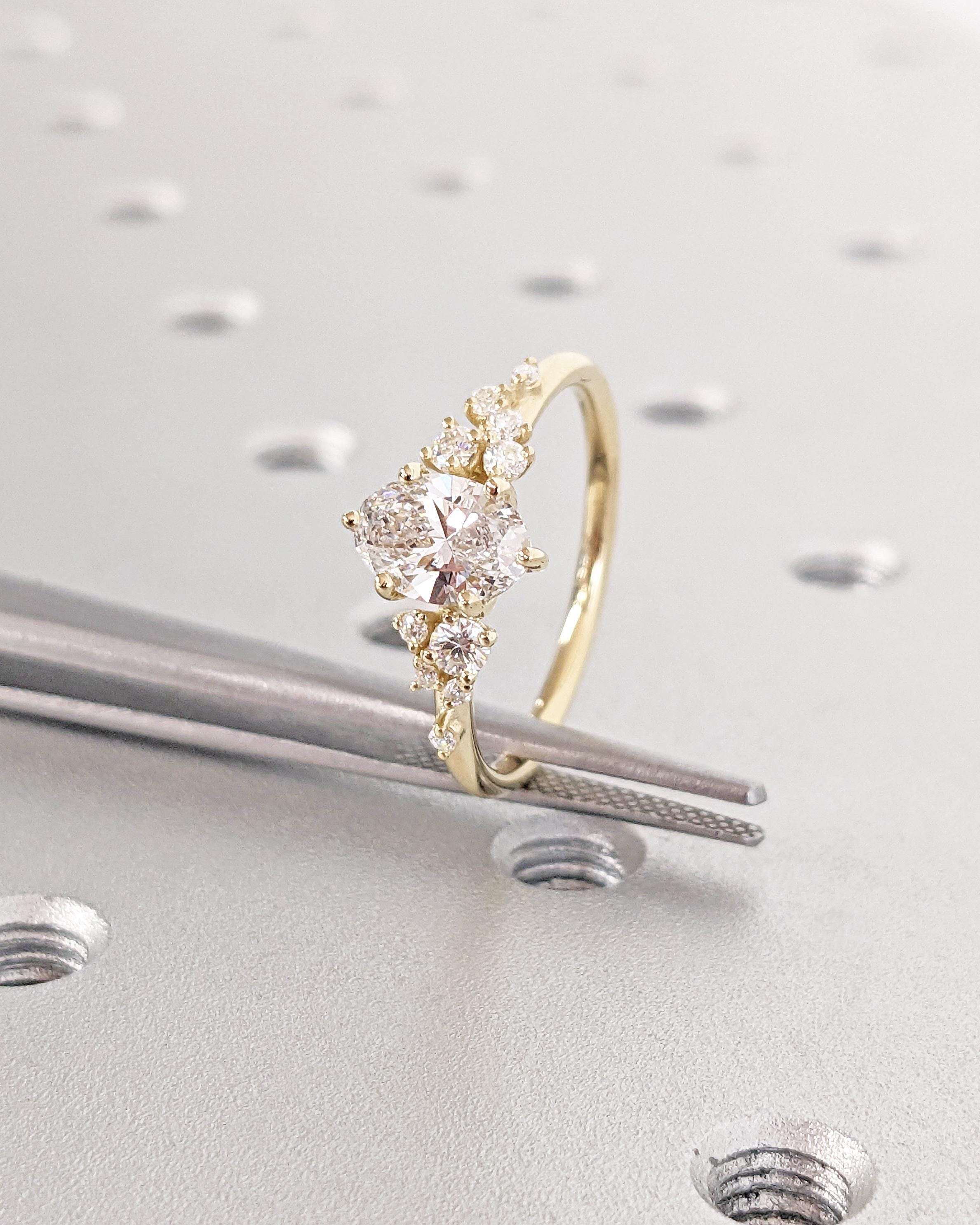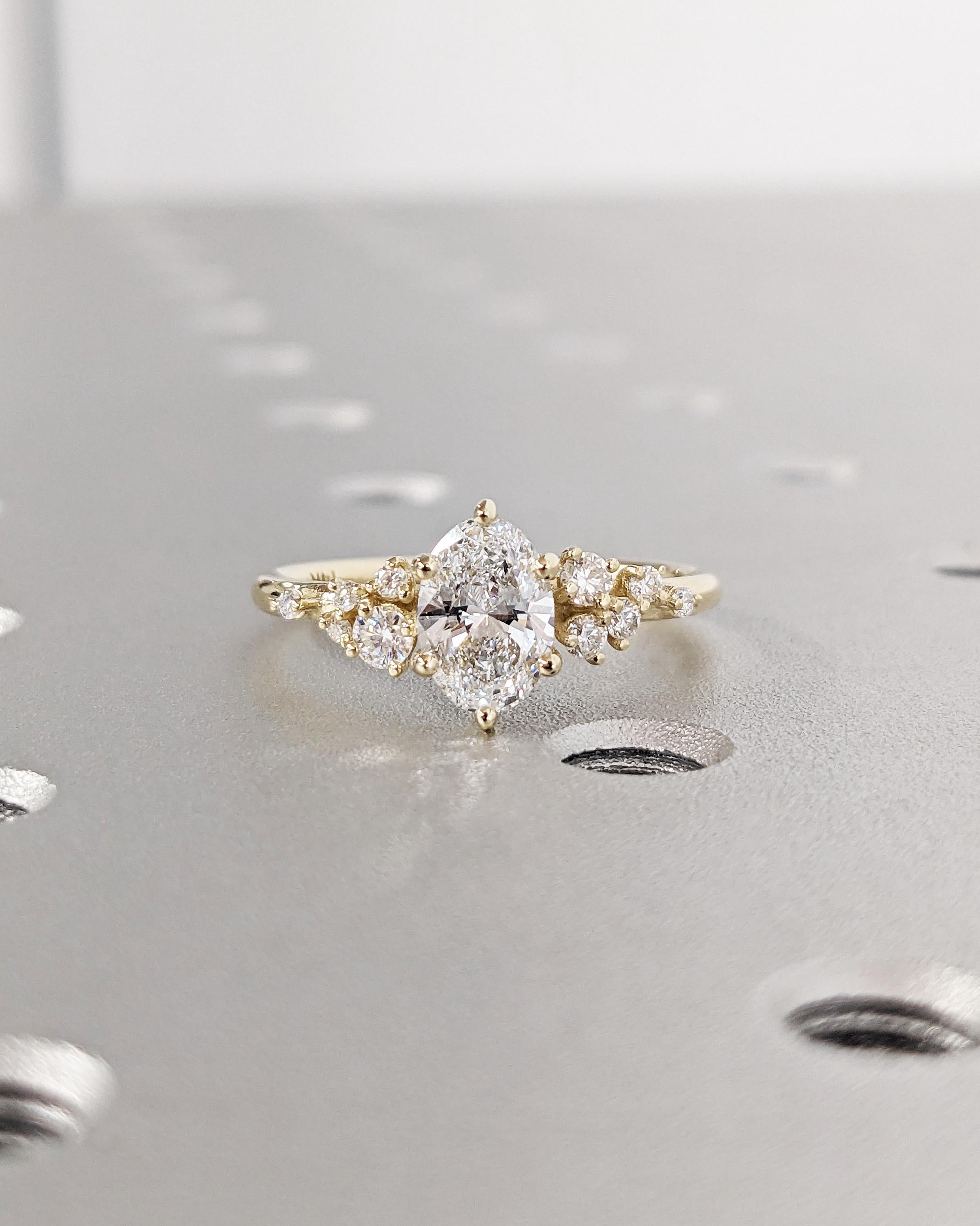Celebrate the next chapter of your life with our elegantly designed engagement ring, showcasing a classic center stone and a delicate setting. Adorned by a cluster of exquisite Diamonds or Moissanites that glisten like freshly fallen snow, this meticulously handcrafted ring is the perfect symbol of your everlasting love.