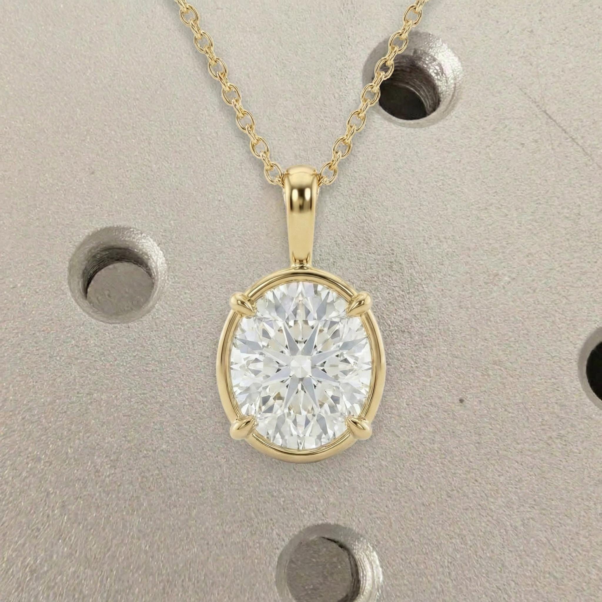 Oval Cut Moissanite Solitaire Bezel set Pendant: Solid 14K/18K Yellow Gold Layering Necklace