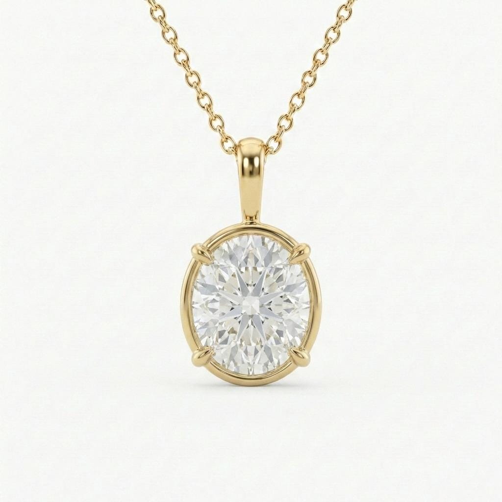 This oval cut pendant necklace with a bezel and prong setting centers a clear Moissanite that gives off a soft, lively shine. The stone rests gently at the neckline and feels light when worn. It adds quiet brightness without trying too hard, making it a lovely choice for everyday wear, anniversaries, simple gifts, or a necklace meant to feel easy and personal.
