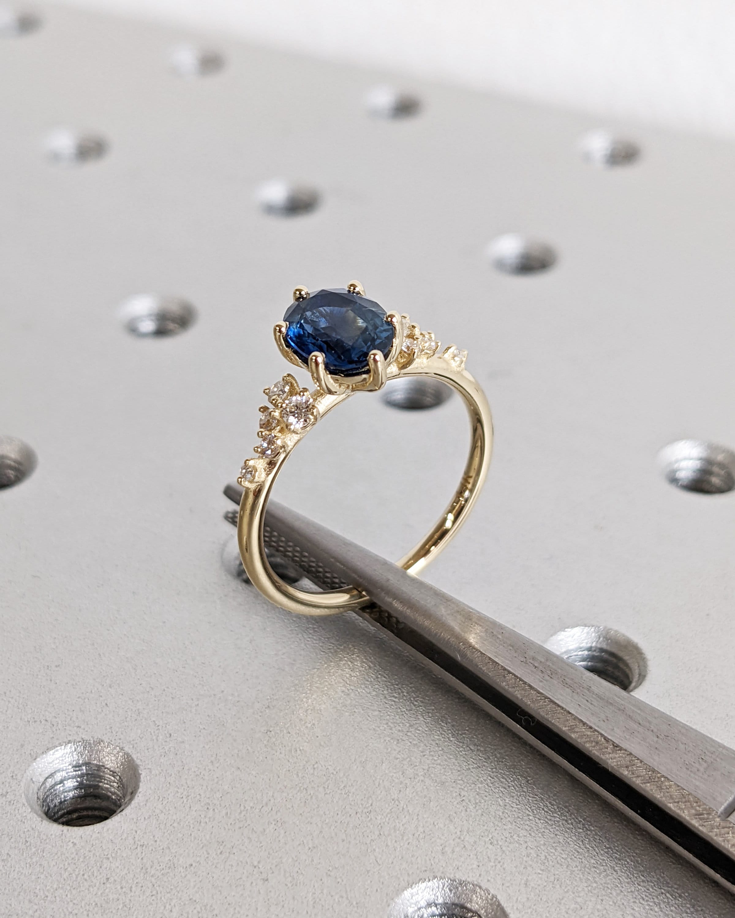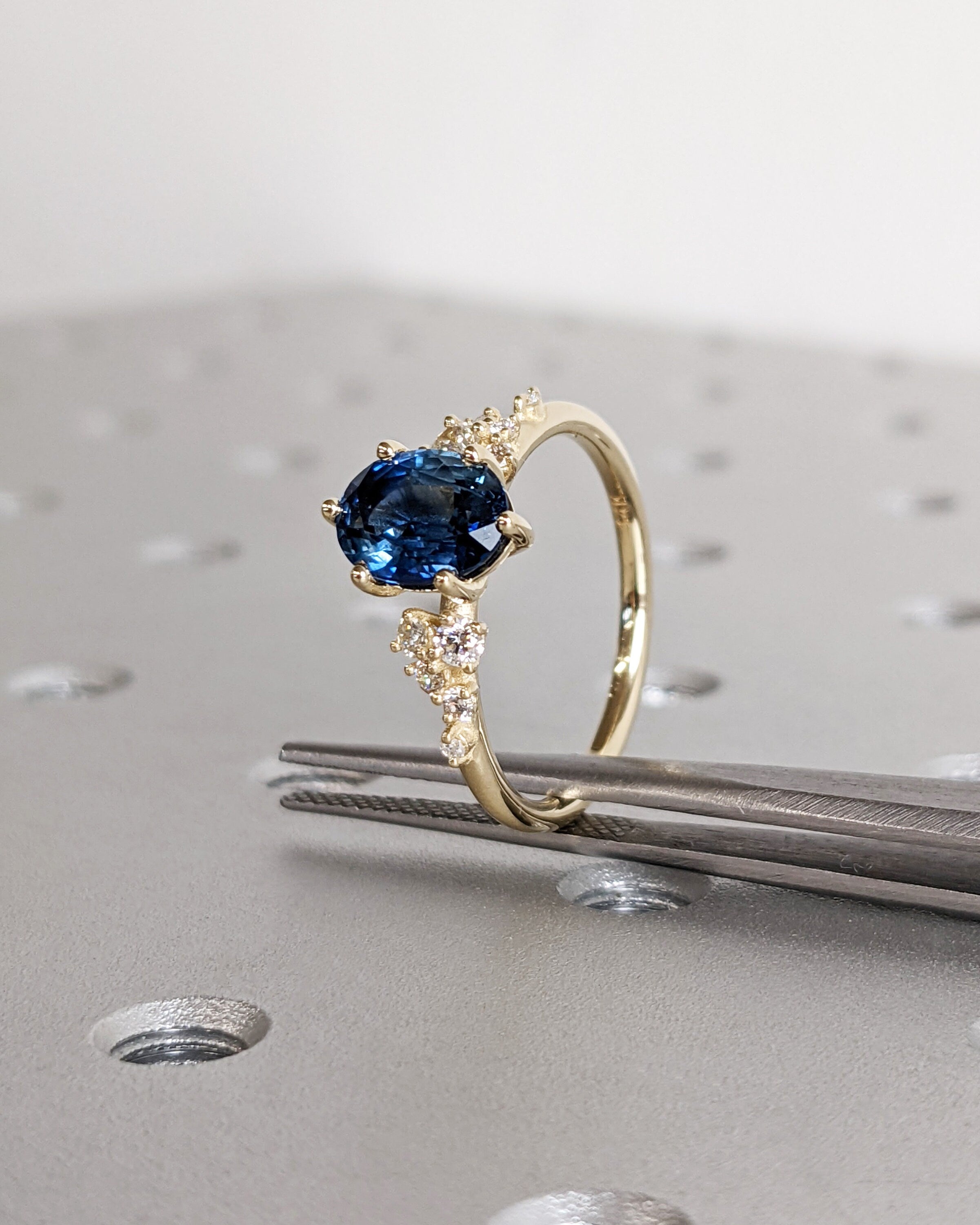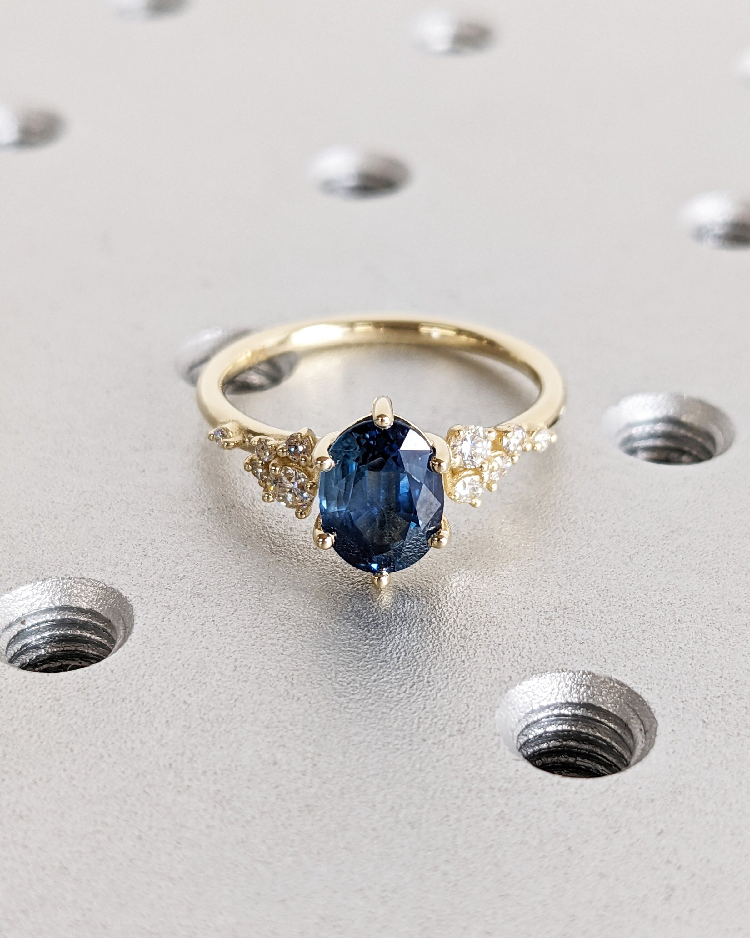 Embrace luxury and style with our oval sapphire ring, featuring enchanting deep blue tones that captivate the beholder. Nestled in a delicate six-prong setting, the ring is adorned with a unique snowdrift cluster, glistening with moissanites or diamonds, mirroring the elegance of freshly fallen snow.