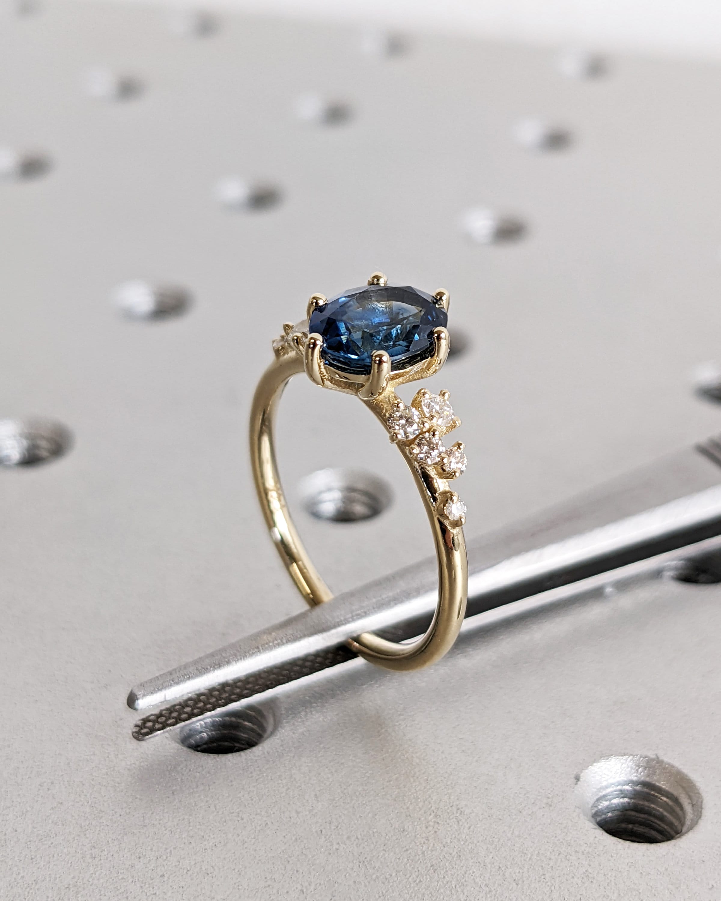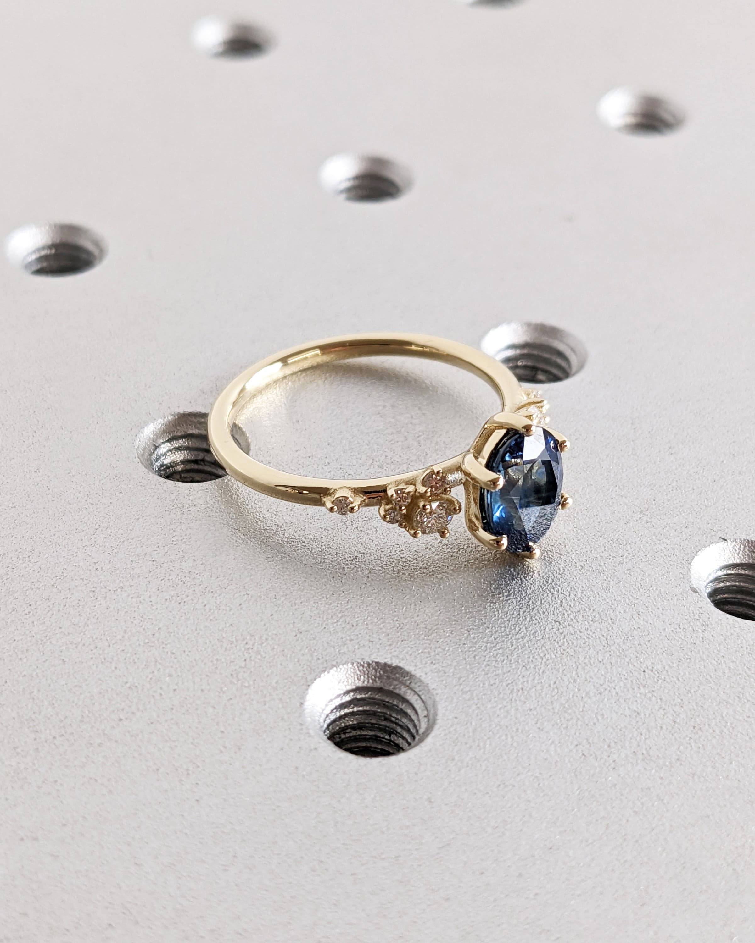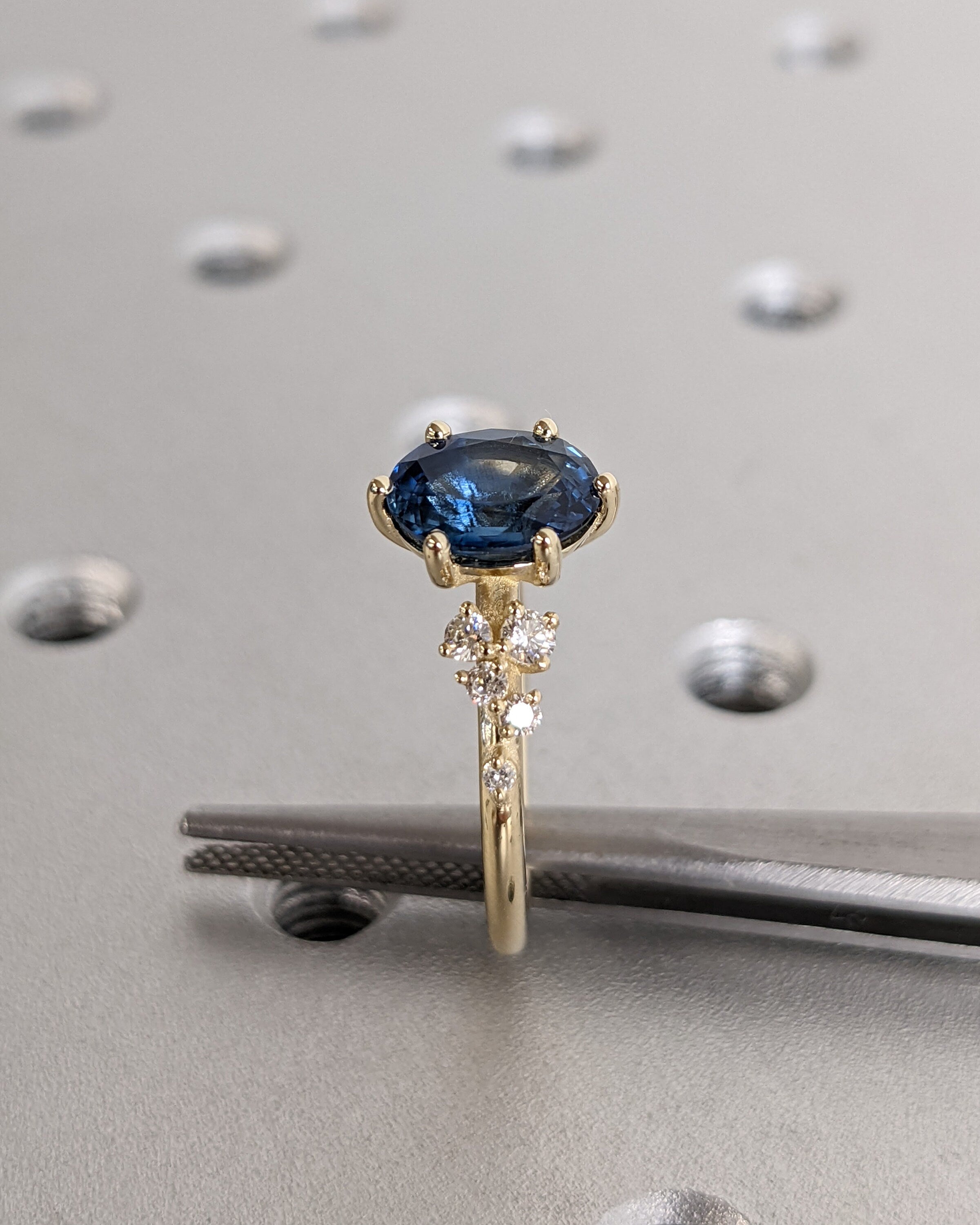 Embrace luxury and style with our oval sapphire ring, featuring enchanting deep blue tones that captivate the beholder. Nestled in a delicate six-prong setting, the ring is adorned with a unique snowdrift cluster, glistening with moissanites or diamonds, mirroring the elegance of freshly fallen snow.