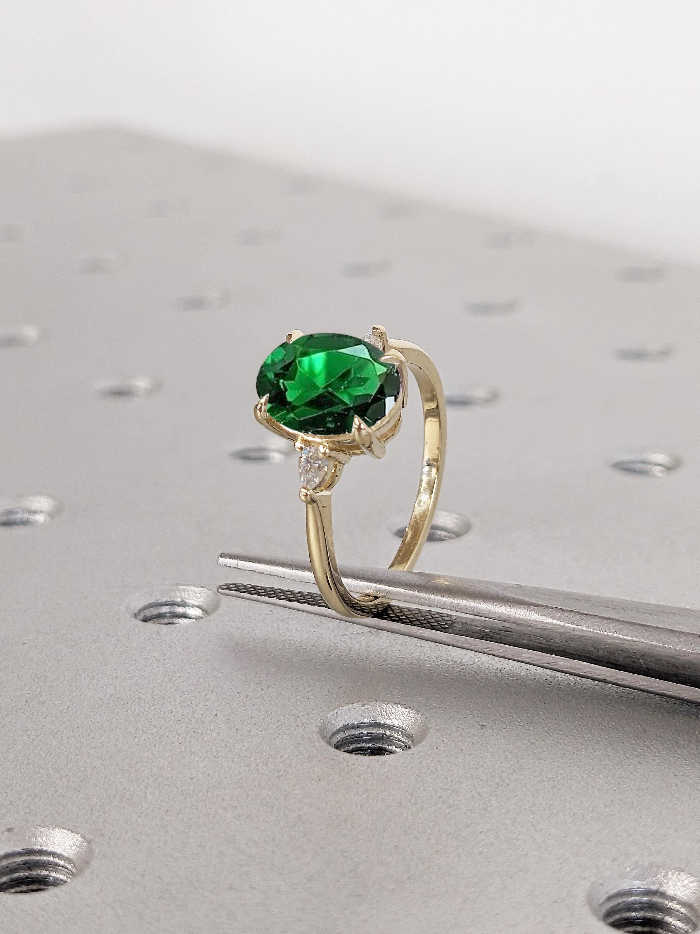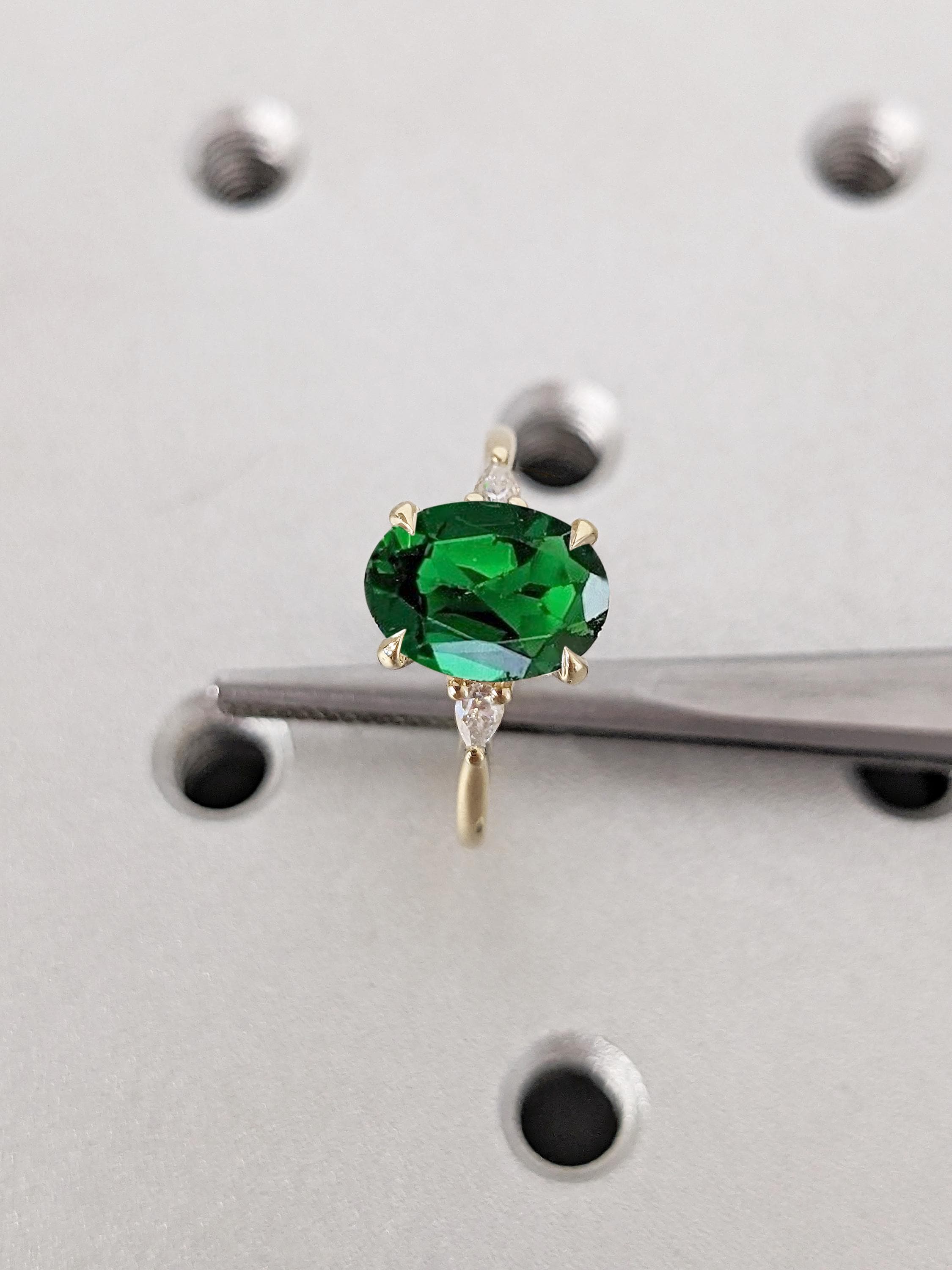 This stunning engagement ring features an oval cut Lab Emerald center stone, elegantly secured in a talon prong setting for a sleek and modern look. Flanking the center stone are two pear cut accent gems, available in your choice of Natural Diamonds, Lab Grown Diamonds, or Moissanites, adding extra brilliance and depth. The thoughtfully crafted design balances timeless sophistication with contemporary elegance, making it a perfect symbol of your enduring love.