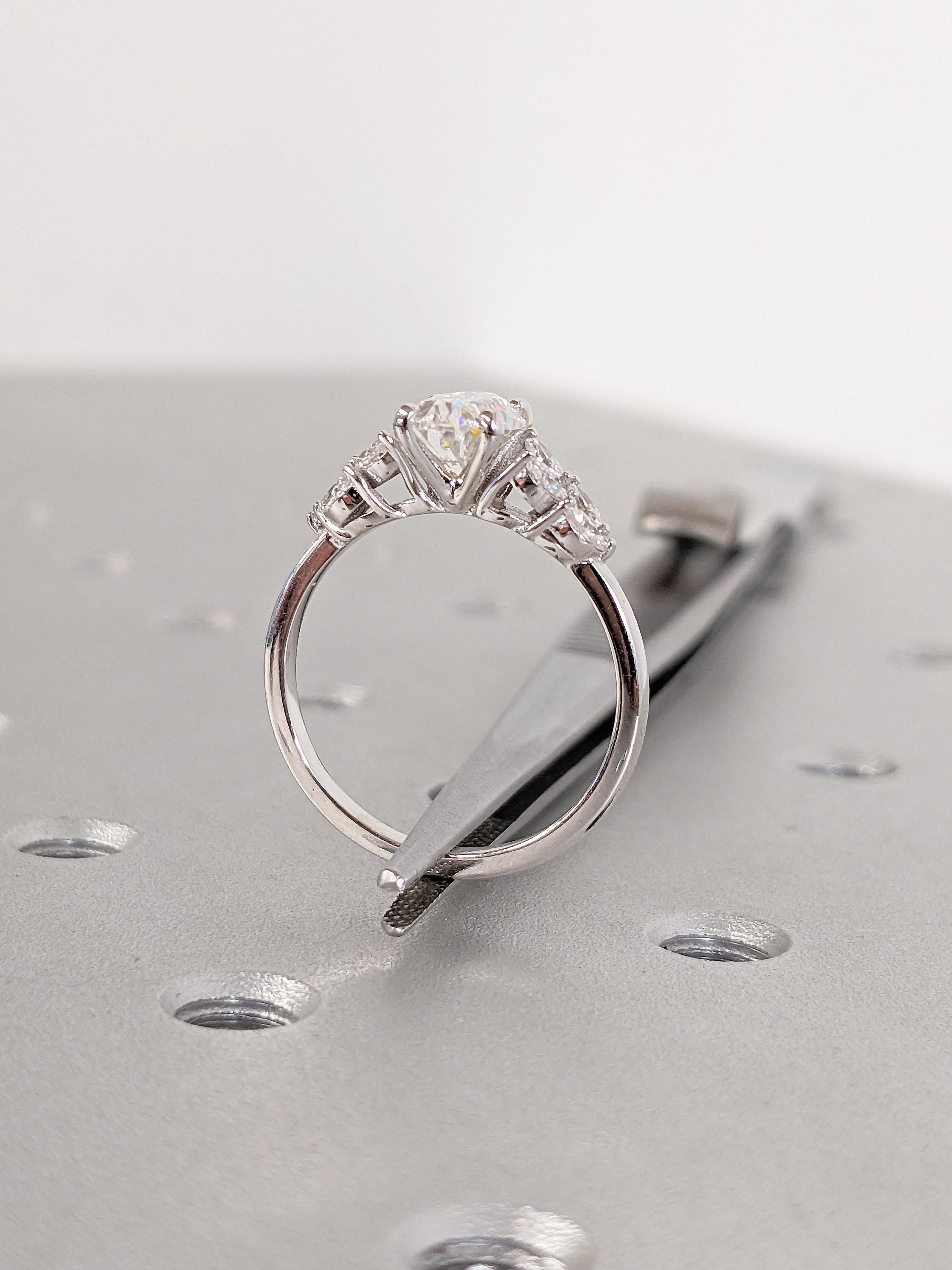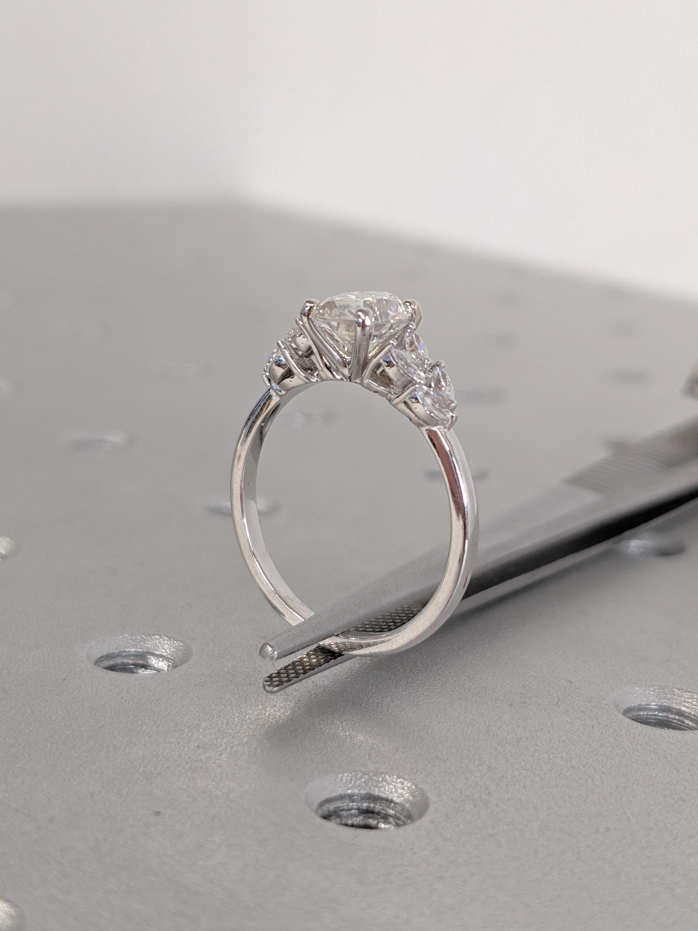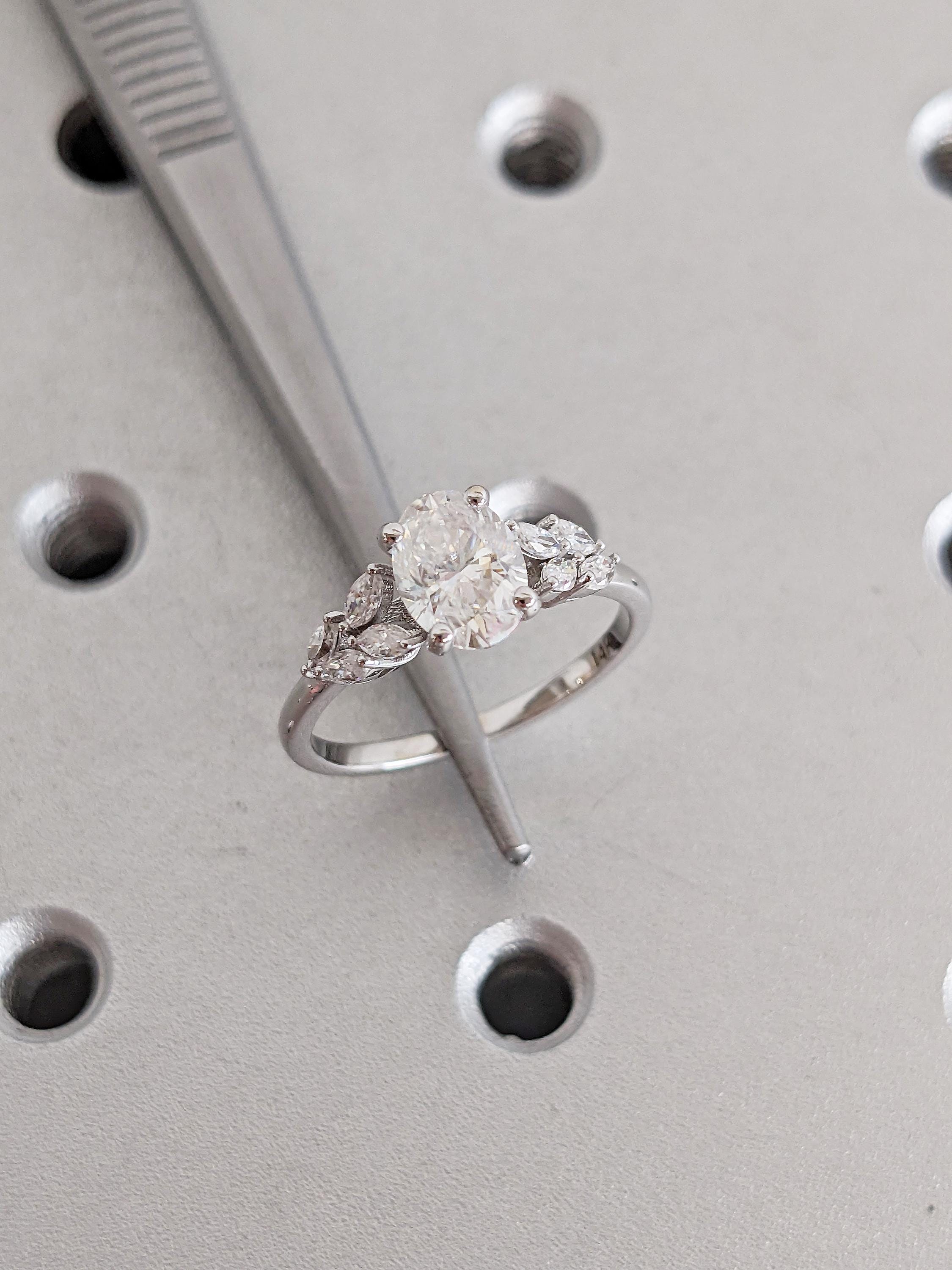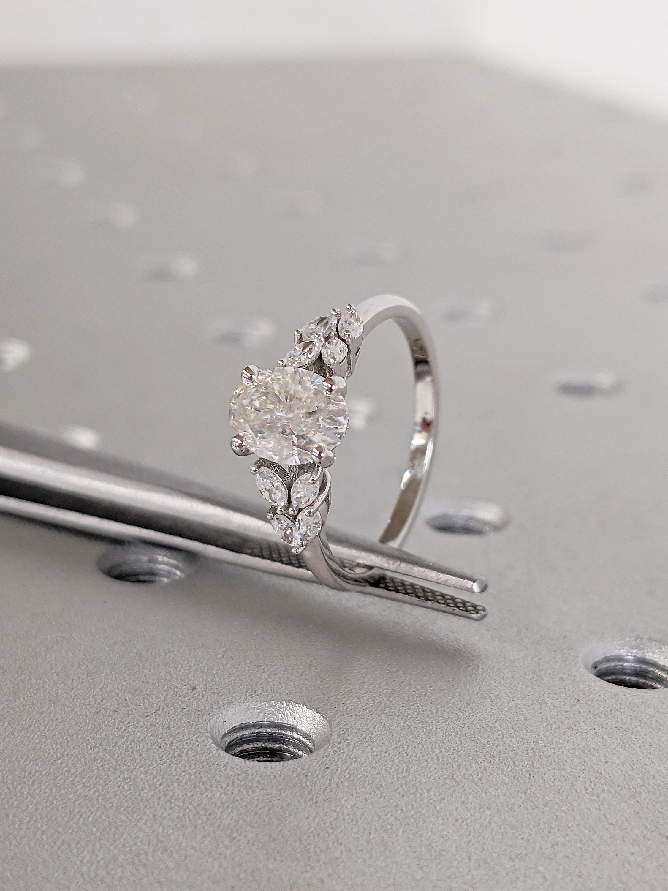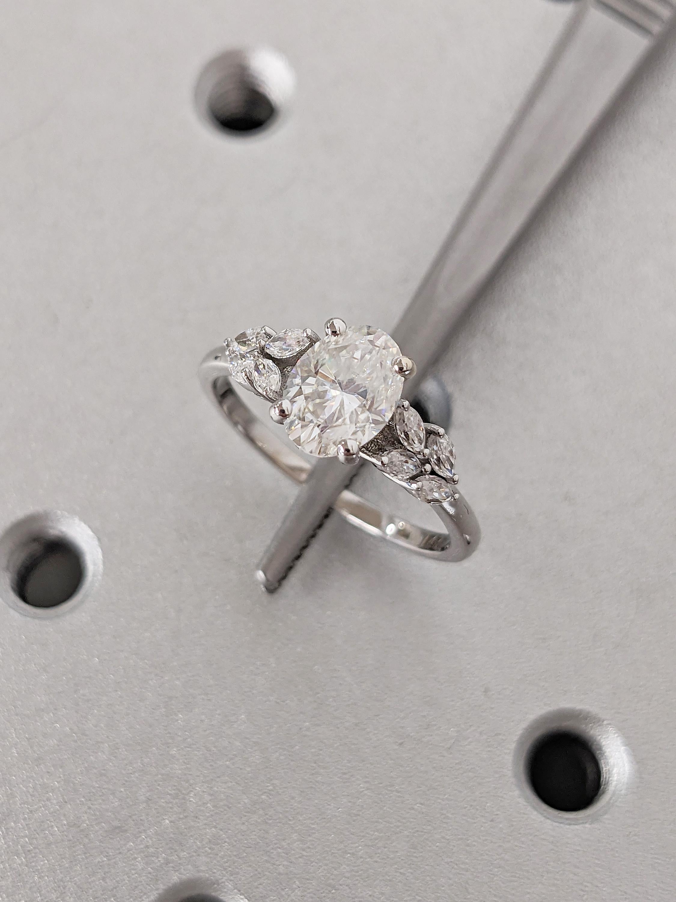 This elegant ring features a sparkling oval cut Lab Grown Diamond as its centerpiece, held by four prongs. Flanking the center stone are marquise cut Lab Grown Diamonds arranged in a leaf-like cluster design, adding a graceful, nature-inspired touch. Its timeless yet whimsical aesthetic makes it perfect for someone who loves a romantic and refined look.